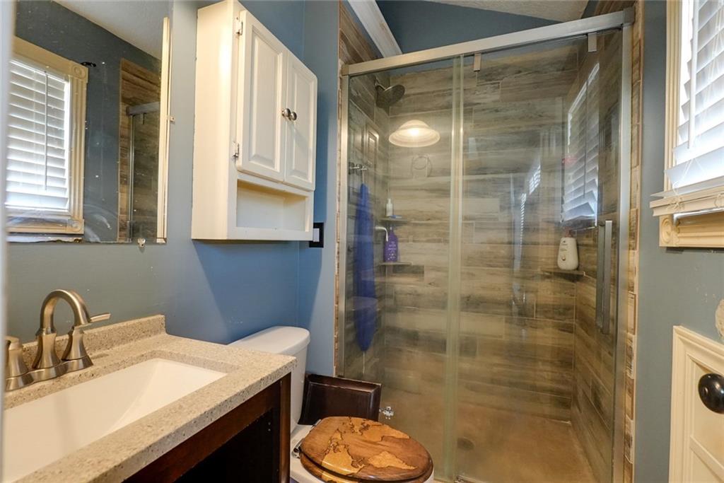 Bathroom featuring vanity, healthy amount of natural light, and a stall shower