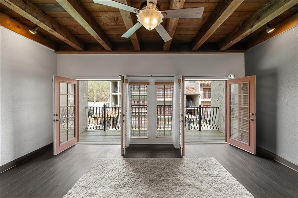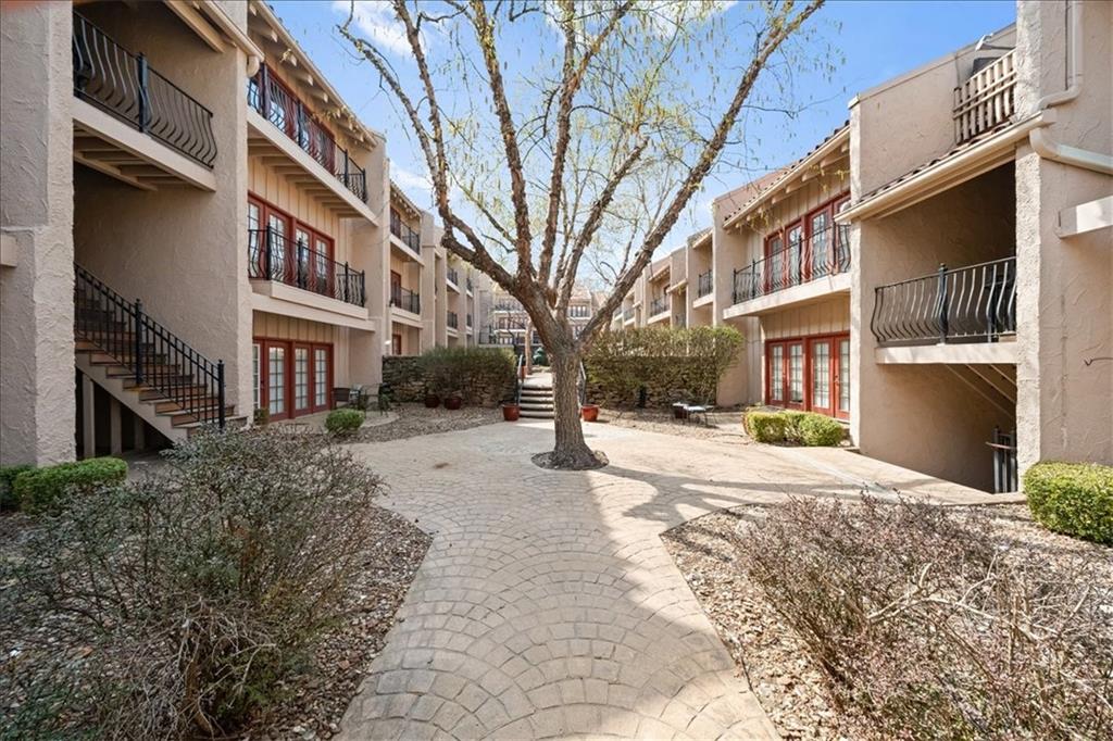 Bella Condominiums offers a lifestyle-focused living experience just moments from the Country Club Plaza. This charming Spanish-style community is centered around a resort-style pool, creating a relaxed, low-maintenance setting in a highly desirable location. This second-floor unit features true single-level living with a blend of character and thoughtful updates throughout. Interior highlights include exposed beams, wood floors, and an electric fireplace that anchors the main living space. The updated kitchen is equipped with modern finishes, ample cabinetry, and all appliances remain, including the in-unit washer/dryer combo. A standout feature of the home is the double French door entry leading to a covered deck with views overlooking the community pool—offering a seamless extension of the living space and a great spot to unwind. The unit includes two bedrooms with flexible use, along with an updated bathroom featuring quality finishes. One gated off-street parking space is included. Residents of Bella enjoy secured access and amenities such as a clubhouse, fitness center, poolside entertaining areas, and maintained grounds—ideal for a lock-and-leave lifestyle. Move-in ready and perfectly positioned near premier shopping, dining, and entertainment, this is an excellent opportunity to enjoy comfortable, convenient living near the Plaza.