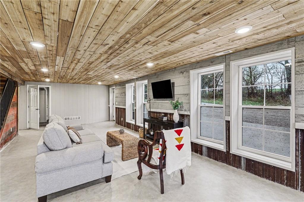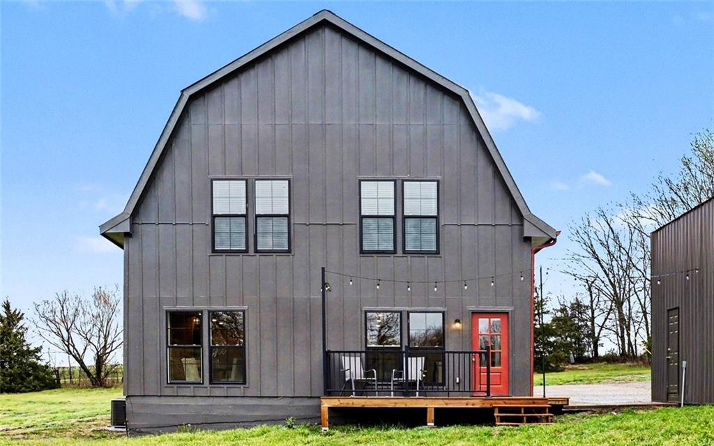 Experience the perfect marriage of turn-of-the-century character and cutting-edge luxury in this stunning 1900 barn conversion! Situated on 4.75 private acres, a half-hour from KC International airport, this three-story masterpiece has been meticulously reimagined into a sophisticated four-bedroom, five-bathroom retreat that defines "one of a kind." The main level anchors the home with a chef’s dream kitchen. Designed for both high-function and high-style with premium GE Café appliances and professional-grade finishes. With warm pine accents that nod to the structure's historic roots, an expansive layout flows effortlessly into the first of two distinct living areas. Ascend to the second floor to find a spectacular lofted great room. This massive secondary living space is the ultimate "game-day" destination, complete with a dedicated wet bar and a layout designed for large-scale entertaining or quiet relaxation. The primary suite is a masterclass in convenience and comfort, offering dual walk-in closets and integrated secondary washer/dryer hookups, ensuring laundry day is effortless. Spa-like finishes that create a true sanctuary. The beauty of the 4.75-acre lot is pulled indoors through thoughtful design, but the outdoor features are equally impressive. After a day exploring the grounds, use the outdoor shower to rinse off while overlooking the serene pond—perfect for keeping both owners and pets clean. A 42x30 outbuilding provides ample space for a workshop, studio, or equipment storage. This isn't just a home; it's a piece of history updated for the modern connoisseur with Smithville Lake, shopping and dining less than 20 minutes down the road. Schedule your private tour today to experience the scale and craftsmanship of this rural luxury estate!