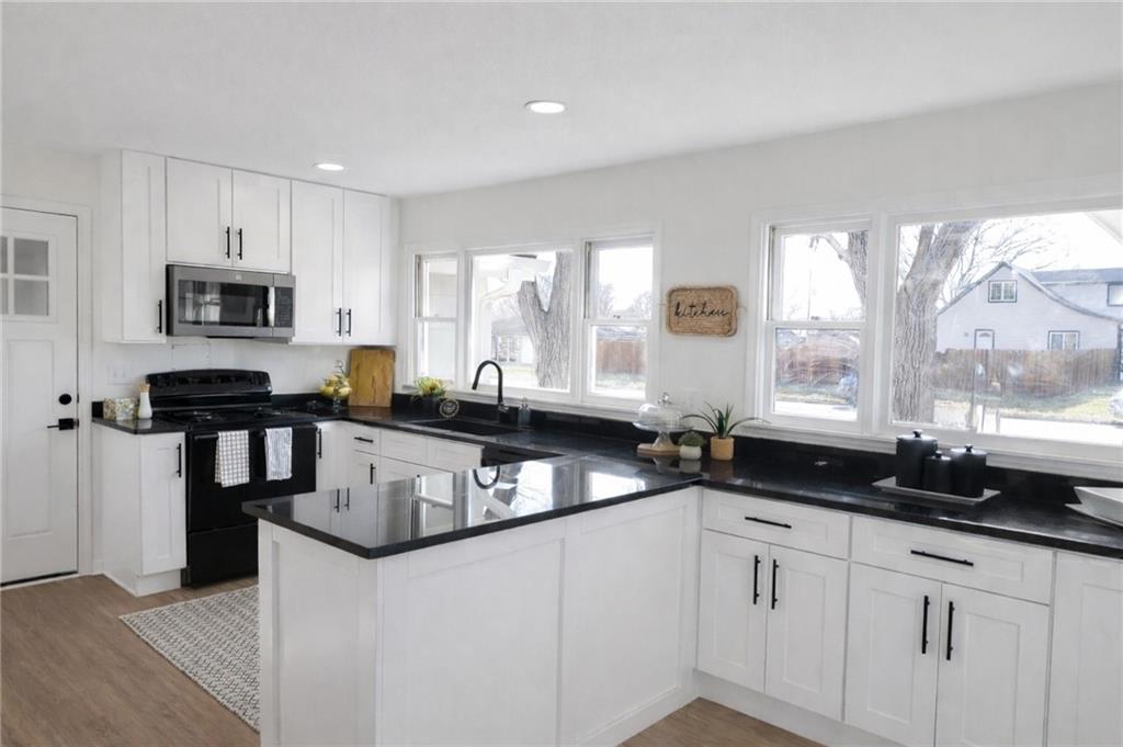 Kitchen featuring black electric range, white cabinetry, a peninsula, stainless steel microwave, and dark stone countertops