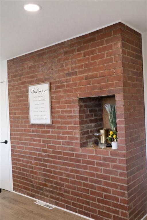 Detailed view of wood finished floors, brick wall, and recessed lighting