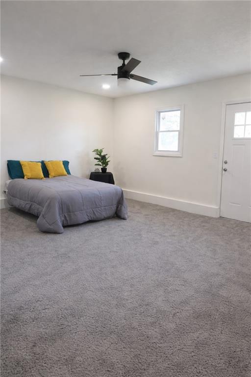 Bedroom featuring a ceiling fan and carpet