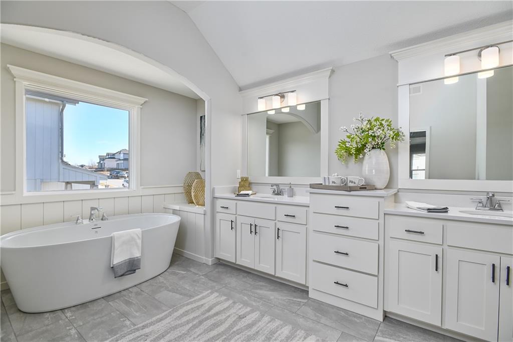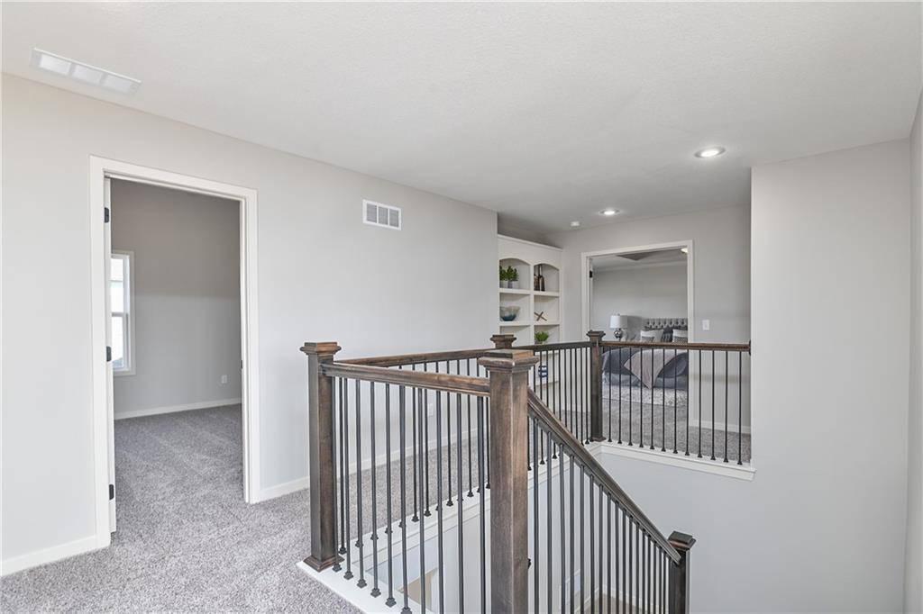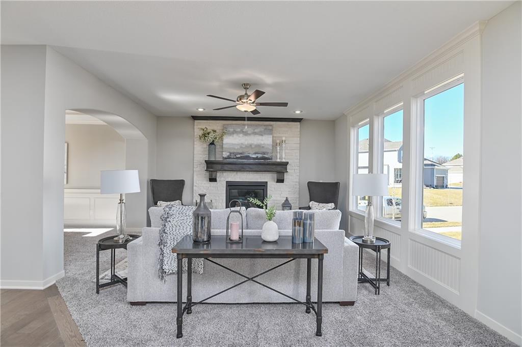 The Levi II offers an exceptional blend of space, style, and functionality with expanded square footage and upgraded finishes throughout. The enlarged kitchen and breakfast area feature custom cabinetry, granite countertops, a large center island with seating, tile backsplash, upgraded faucet, walk-in pantry, and stainless steel appliances—perfect for everyday living and entertaining. Hardwood floors extend through the entry, kitchen, dining room, family room, breakfast area, and mud room. A versatile main-level flex room with closet and wood-paneled ceiling provides ideal space for a home office or fifth bedroom. The mud room includes a boot bench and entry closet, while the great room is anchored by a stone direct-vent fireplace with wood mantle. The primary suite is a true retreat, offering a separate sitting area, vaulted ceiling, expanded walk-in closet, and spa-like bath with granite countertops, freestanding soaking tub, and walk-in tile shower. All bedrooms feature vaulted ceilings. Upstairs highlights include a loft area with built-in bookshelves, a hallway window for added natural light, and a spacious laundry room with custom cabinetry and granite countertop. Tile flooring is featured in all bathrooms and the laundry room, with Berber carpet on the stairs. Enjoy outdoor living on the covered patio with a full sprinkler system. Located in Prairie Farms, residents enjoy neighborhood amenities including walking trails, pool, playground, and convenient walking distance to Lake Olathe.