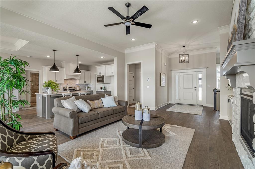 Discover The Payton, a masterfully designed floor plan by Prieb Homes that offers the perfect blend of luxury, comfort, and modern functionality. Located in the highly sought-after Prairie Farms community, this home features 4 spacious bedrooms, 3 full bathrooms, and a 3-car garage across an expansive 3,121 sq. ft. layout. A chef’s dream featuring a large center island, granite countertops, custom cabinetry with soft-close drawers, a walk-in pantry, and stainless steel appliances. A wide-open space centered around a cozy fireplace, flooded with natural light from a wall of windows. A private retreat with vaulted ceilings, double vanities, a tiled walk-in shower, and a massive closet that conveniently connects to the laundry room. Two additional bedrooms and a full bath are located on the main floor, perfect for guests or a home office. The finished lower level boasts a massive rec room that walks out to a patio, plus a 4th bedroom and full bath. Significant unfinished space for storage. Living in Prairie Farms means enjoying top-tier amenities including a swimming pool with a "Signature Barn" cabana, a play area, and miles of walking trails. You are just steps away from the newly renovated Lake Olathe, offering a swim beach, marina, and aqua park. Located in the award-winning Olathe School District (Clearwater Creek Elementary, Oregon Trail Middle, and Olathe West High), this is more than a home—it's a lifestyle. Located in the new phase of Prairie Farms