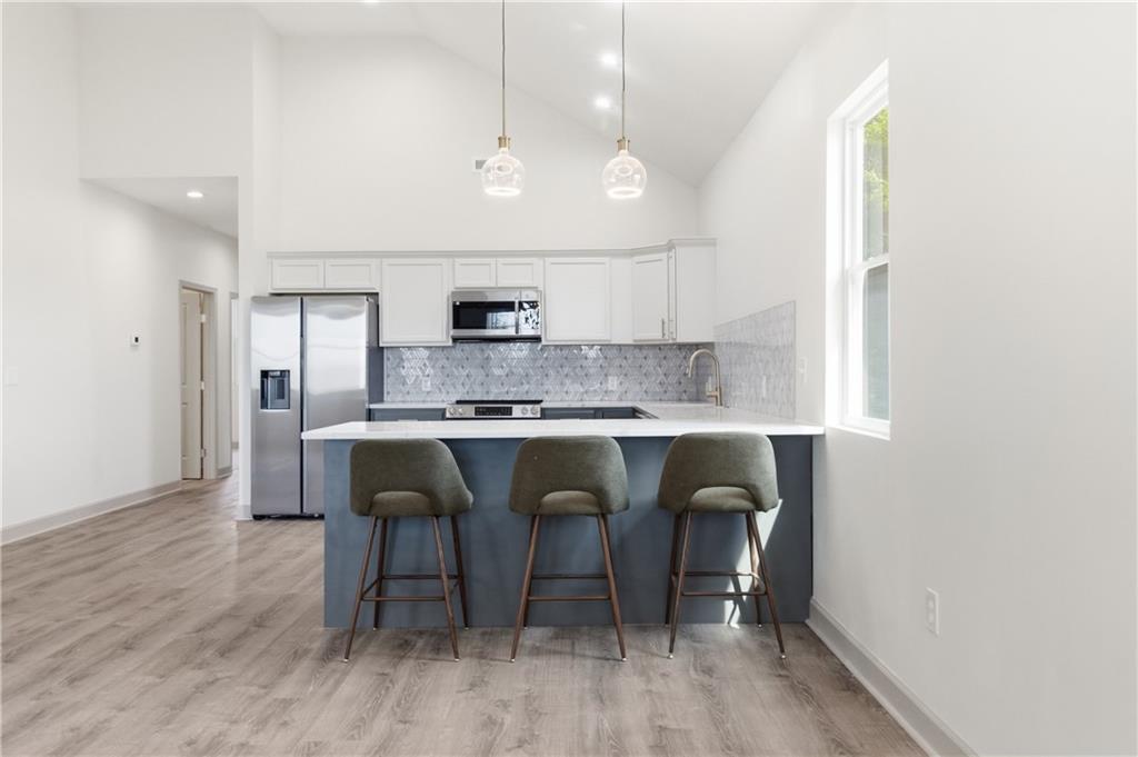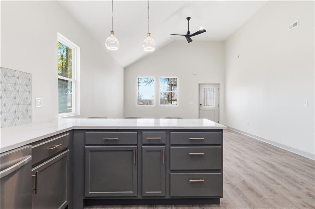 Welcome to this stunning brand-new construction home offering over 1,800 square feet of thoughtfully designed living space. This 3-bedroom, 2-bath home features a bright and open layout, highlighted by a spacious living room with impressive 16-foot vaulted ceilings and abundant natural light, while the remainder of the home offers comfortable 9-foot ceilings throughout. The modern kitchen is a true centerpiece, complete with sleek quartz countertops, a stylish marble backsplash, stainless steel appliances, and an oversized pantry providing ample storage. Durable and attractive LVP flooring flows seamlessly through the living, dining, and kitchen areas. The private primary suite serves as a relaxing retreat, featuring a spa-like bathroom with a double vanity, quartz countertops, and a beautifully tiled walk-in shower. The suite also includes a walk-in closet with built-in shelving for optimal organization. Each bedroom is equipped with ceiling fans for added comfort. Step outside to a brand-new deck, perfect for relaxing or entertaining. This is the one you’ve been waiting for—don’t let it slip away!