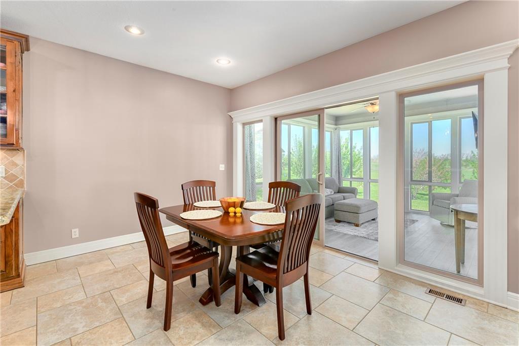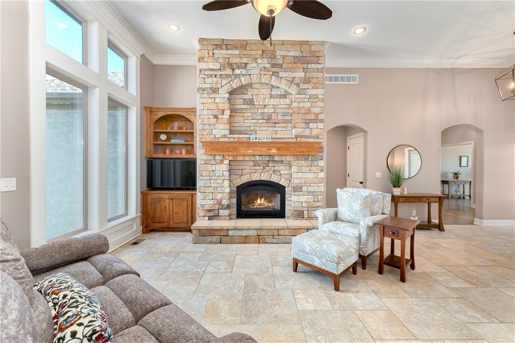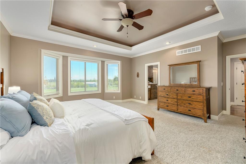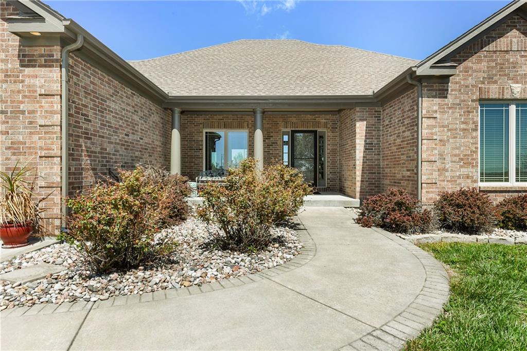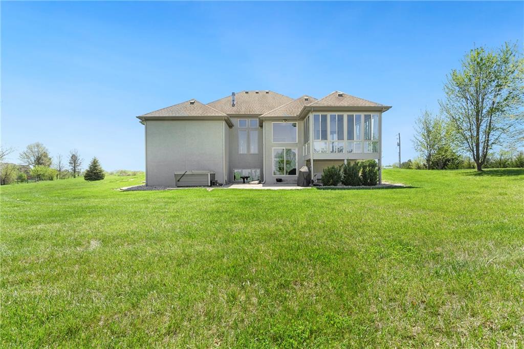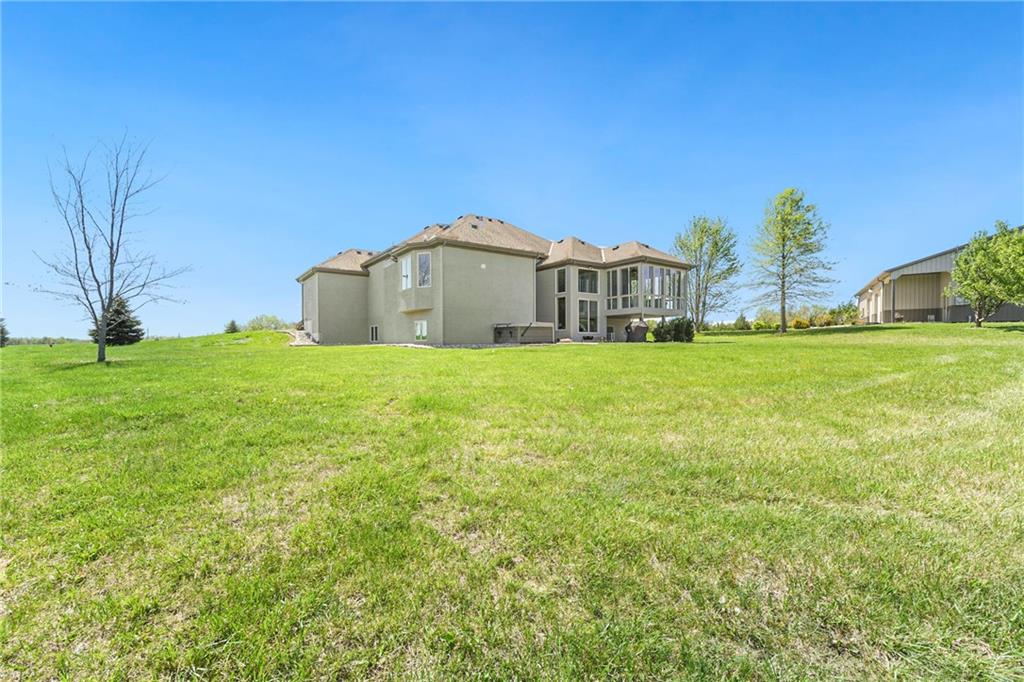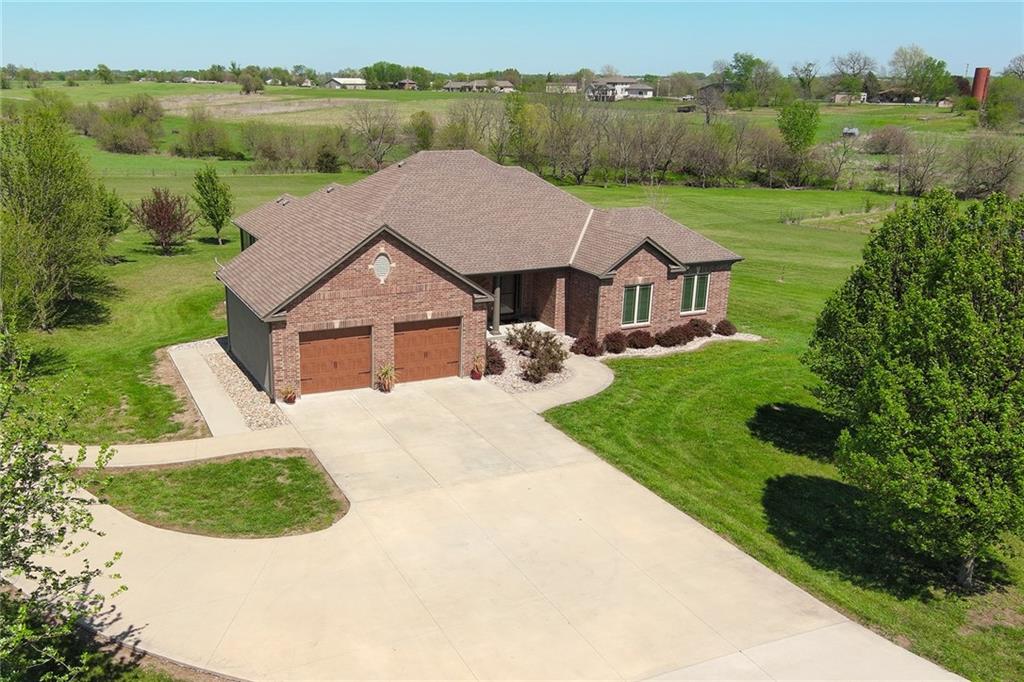 This stunning custom-built all-brick ranch sits majestically atop a hill, offering breathtaking views and the perfect blend of luxury and functionality. Designed for true main-level living, the home features three spacious bedrooms on the main floor. Two secondary bedrooms provide excellent flexibility for guests, family, or a home office—complete with abundant natural light and beautiful wood flooring. The expansive primary suite is a true retreat, easily accommodating large furniture and complemented by a spa-like ensuite featuring a walk-in shower, jetted soaking tub, double vanities, and an impressive walk-in closet. Enjoy both formal and casual living with a dedicated dining room and an open-concept kitchen equipped with a cooktop, granite countertops, stained wood cabinetry, and a large pantry. The kitchen flows seamlessly into the great room, where a striking stone fireplace and walls of windows showcase the property’s scenic surroundings. An enclosed four-season sunroom extends the living space, perfect for relaxing or entertaining year-round. Additional main-level conveniences include a drop zone off the garage, and a second laundry option in the pantry. The partially finished walk-out basement adds even more versatility with a fourth bedroom, full bathroom, family room, and a second laundry area. There is ample opportunity to expand, with space for two additional bedrooms and a fourth bathroom—featuring daylight windows for added comfort and value. Outside, the property truly shines with approximately 12 acres of agricultural land, plus an additional 2 acres surrounding the home. A massive 2,900 sq ft utility building includes solar power that saves tons on utility bills, ideal for a variety of uses. The property is fully fenced and secured with a grand electric entry gate. Enjoy the best of both worlds—peaceful country living with a prime location offering convenient access to everything the Kansas City area has to offer.