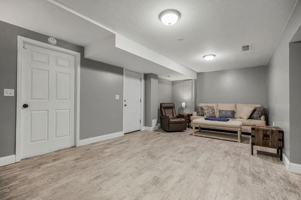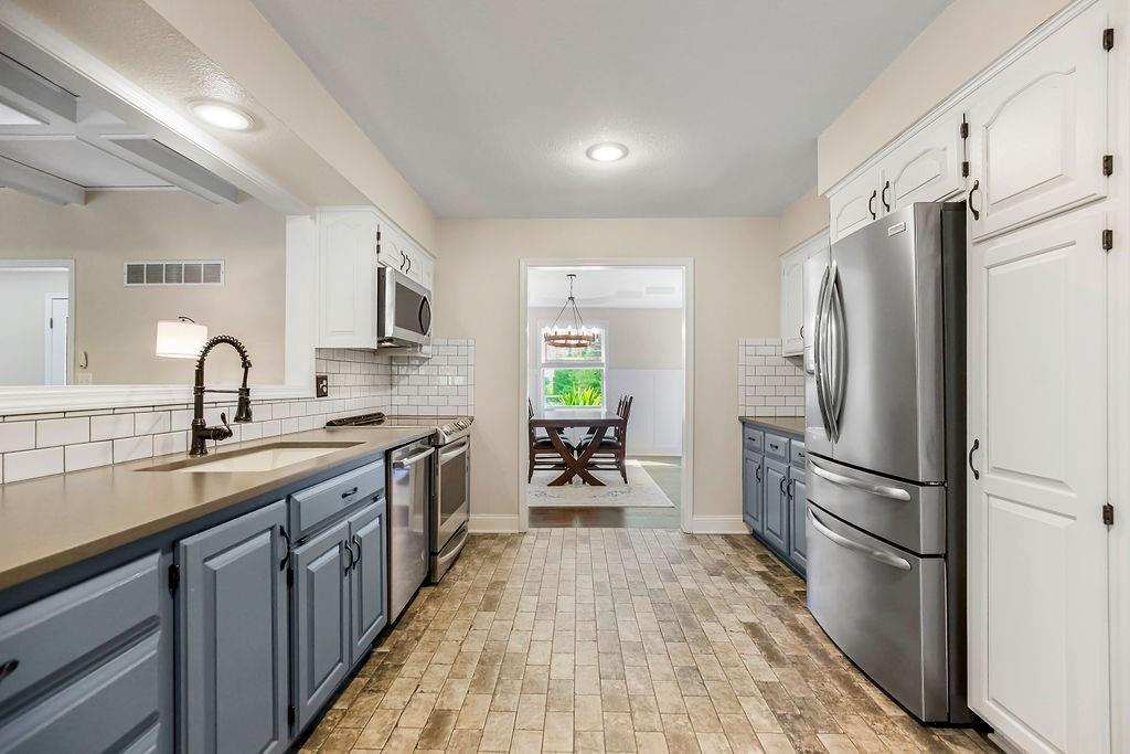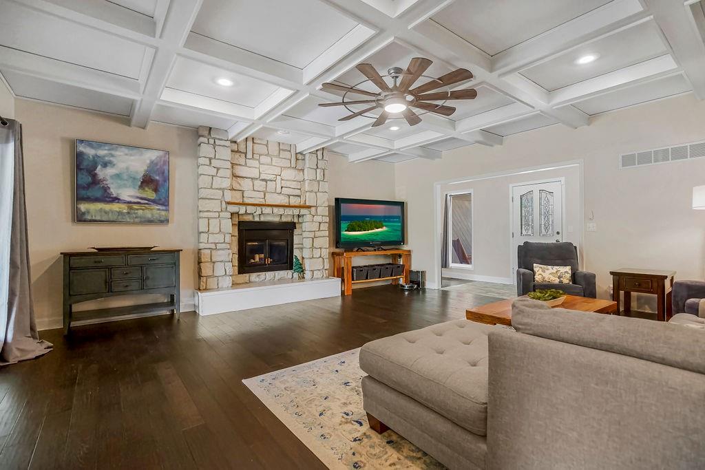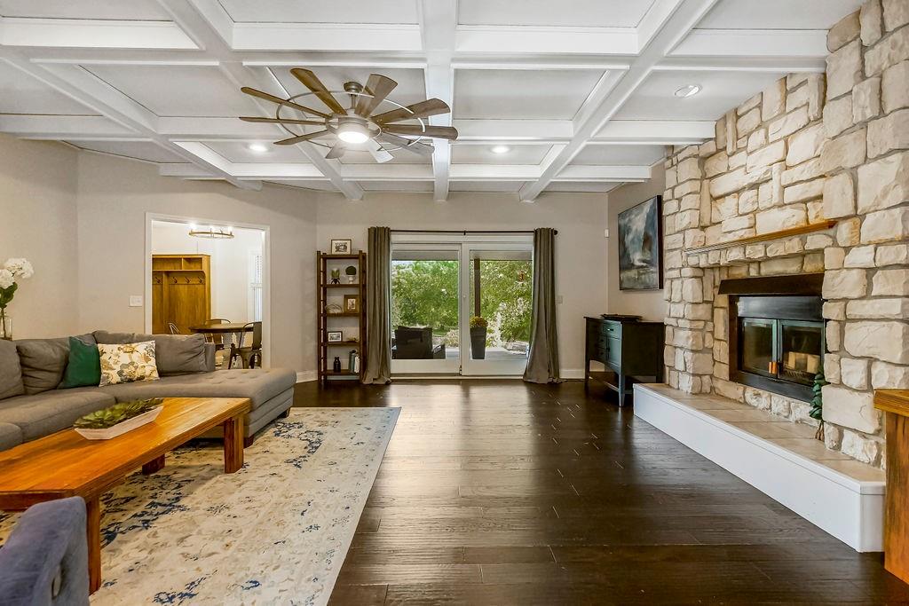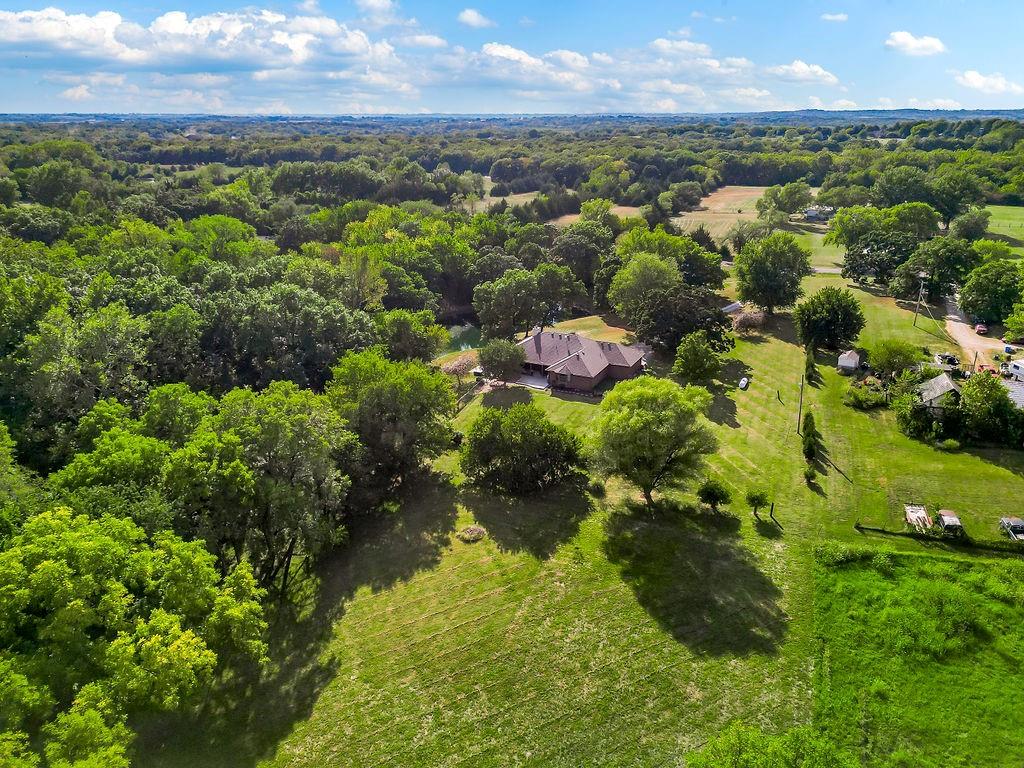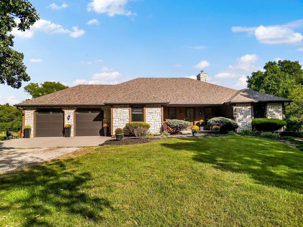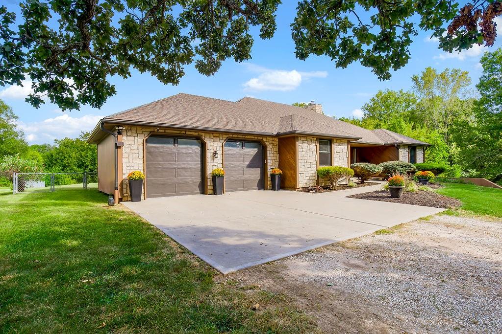 With over $50,000 in updates over the past several years and priced $15,000 UNDER a November 2025 appraisal value, this exquisitely renovated true ranch home set on 17.35 acres is a DREAM! Located within the Basehor-Linwood School District, this property is a nature lover's paradise, featuring abundant wildlife, two stocked ponds, scenic trails, and a creek with a bridge. The main level showcases a formal dining room, a spacious living room with beamed ceilings and a wood-burning fireplace, an updated kitchen with quartz countertops, new backsplash, updated flooring, new stainless-steel appliances, a pantry, and a cozy breakfast nook. Adjacent to the kitchen is the master suite with a walk-in closet, dual vanities, shower, and laundry room. For added privacy, there are two additional bedrooms and a full updated bath on the opposite side of the house. The lower level includes a family room, 4th bedroom, and half bath, with access to the garage/workshop, making it ideal for potential separate living quarters. The lower tandem garage workshop is equipped with AC and can accommodate 3 cars (additional 2-car garage on main level), with ample storage space available. The fenced backyard features a generously sized covered patio perfect for entertaining, relaxing in the hot tub, and enjoying the company of hummingbirds. With custom finishes throughout and recent updates that include a freshly painted interior, scraped ceilings, flooring, kitchen renovations, fixtures, and electrical/lighting, this home offers an absolutely tranquil setting just outside the city limits, where you can revel in the soothing sounds of nature.