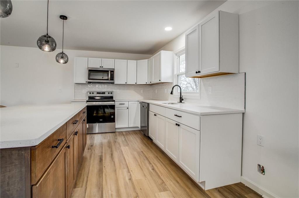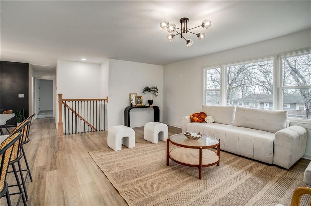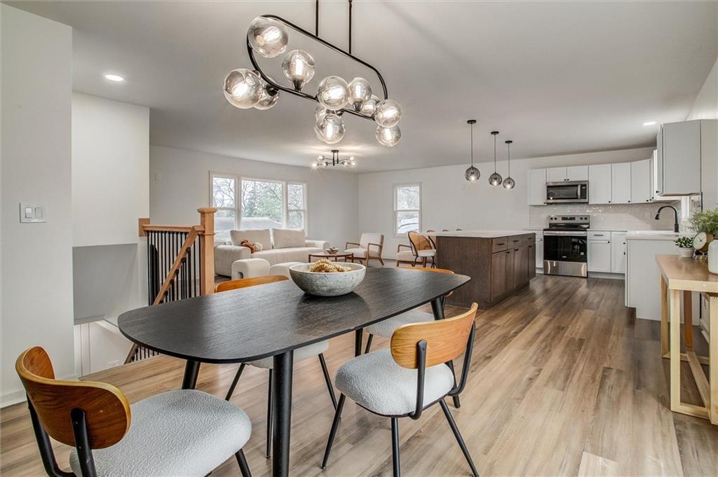 Stunning Full Rehab in Liberty's Sought-After Greene Hills! Welcome to 1508 Nancy Lane — a beautifully reimagined 3-bedroom, 3-bath home where timeless charm meets modern luxury. Thoughtfully renovated from top to bottom, this 2,050 sq ft split-level sits on a generous .34-acre lot and showcases high-end finishes throughout. Step inside to a bright, open-concept main level featuring luxury vinyl plank flooring, statement globe lighting, and a seamless flow between the living, dining, and kitchen areas — perfect for entertaining. The chef-inspired kitchen boasts white shaker cabinetry, quartz countertops, a contrasting dark wood island with bar seating, stainless steel appliances, subway tile backsplash, and sleek matte black hardware. Sliding glass doors off the dining area lead to a brand new deck overlooking the spacious backyard. The primary suite is a true retreat, complete with plush carpet, a ceiling fan, and a spa-like en-suite featuring a stunning double vanity with quartz tops, dual arched mirrors, modern globe sconces, and gorgeous green decorative tile in the walk-in shower. The second full bath impresses with floor-to-ceiling marble-look tile, a tub/shower combo with rain head, and chic matte black fixtures throughout. The finished lower level adds 725 sq ft of flexible living space with a private bedroom featuring its own stylish bath — ideal for guests, a home office, or multigenerational living. Additional highlights include a 2-car built-in garage, updated windows, fresh interior and exterior paint, and all-new finishes from start to finish. Located in the established Greene Hills neighborhood with easy access to Liberty's top shopping, dining, and amenities — this one is truly move-in ready. Come see it before it's gone!