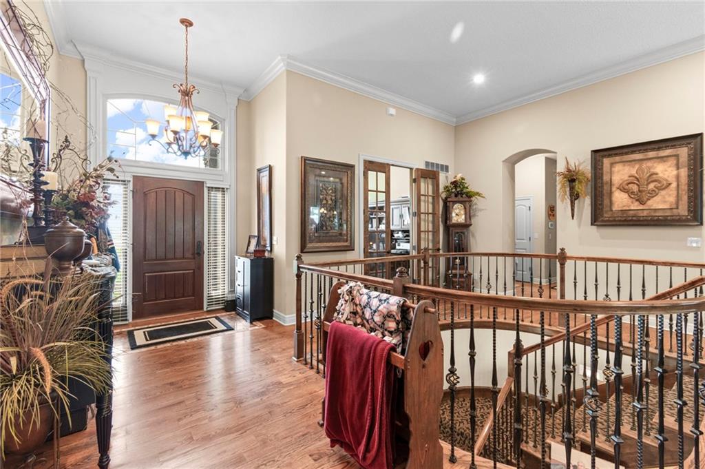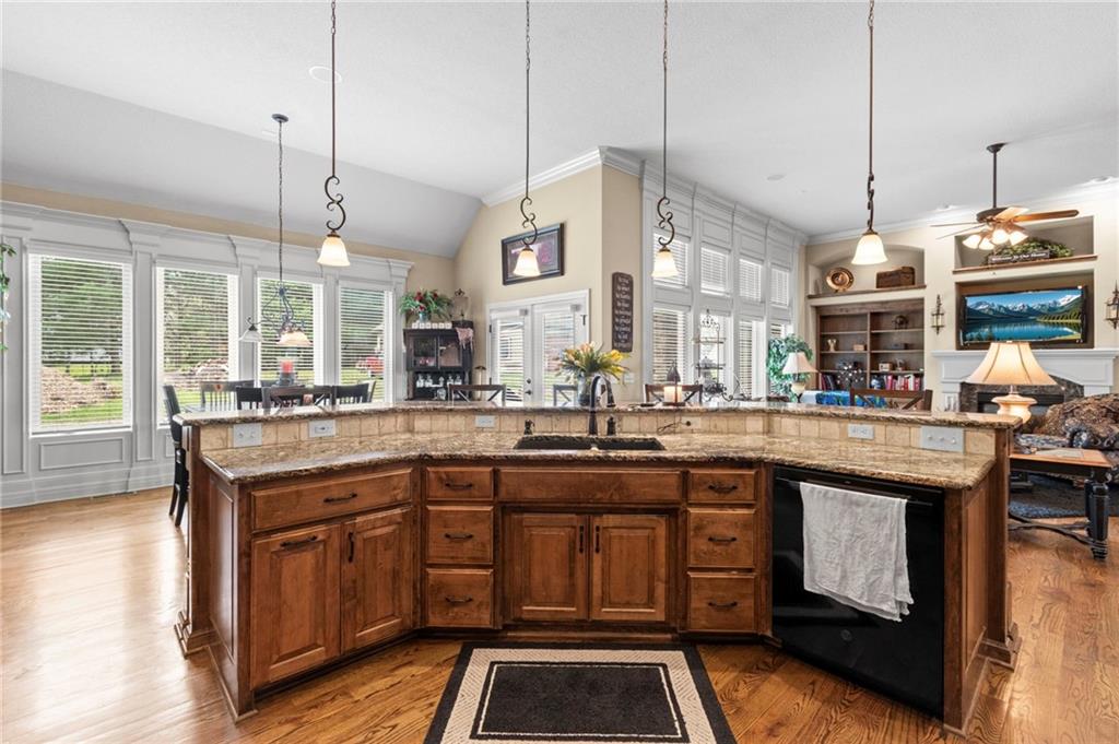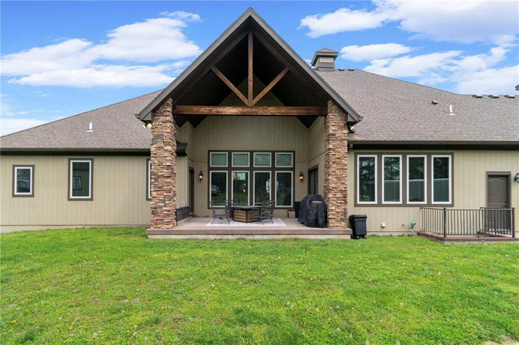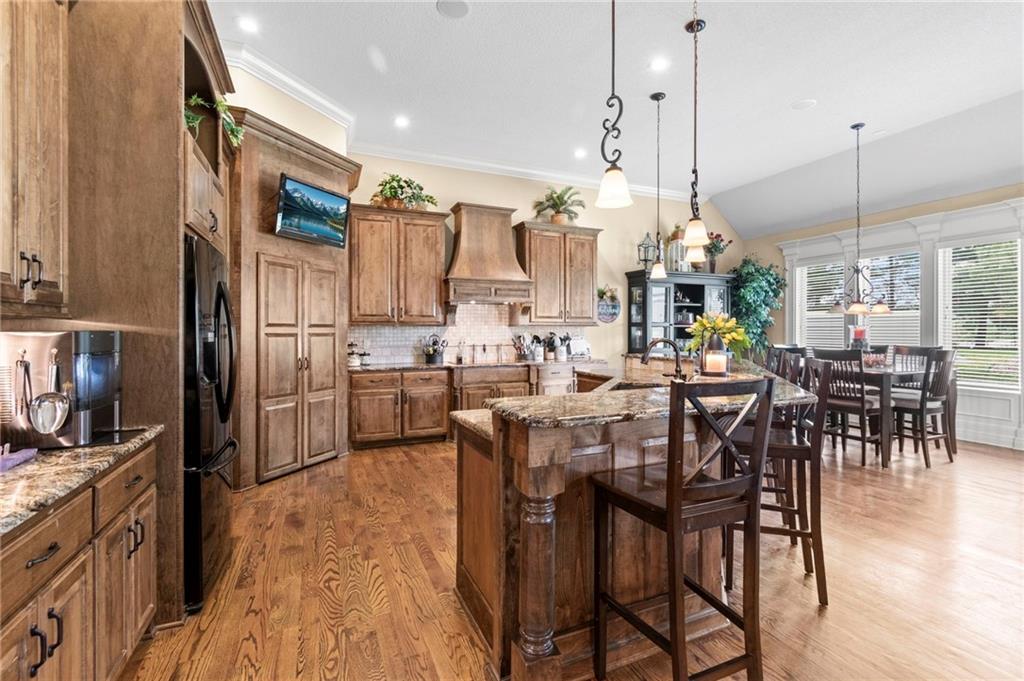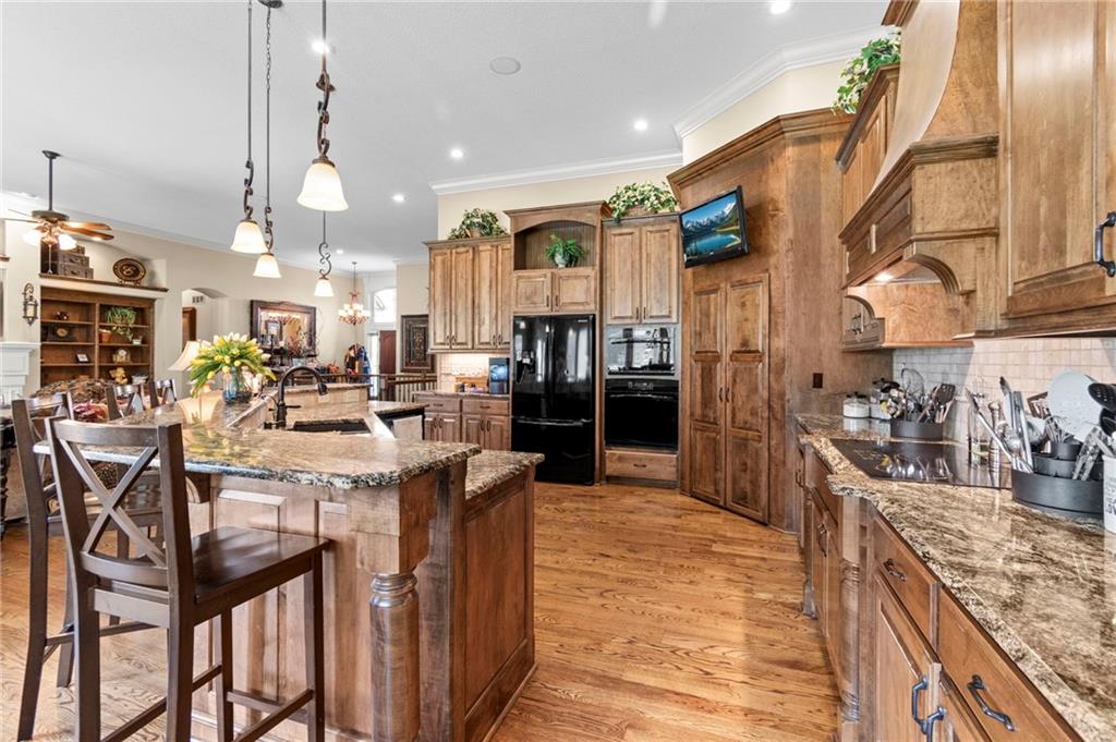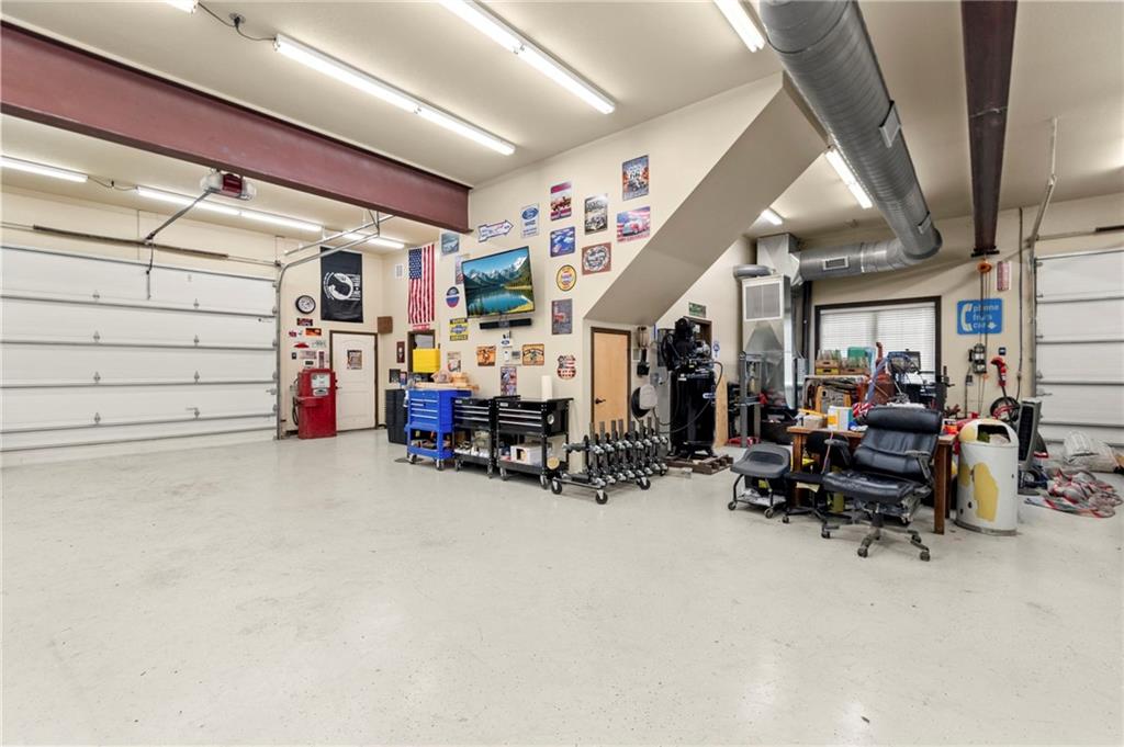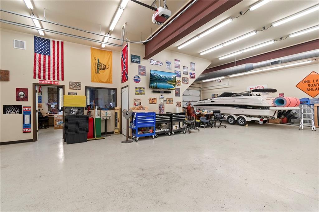 Set on nearly five acres just outside of town, this Kearney estate checks every box and then adds a few you didn’t know you needed. Inside, the main living space opens into a layout that feels open and intentional. The living room, dining area, and kitchen flow together seamlessly, anchored by hardwood floors and natural light. A fireplace with custom built-ins adds a focal point.The kitchen is built for real life and gatherings. Granite countertops, custom cabinetry, double wall ovens, and an oversized island make prep and hosting easy. A walk-in pantry keeps everything tucked away. The main level offers flexibility with a front room that can serve as a bedroom, formal dining space, or office. Two additional bedrooms share a well-designed bath with separate vanity areas. The primary suite is set apart, featuring a large walk-in closet and spa-like bath with soaking tub, tiled shower with dual heads, and double vanity. Laundry and a half bath complete the level. Downstairs, the finished lower level is built for hosting. A full wet bar with a large island opens into a second living area with its own fireplace. A private bedroom and bath make it ideal for guests or multi-generational living, along with a half bath and flexible space for a gym, office, or sixth non-conforming bedroom. Storage is extensive, with a suspended slab design offering approximately 55x31 of storage space, plus an additional 21x11 area that also functions as a secure storm shelter. The six-car attached garage provides plenty of space, and the detached 50x60 shop adds even more with its own office, bathroom, car wash, and paint bay, plus an unfinished upper level. Built with intention, the home features structural beams for wide open spaces, twelve-foot ceilings on both levels, geothermal heating, and energy-efficient windows. Mineral rights convey with the property, including oil and water discovered during the geothermal process and registered with the Missouri Department of Natural Resources.