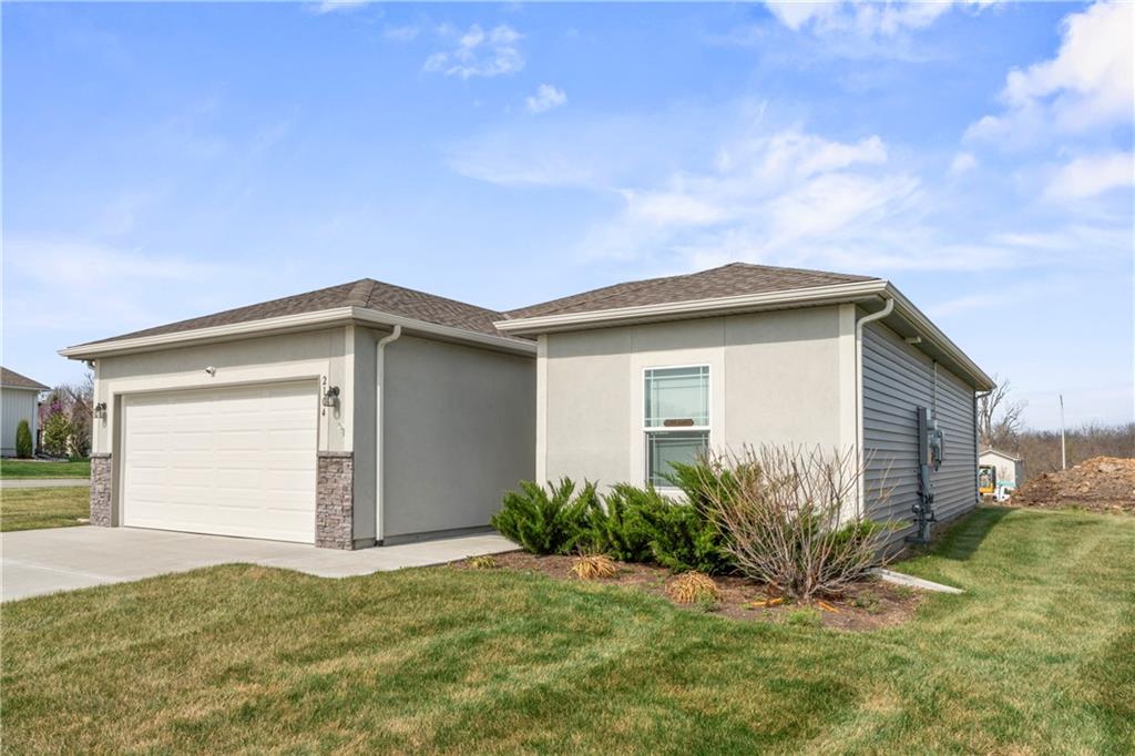 Welcome to 2104 Crestview Place in Raymore’s sought-after Alexander Creek 55+ maintenance-provided community! This nearly new ranch-style home offers the perfect blend of modern comfort, low-maintenance living, and energy efficiency. Built in 2023, this 2-bedroom, 2-bath home features an open-concept layout with a spacious great room that flows seamlessly into the kitchen and dining area ideal for everyday living and entertaining. The kitchen is equipped with granite countertops, a large island, pantry, and stainless steel appliances, all of which stay with the home including the washer and dryer. The primary suite offers a private retreat with a walk-in closet and en-suite bath featuring a double vanity and granite counters. Luxury vinyl plank flooring in main living areas provides durability and style, while neutral finishes throughout make this home truly move-in ready. What sets this home apart is the added value and efficiency: solar panels significantly reduce utility costs (averaging under $20/month), offering long-term savings that new construction often doesn’t include. Additional upgrades include security cameras for added peace of mind. Situated on a desirable corner lot with a sprinkler system already in place, this home also includes lawn maintenance and snow removal through the HOA making it ideal for a lock-and-leave lifestyle. Skip the wait and expense of new construction this home is better than new with appliances, upgrades, and immediate availability. Conveniently located near shopping, dining, and major highways, this is low-maintenance living at its best. Schedule your showing today!