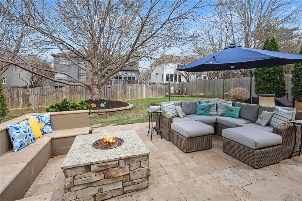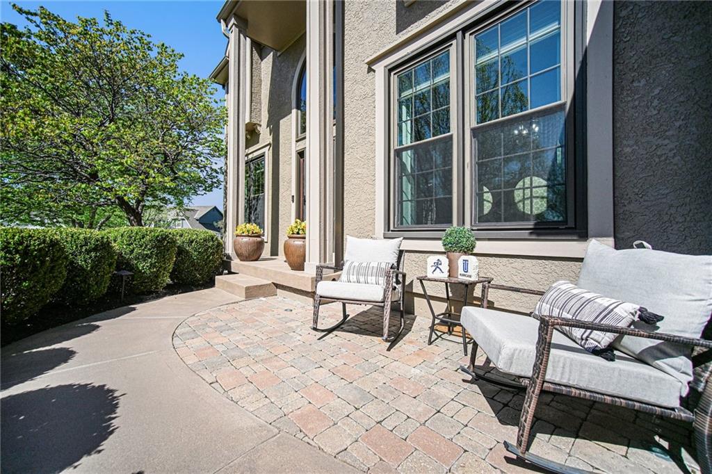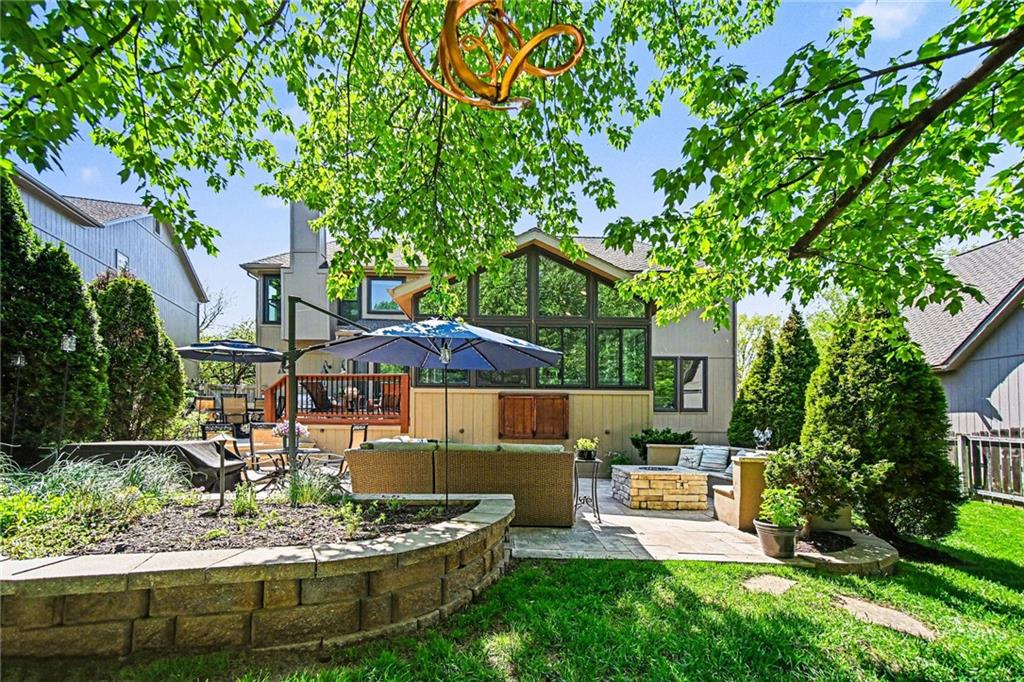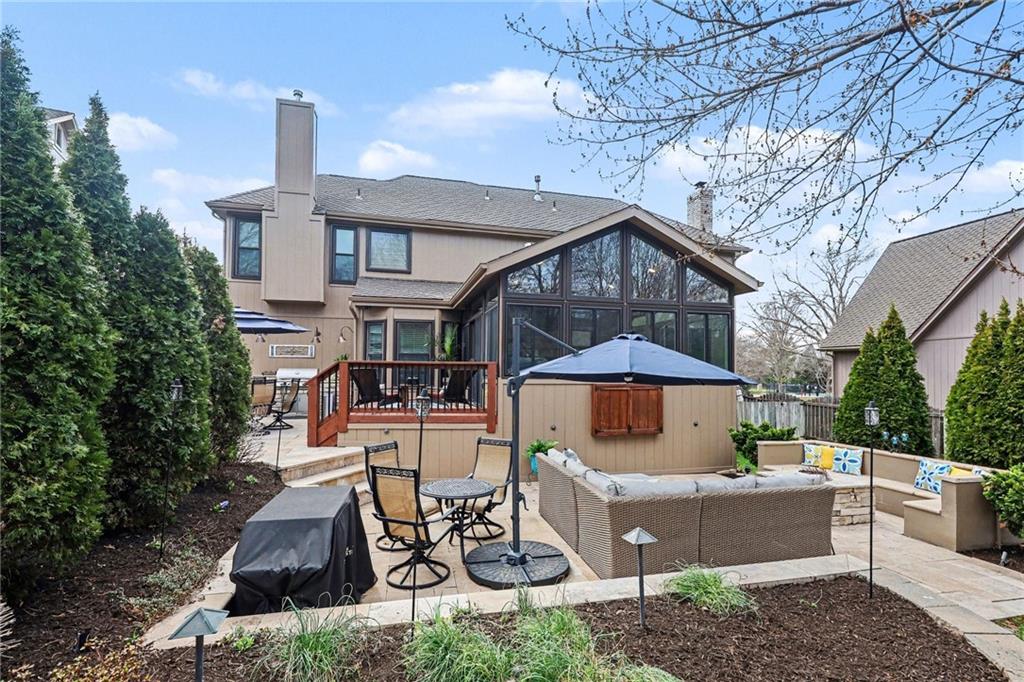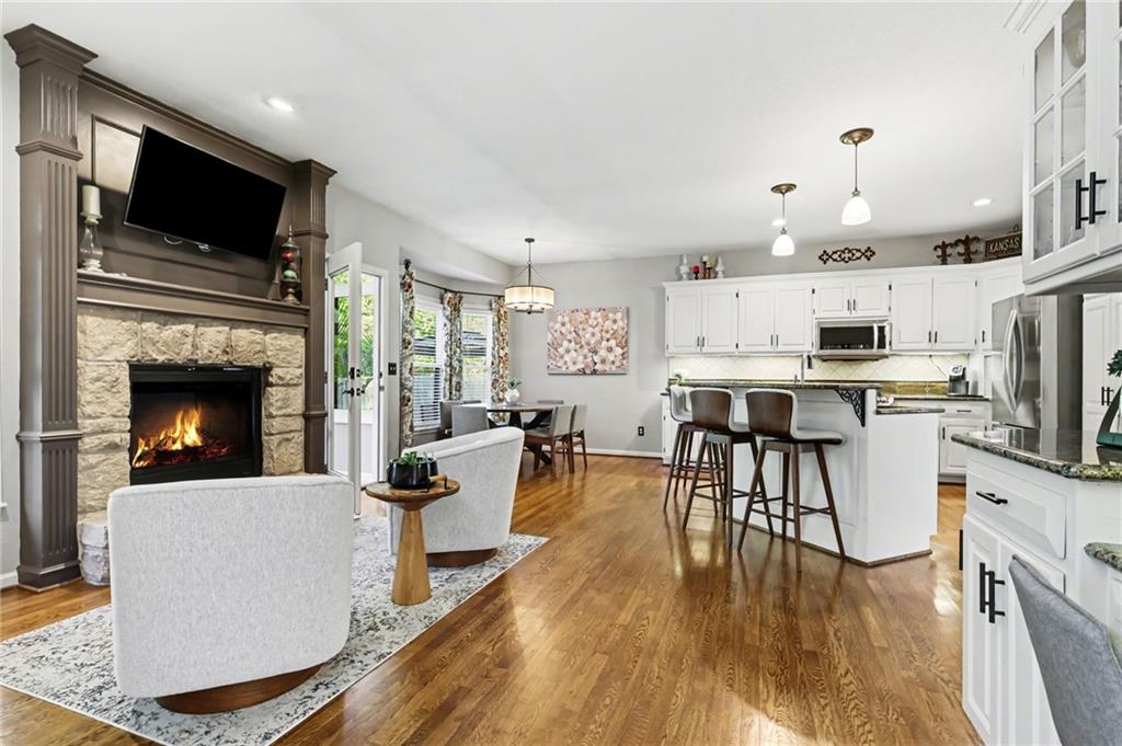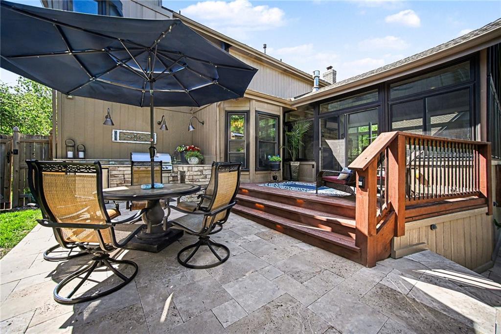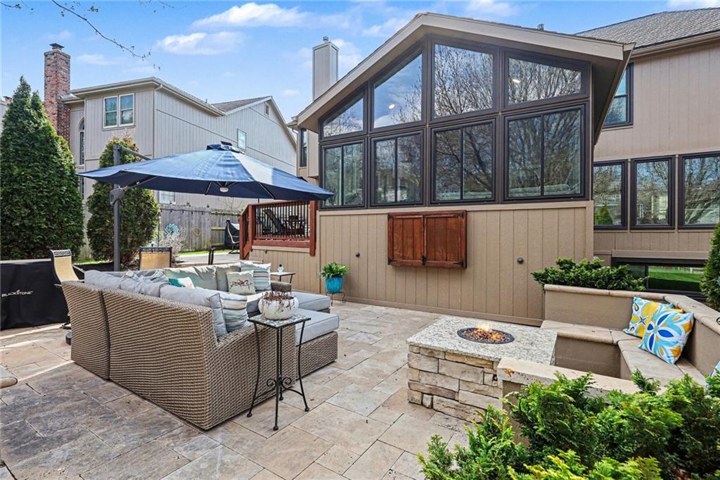 Stunning 2 Story home in Wynnewood! Well-maintained and beautifully updated throughout. Inviting two-story entry. Large great room with hardwood floors and a cozy fireplace. Formal living room and dining room. Beautiful kitchen and hearth room with a fireplace, hardwood floors, center island, stainless steel appliances, granite countertops, and a breakfast area. Amazing sun room off the kitchen/hearth room with a see-through stone fireplace. Huge primary suite with a sitting area and fireplace, one secondary bedroom with private bath, and two additional bedrooms with a Jack and Jill bath on the second floor. Finished lower level with a family room, great bar area, non-conforming bedroom/bonus room, and a full bath. The backyard is an entertainer's paradise, beginning with the sun room, leading to the deck, and a gorgeous custom travertine patio with an outdoor kitchen, fire pit, and an outdoor TV enclosure. NEW ROOF to be installed by closing! Three car tandem garage. Wonderful neighborhood amenities, including a pool. Great location in the highly-rated Blue Valley School District.
