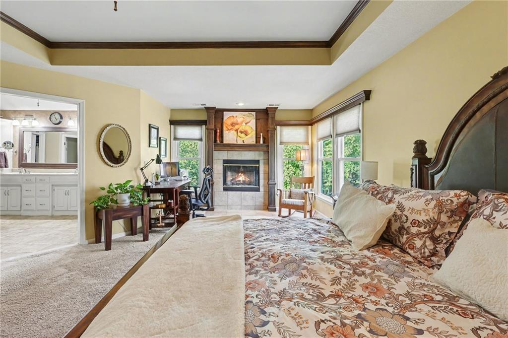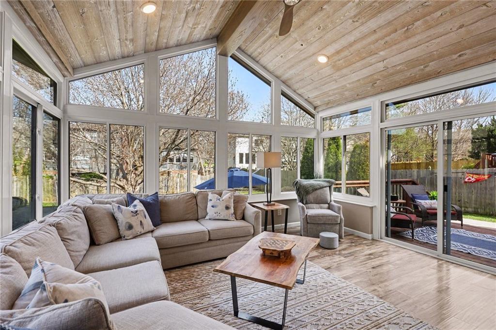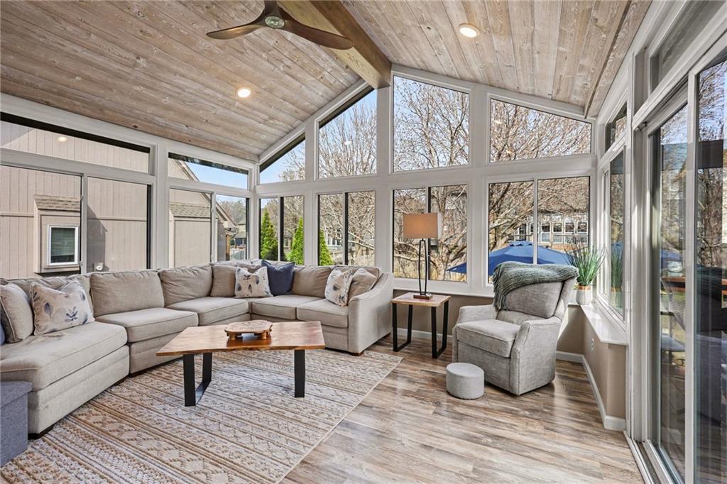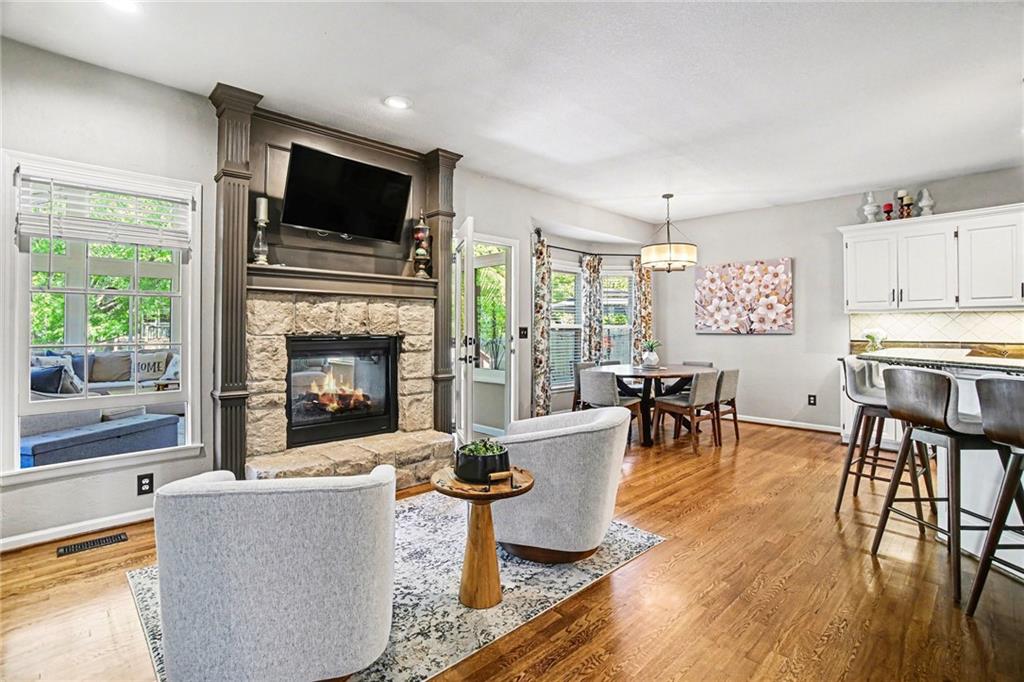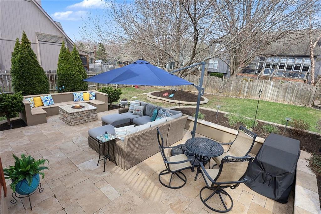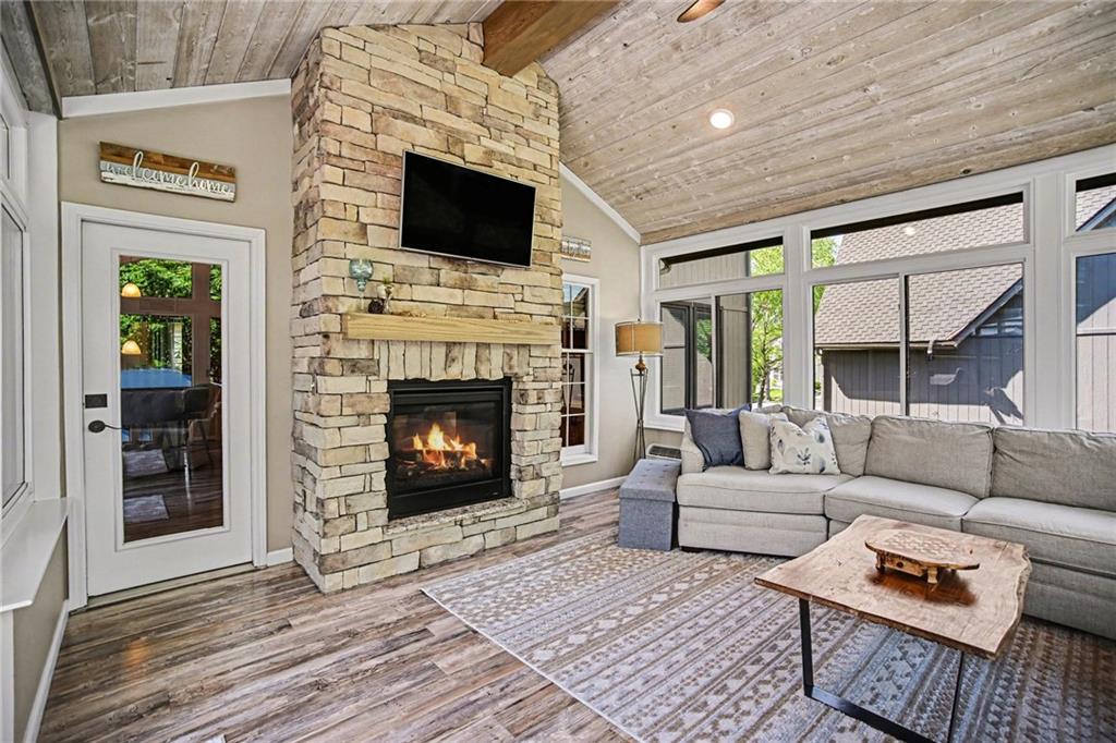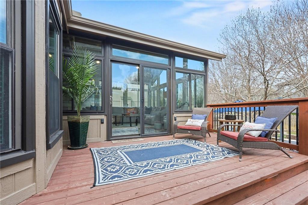 Stunning 2 Story home in Wynnewood! Well-maintained and beautifully updated throughout. Inviting two-story entry. Large great room with hardwood floors and a cozy fireplace. Formal living room and dining room. Beautiful kitchen and hearth room with a fireplace, hardwood floors, center island, stainless steel appliances, granite countertops, and a breakfast area. Amazing sun room off the kitchen/hearth room with a see-through stone fireplace. Huge primary suite with a sitting area and fireplace, one secondary bedroom with private bath, and two additional bedrooms with a Jack and Jill bath on the second floor. Finished lower level with a family room, great bar area, non-conforming bedroom/bonus room, and a full bath. The backyard is an entertainer's paradise, beginning with the sun room, leading to the deck, and a gorgeous custom travertine patio with an outdoor kitchen, fire pit, and an outdoor TV enclosure. NEW ROOF to be installed by closing! Three car tandem garage. Wonderful neighborhood amenities, including a pool. Great location in the highly-rated Blue Valley School District.
