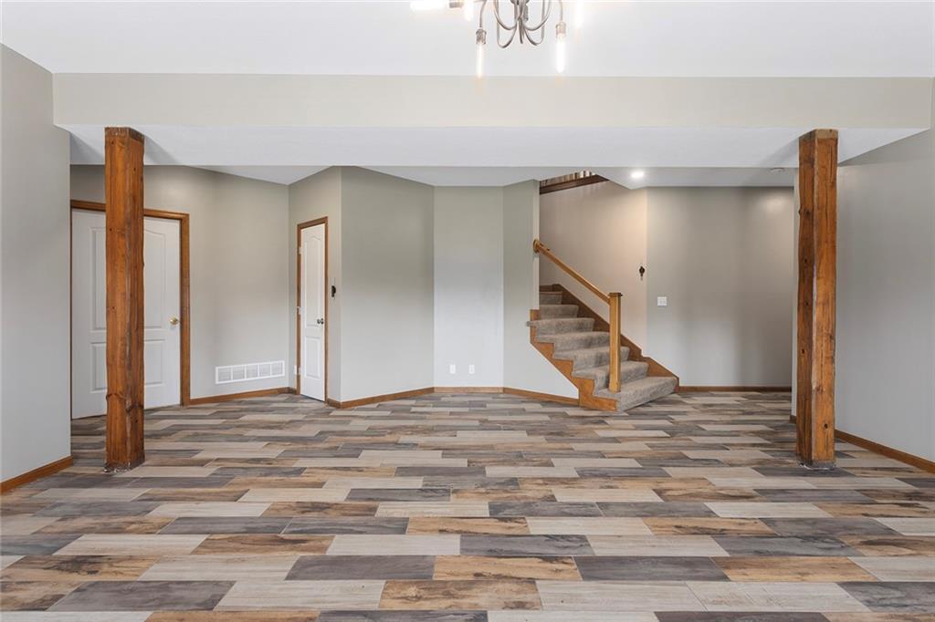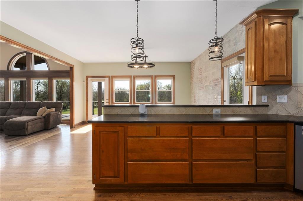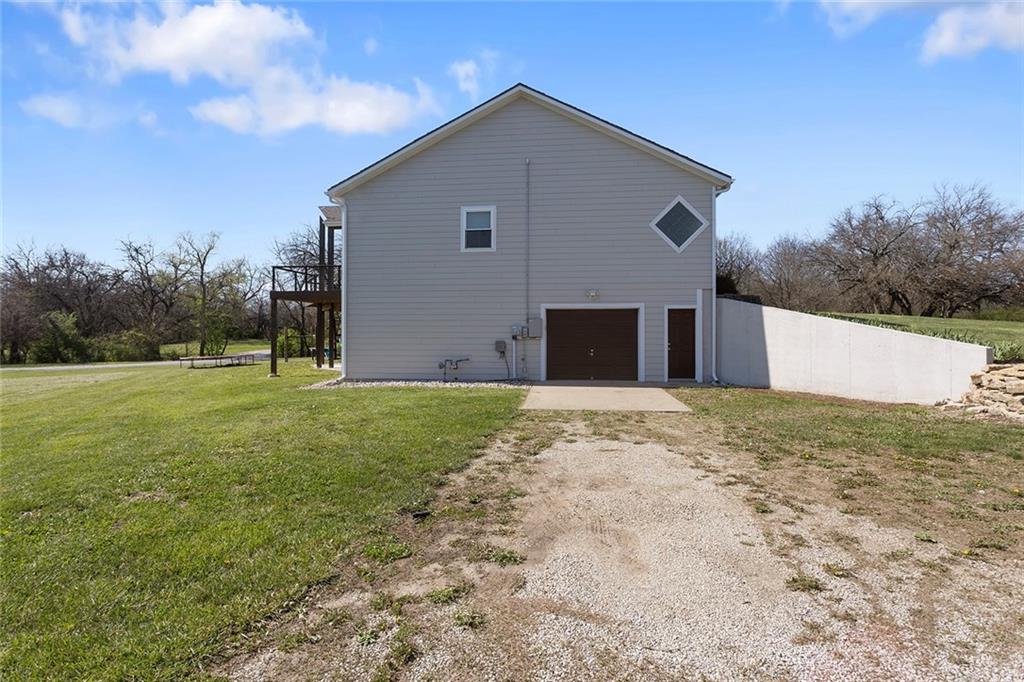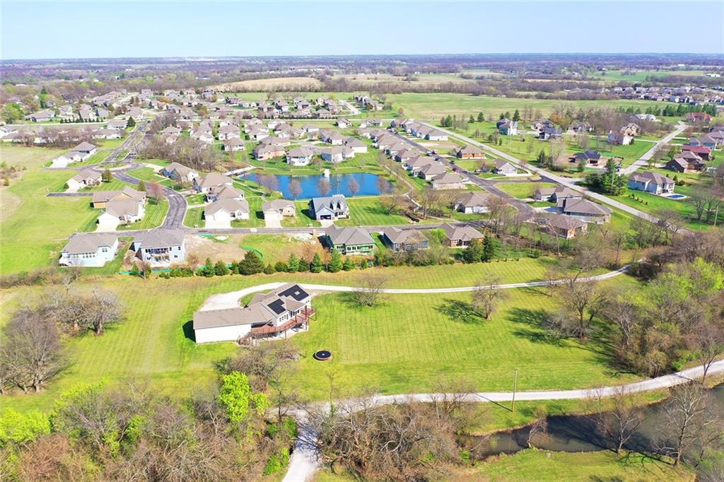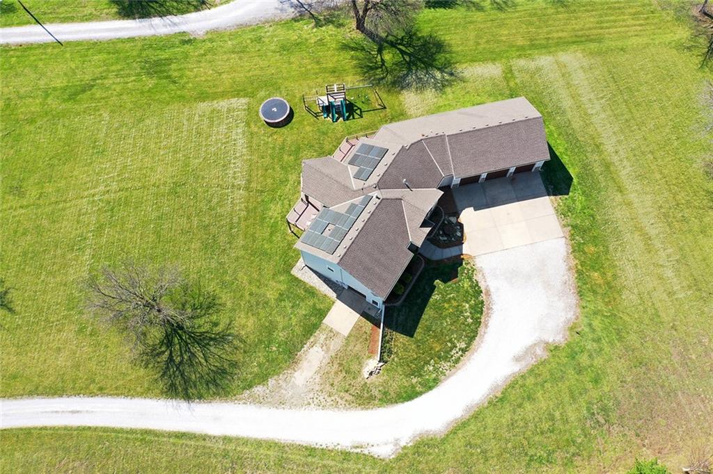RARE 4-ACRE RETREAT JUST MINUTES FROM KANSAS CITY! Discover the perfect balance of privacy, space, and convenience with this exceptional reverse 1.5-story home tucked away in a picturesque, tree-lined setting. Offering nearly 4 acres of serene landscape, this property delivers a true country-living experience without sacrificing access to top-rated schools, shopping, and city amenities. Designed for both comfort and functionality, this home showcases vaulted ceilings, expansive living spaces, and an abundance of natural light. The main level provides effortless living, while the walkout lower level expands your options with a private 4th bedroom featuring its own exterior entrance—ideal for guests, multi-generational living, or a private office suite. Outdoor living shines with a wraparound deck, perfect for entertaining or simply enjoying the peaceful surroundings under a canopy of mature trees. Car collectors, hobbyists, or those needing extra space will love the oversized 3-car garage with extended bays and doors, plus a rare 4th garage on the lower level—offering unmatched flexibility. Thoughtfully updated throughout, with major improvements in the past 2–3 years including new hardwood floors, custom plank tile, updated lighting and fans, exterior stone accents, upgraded stair finishes, deck enhancements, and a fully finished lower level. Additional updates in progress add even more value. Don't forget the advantage of low energy bills due to the energy efficient living with Solar Panels. **Please note Solar Panels are paid for and there is no financial burden transferred to the buyer, just the savings. Opportunities like this—with acreage, upgrades, and location—are few and far between. This is the one buyers have been waiting for.