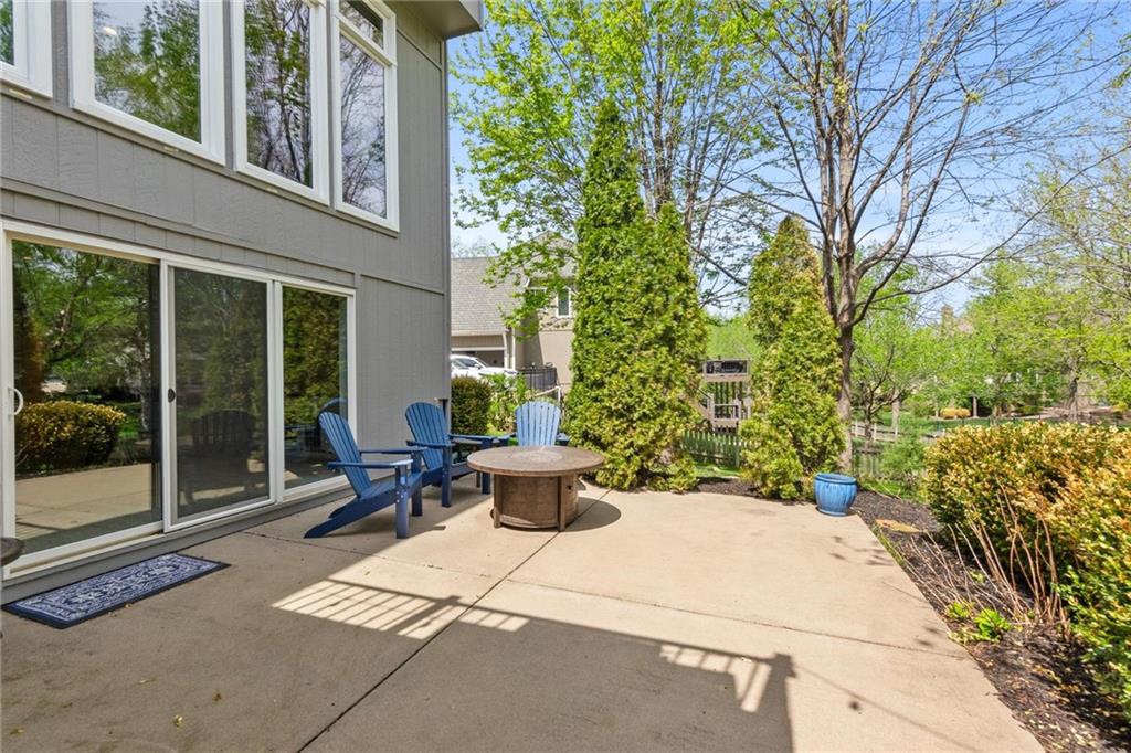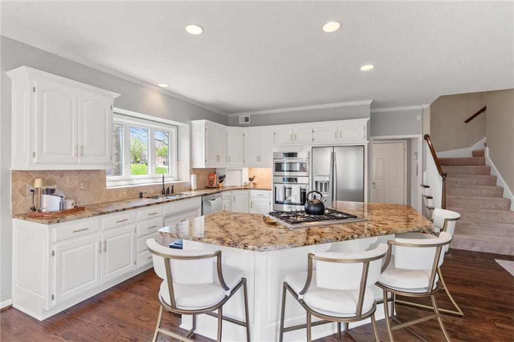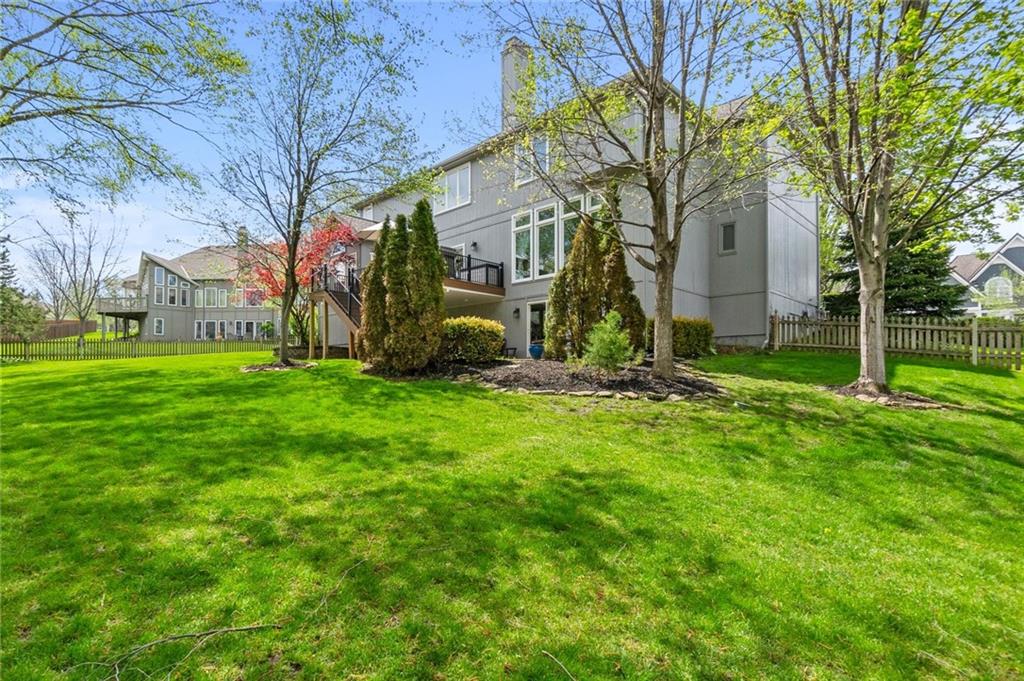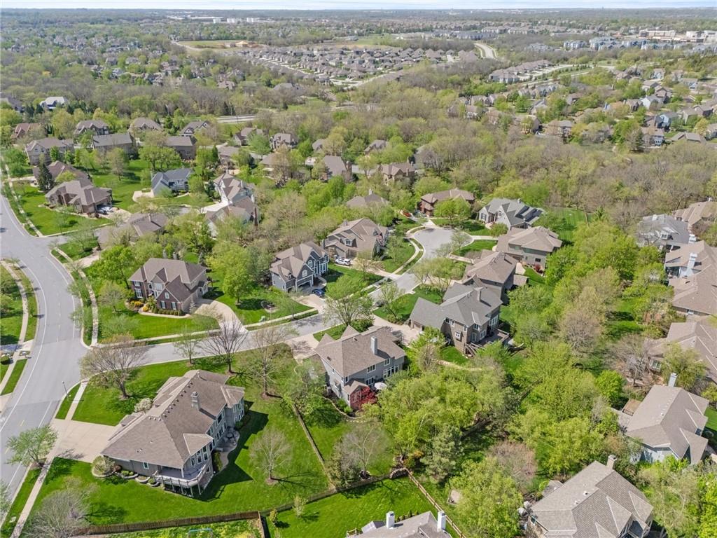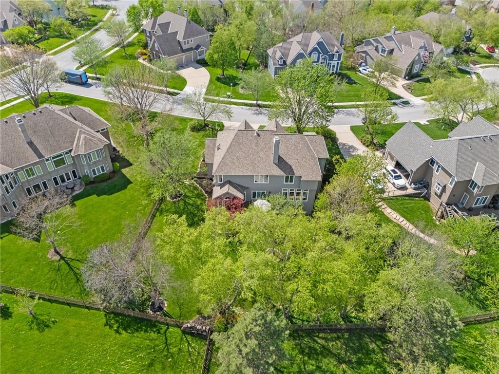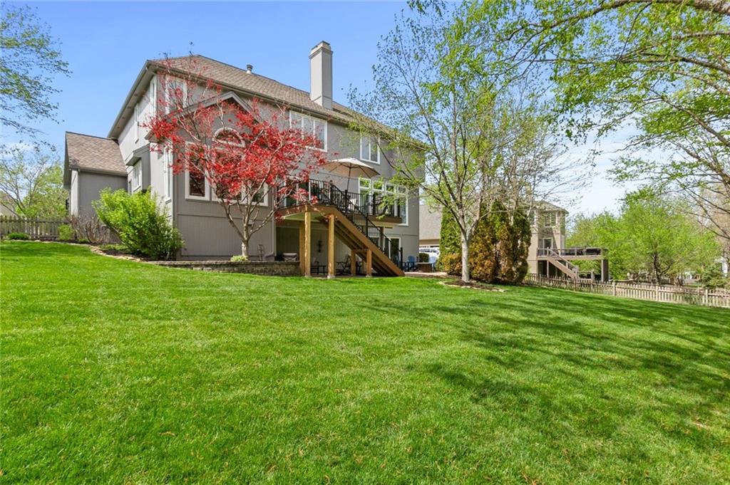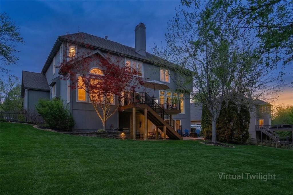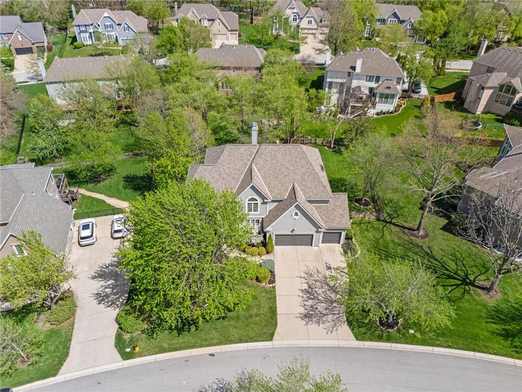 Prestigious neighborhood, quality built Lambie Geer 2 story, with finished walkout lower level, to wood fenced, treed yard in a cul de sac. New maintenance free deck and new triple pane windows. Double stairs, zoned HVAC. Formal living, formal dining, main floor office. Beautiful powder room. Formal living room has tons of natural light and a charming wet bar. Large kitchen with center island, breakfast room and hearth room with stone fireplace. Granite, Bosch stainless steel appliances. Gorgeous primary bath and large primary with walk in closet. Look close & see the quality, pride, & SPACE!! Award winning Blue Valley schools. AWESOME LOCATION Awesome home in prestigious neighborhood. New Roof coming this week!