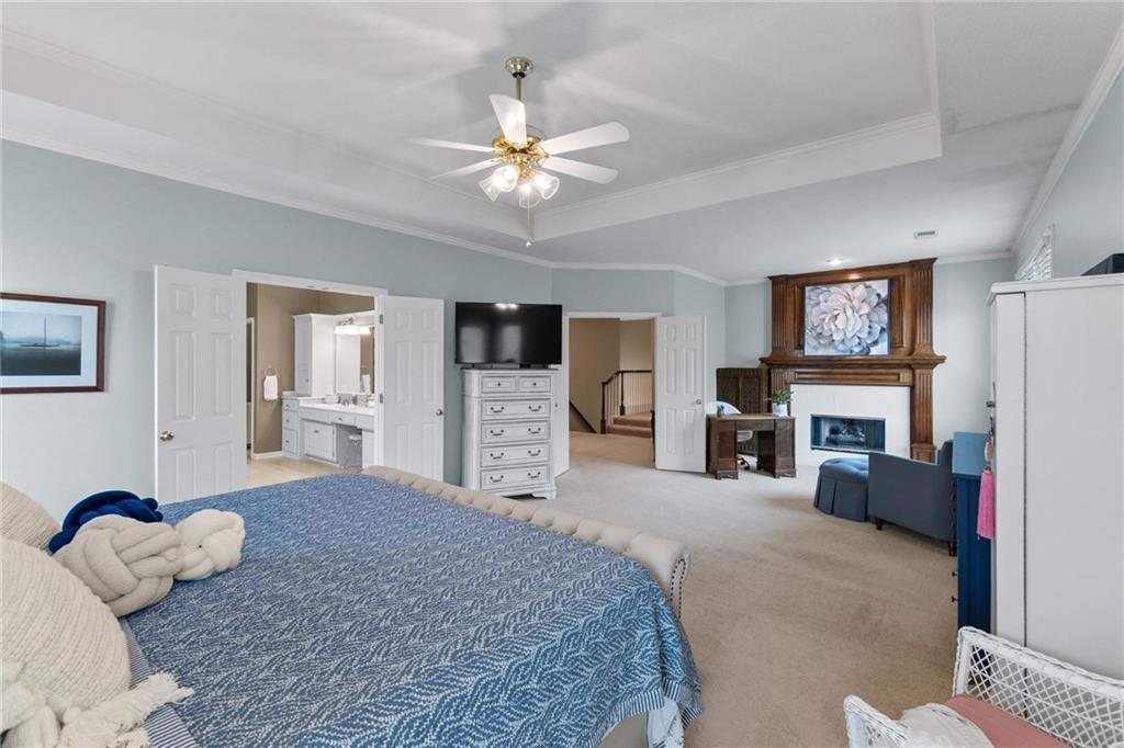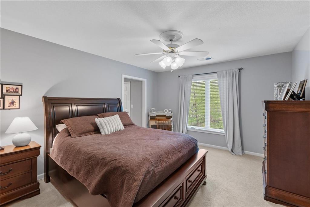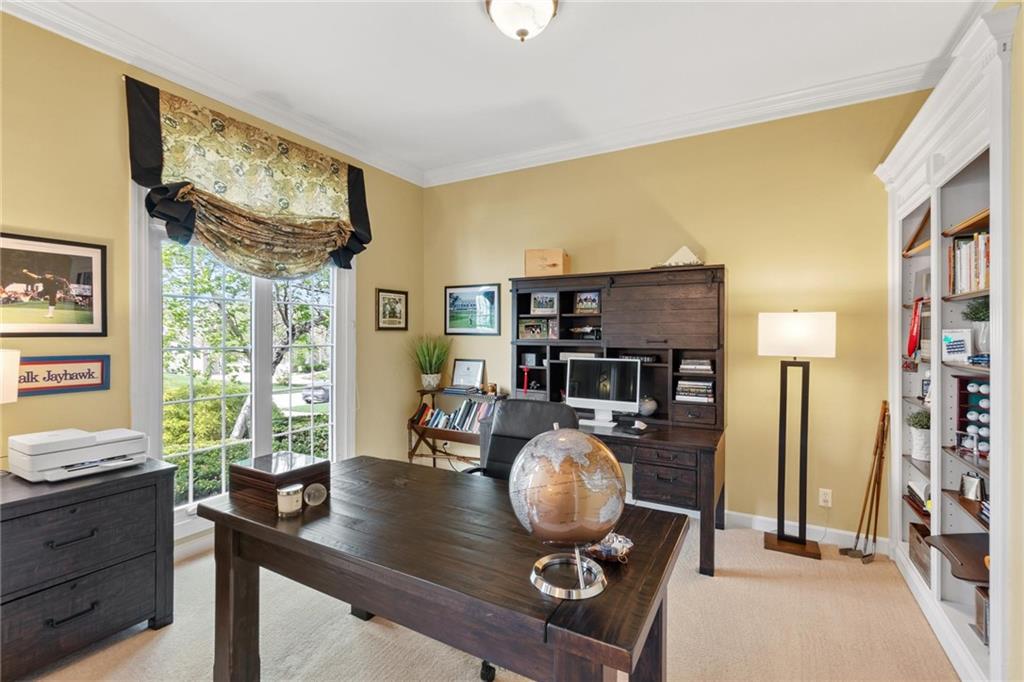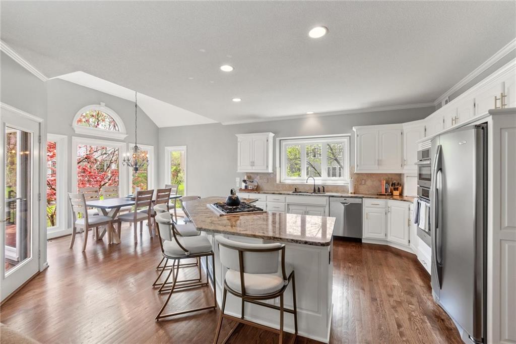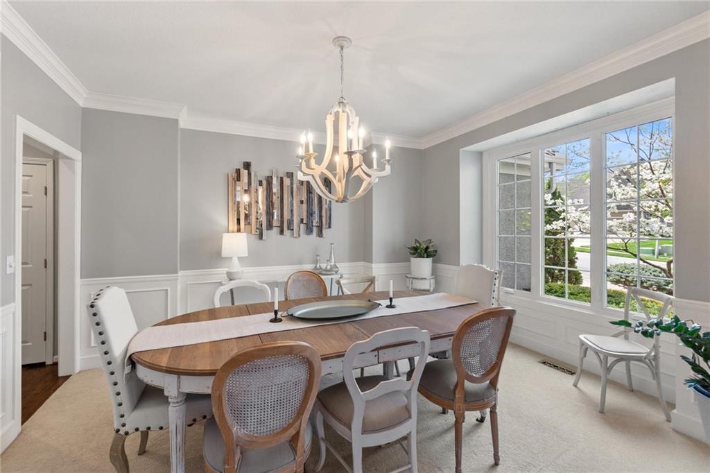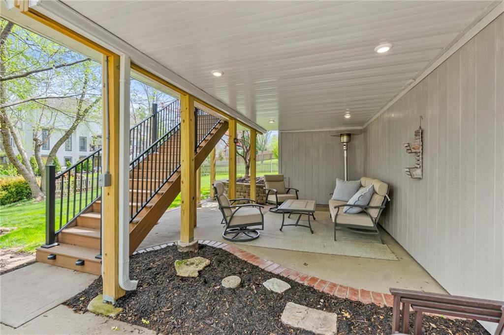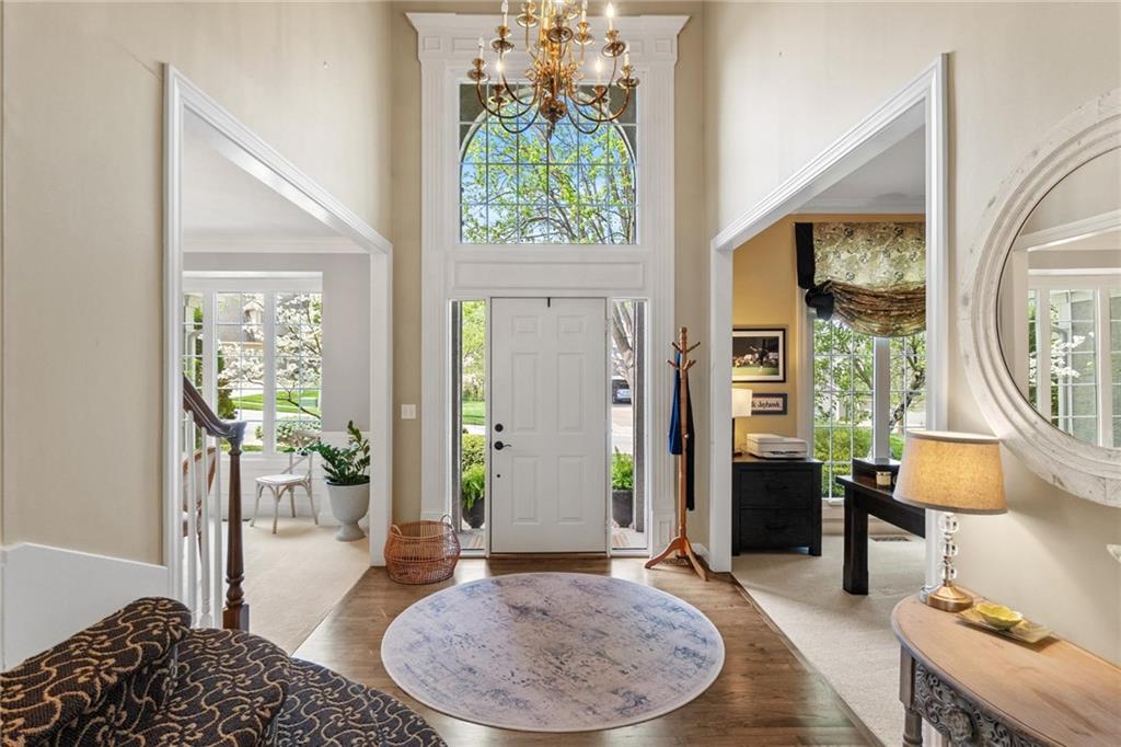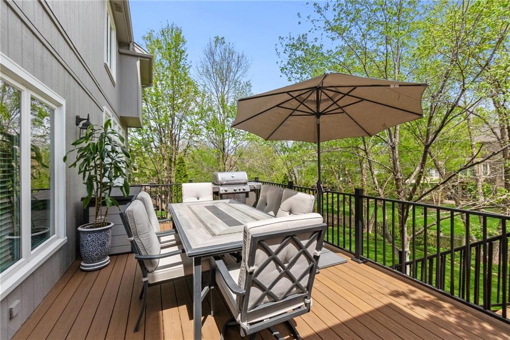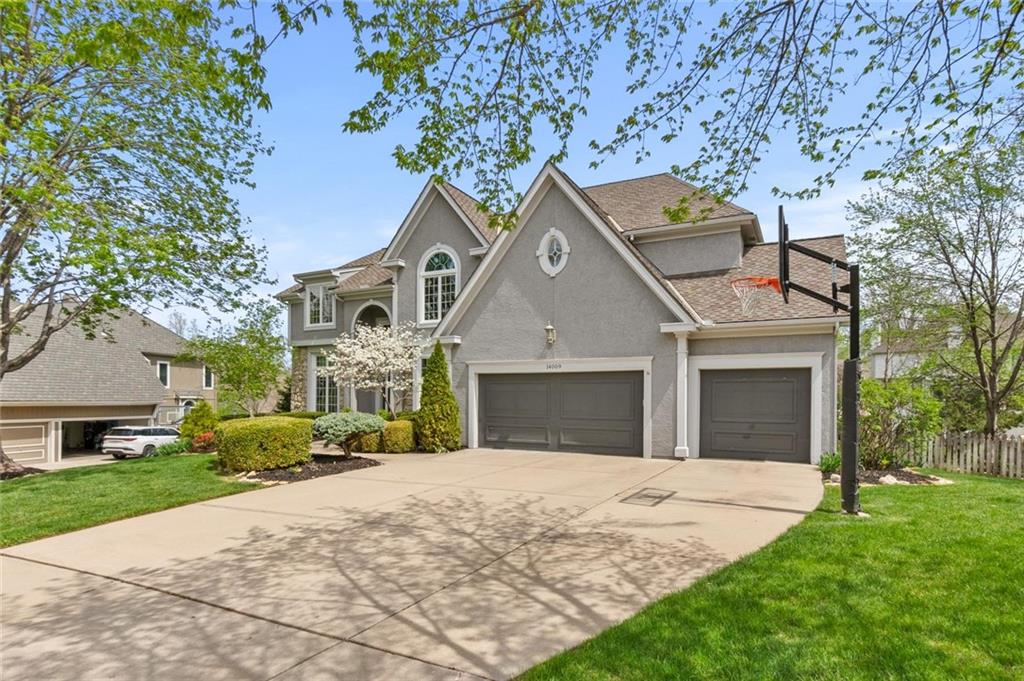 Prestigious neighborhood, quality built Lambie Geer 2 story, with finished walkout lower level, to wood fenced, treed yard in a cul de sac. New maintenance free deck and new triple pane windows. Double stairs, zoned HVAC. Formal living, formal dining, main floor office. Beautiful powder room. Formal living room has tons of natural light and a charming wet bar. Large kitchen with center island, breakfast room and hearth room with stone fireplace. Granite, Bosch stainless steel appliances. Gorgeous primary bath and large primary with walk in closet. Look close & see the quality, pride, & SPACE!! Award winning Blue Valley schools. AWESOME LOCATION Awesome home in prestigious neighborhood. New Roof coming this week!