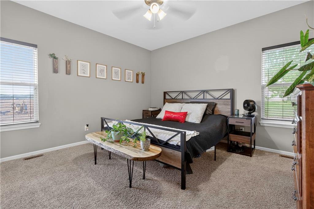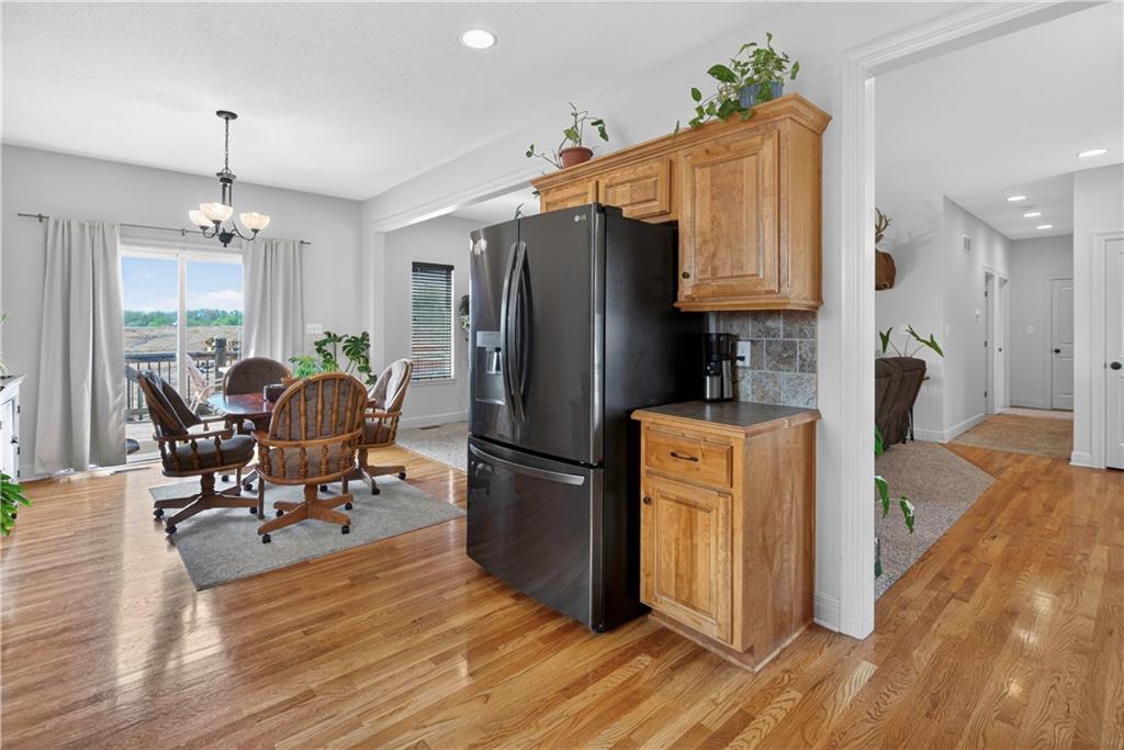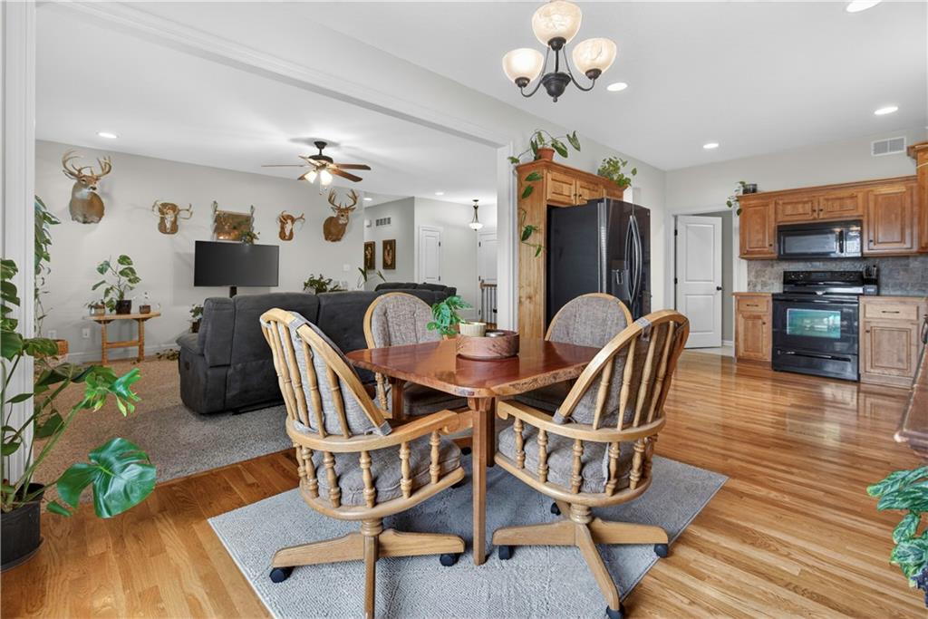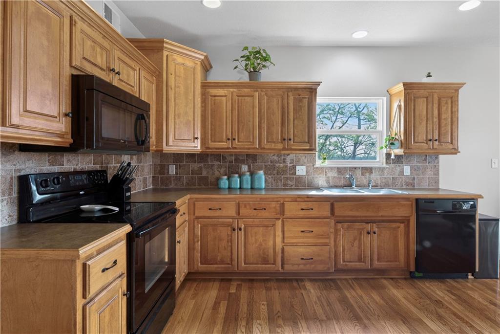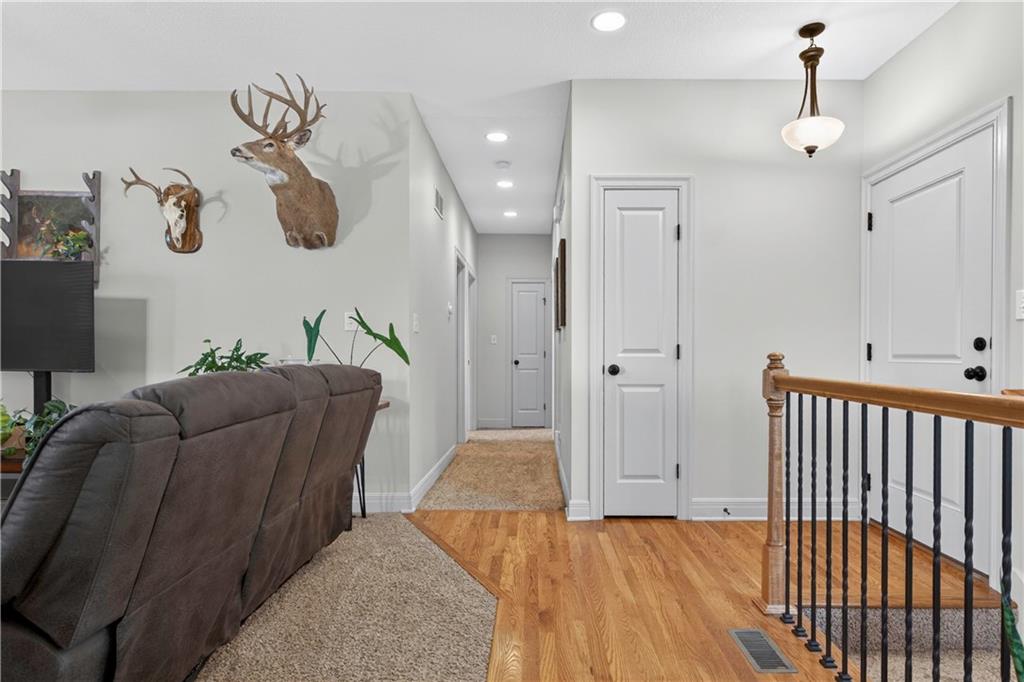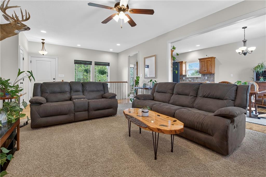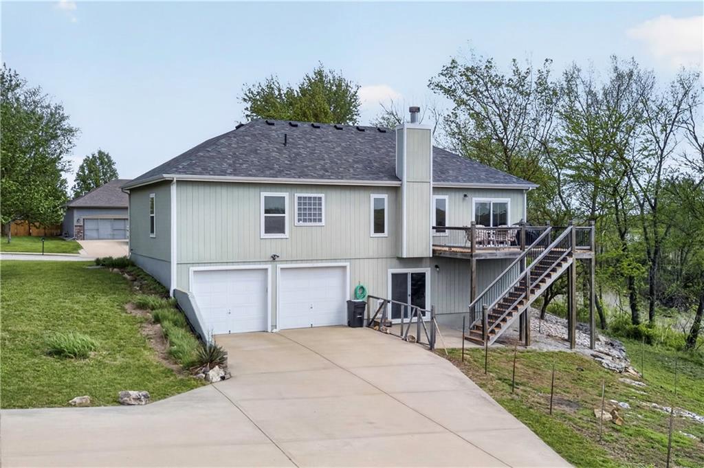 Welcome to Whispering Hills Estates, where this beautifully maintained home sits on a spacious corner lot surrounded by mature trees and peaceful views of nature and wildlife. Offering both privacy and a serene setting, this property is ideal for those seeking a quiet retreat while still being conveniently located near local amenities. Inside, you will find a functional and inviting layout with an oversized great room filled with natural light and anchored by a wood-burning fireplace, ready to create a warm and cozy atmosphere. The kitchen and dining area flow seamlessly and lead directly to the back deck, the perfect place to enjoy stunning sunrise and sunset views. The spacious primary suite offers a relaxing escape with double vanities and a jetted tub designed for unwinding at the end of the day. Additional features include an unfinished daylight walkout basement already stubbed for a full bathroom, providing endless potential for future living space, storage, or customization to fit your needs. A storm shelter adds an extra layer of peace of mind. The oversized garage offers ample space for vehicles, a workshop, or additional storage, making it as practical as it is functional. With its scenic setting, flexible living space, and opportunity to make it your own, this home stands out in the Lone Jack real estate market and is ready for its next chapter.