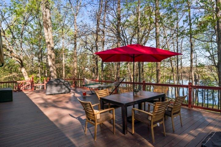 Boat slip and PWC deck INCLUDED. Beautiful lakefront home in the heart of the Ozarks with incredible main channel views and a peaceful, private setting. This 1,540 sq ft home features a spacious lakeside 1000sq. ft. deck with hot tub, plus a 10'x26' boat slip with 6000lb. lift just a short 2-minute walk away. Inside, you'll find cherry cabinets, granite countertops, wood floors, custom finishes, and a cozy wood-burning fireplace. The large master suite offers deck access, a walk-in closet, and a newer rain/steam shower. Enjoy wooded privacy, fire pits, wildlife, and a quiet neighborhood with a convenient boat launch nearby. The property includes four lots with over 400 feet of lake frontage, plus an additional buildable lakefront lot and two lots across the road--one with a 30'x40' insulated shop/garage featuring two overhead doors, two walk-in doors, four windows, and is wired for 110 and 220 volts, with an additional 30-amp 110-volt RV outlet outside. Well-maintained home, with recent septic service and a current Corp vegetation permit.