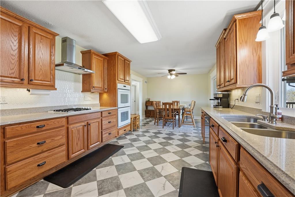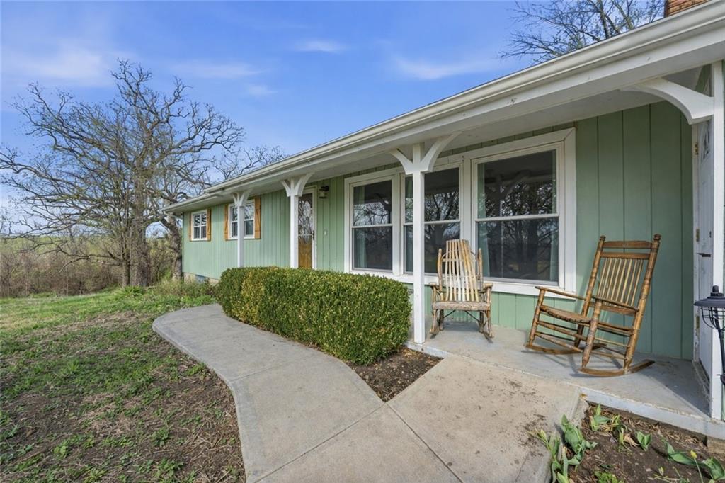 Welcome to this beautifully updated home in the Burns Addition subdivision of Edgerton, Missouri. From the moment you walk in, you’ll love the warm hardwood floors, stunning brick fireplace and custom built-ins that create a cozy and inviting living space. A wall of windows fills the home with natural light, making every room feel bright and open. The updated kitchen offers an abundance of cabinet and counter space, featuring Corian countertops, a gas cooktop with stainless steel hood vent, tile flooring, and a built-in pantry—perfect for everyday living and entertaining. Just off the kitchen, step out to the expansive covered deck overlooking a large, private lot with mature fruit trees, creating a peaceful outdoor retreat you’ll enjoy year-round. All three bedrooms are generously sized, and the primary bathroom has been fully updated with a fresh, modern feel. You’ll also appreciate the convenience of main-level laundry complete with built-in cabinets and a utility sink. The unfinished walkout lower level provides excellent storage or future finishing potential, and the attached two-car garage adds even more functionality. A small shed offers additional outdoor storage, and the serene setting provides privacy while still being conveniently located. This home truly combines comfort, space, and thoughtful updates—ready for you to move in and enjoy.