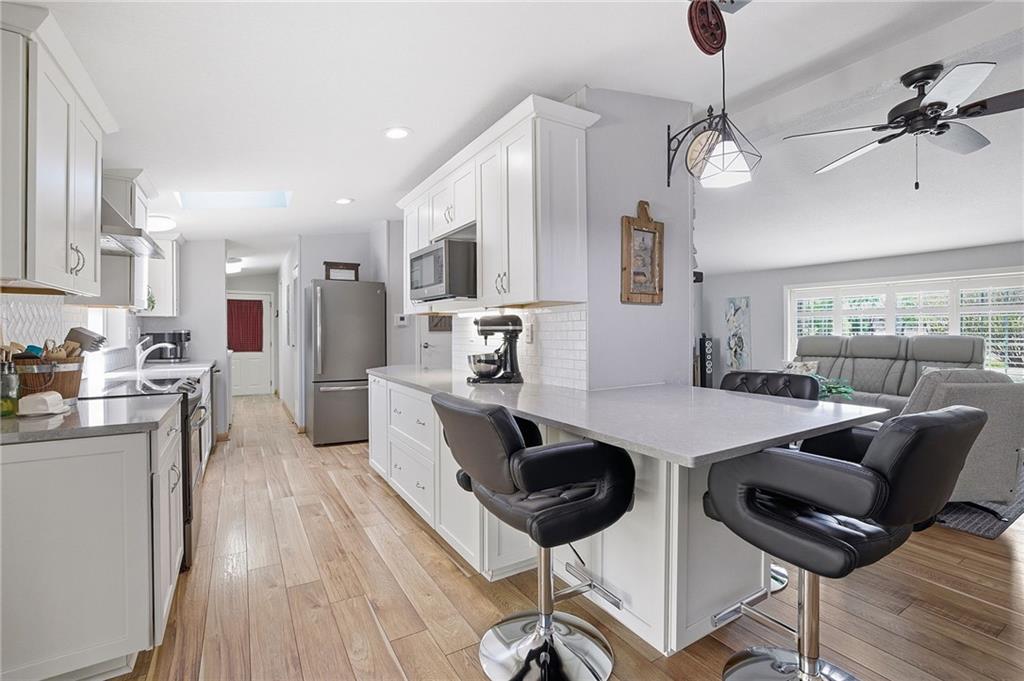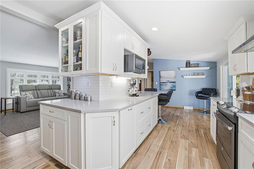 Beautifully updated ranch home, a rare find that offers exceptional privacy and space spread across four combined lots in the gated Linn Valley Lakes community. The interior boasts a spacious open layout with soaring vaulted ceilings, refreshed with bright paint colors and a whitewashed stone fireplace, stylish luxury vinyl plank flooring, and elegant plantation shutters throughout. At the heart of the home is a large kitchen featuring sleek quartz countertops, a walk-in pantry, and plenty of space for gatherings, making it an entertainer's dream. The home also features a large primary suite and an impressive sunroom that provides significantly more square footage to the living space while flooding the home with natural light. Oversized 26x30 garage. Practicality meets the lake lifestyle with two outbuildings on-site, perfect for storing all your lake toys, tools, and gear. Major updates provide peace of mind, including a one-year-new roof, and while the home currently utilizes a cistern, the ability to connect to city water is currently being installed across the street for easy future access. Outside, the level, treed grounds feature a huge patio, private fire pit, hot tub and paved drive all while granting you access to premier resort amenities like the 18-hole golf course, private lakes, and community pools. Welcome home to Linn Valley Lakes! HOA fees for this property include the lot the house sits on and an additional 3 adjacent lot. Each lot has an HOA fee for the cumulative monthly HOA fee that is listed. Taxes and SqFt per county record. Room sizes approx. No preferences or limitations or discrimination because of any of the protected classes under Fair Housing.