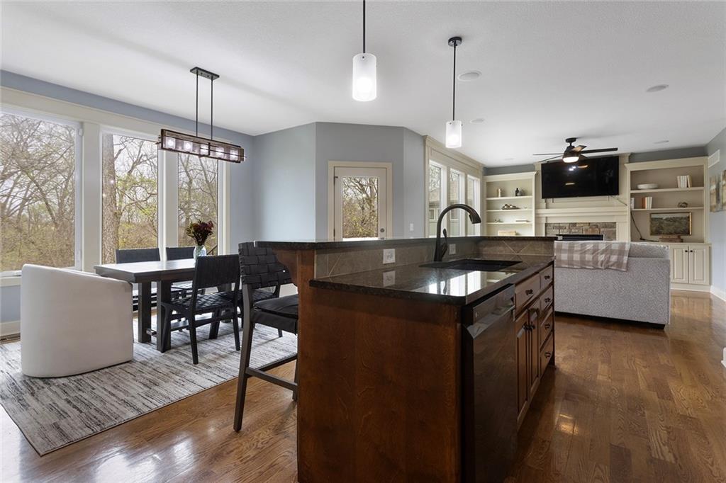 Welcome to this spacious and beautifully appointed two-story home in desirable South Olathe! Offering 5 bedrooms and 3.5 bathrooms, this home combines comfort, functionality, and scenic surroundings. The main level features stunning hard oak wood flooring and an abundance of large windows that fill the space with natural light while showcasing peaceful views of the wooded greenspace behind the home. The inviting living room centers around a cozy fireplace and flows seamlessly into the adjacent kitchen—perfect for both everyday living and entertaining. The kitchen is thoughtfully designed with beautiful cabinetry, granite countertops, and a convenient walk-in pantry. Just off the kitchen, you’ll find a dedicated laundry area for added ease and efficiency. A formal dining room sits at the front of the home, offering a more traditional space for gatherings and special occasions, complete with comfortable carpeting. Upstairs, the bedrooms feature plush carpeting and spacious bathrooms, creating comfortable retreats for family and guests alike. You’re sure to love the finished walkout basement, complete with a 5th bedroom, full bath, and a convenient kitchenette. This space lives like separate quarters—ideal for guests, extended stays, or multi-generational living—and opens directly to the patio, with a composite deck above for even more outdoor enjoyment. Step outside to enjoy the backyard firepit, perfect for relaxing evenings under the stars. Additional upgrades include whole-home sound wiring and programmable exterior holiday lighting for year-round convenience and charm. Don’t miss this opportunity to own a beautiful home on a well-kept lot in a sought-after location!
