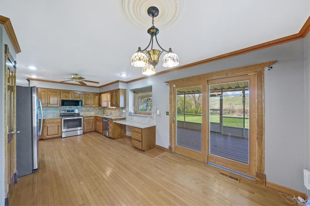Maintenance-free exterior featuring energy-efficient permanent siding and stacked stone accents. The expansive yard is designed for both relaxation and entertaining, offering a large paver brick patio with arbor, a fully fenced backyard, garden space, and a seasonal screened-in room with Trex flooring—perfect for enjoying time outdoors. Inside, the country-style kitchen is both functional and inviting, highlighted by a large picture window, granite countertops, a closet pantry, built-in desk, stainless steel appliances including a range and separate grill cooktop, and a deep stainless steel sink. Original gleaming hardwood floors and rich wood cabinetry add warmth and character throughout the home, complemented by detailed custom wood trim, pocket doors, and a striking stained glass front entry. The great room impresses with soaring cathedral ceilings, a bay window with stained glass accents, and a stone fireplace flanked by built-in bookshelves. Conveniently located on the main level are the laundry area and a half bath. The finished lower level, approximately 800 square feet, features newer wood plank-style flooring and upgraded designer wainscoting. With a third full bath and an L-shaped layout, this space offers excellent flexibility as a private guest suite, additional living area, or family room. Upstairs, the primary suite includes a spa-like bath with a jetted tub and separate shower. The secondary bathroom features ceramic and marble accents with a shower-over-tub design, ideal for everyday use. This home offers a perfect blend of charm, functionality, and thoughtful updates—ready to welcome its next owner.