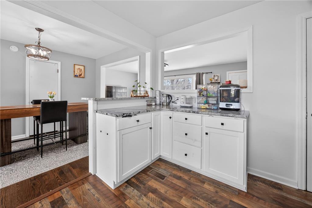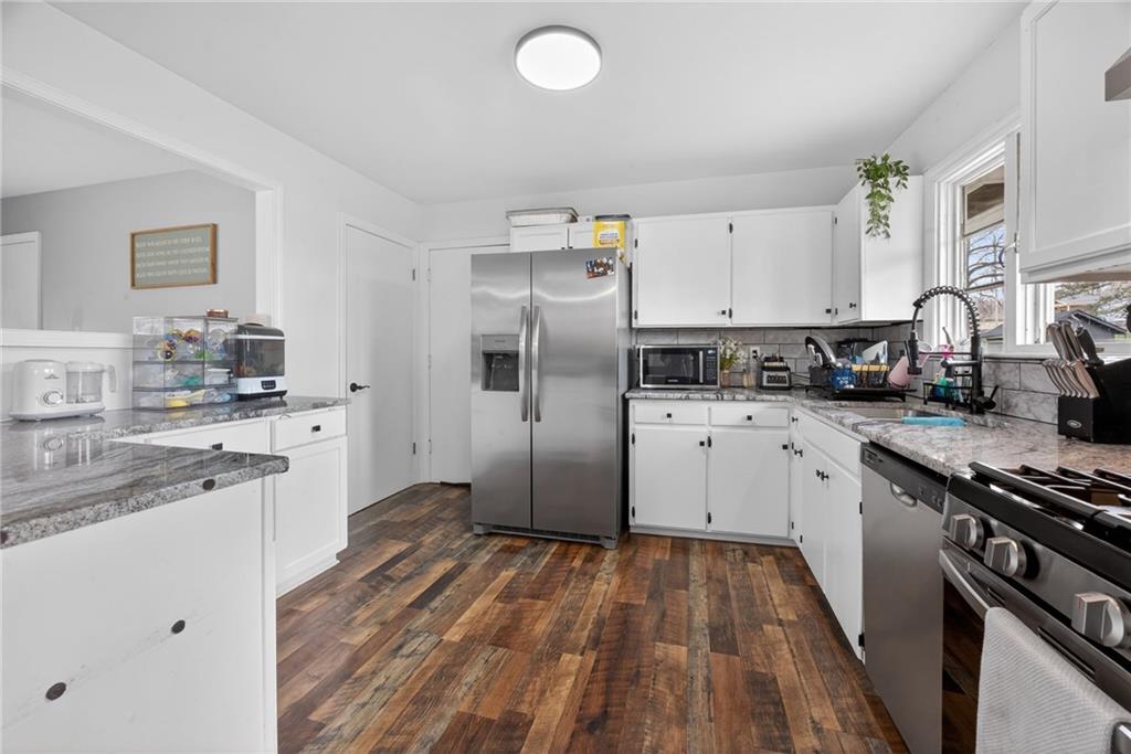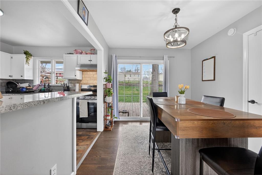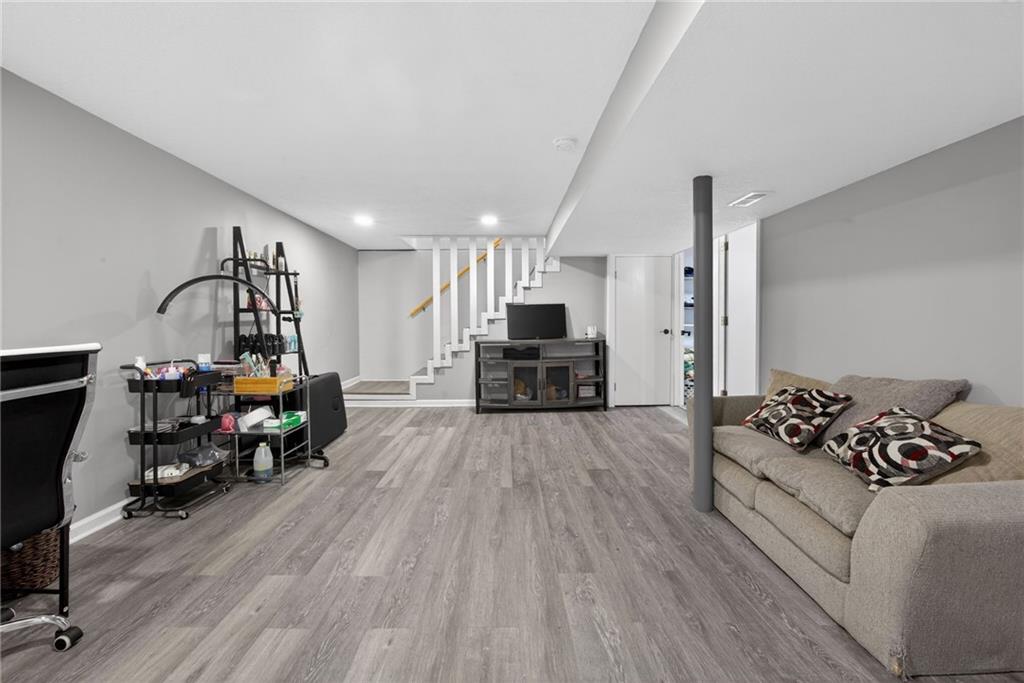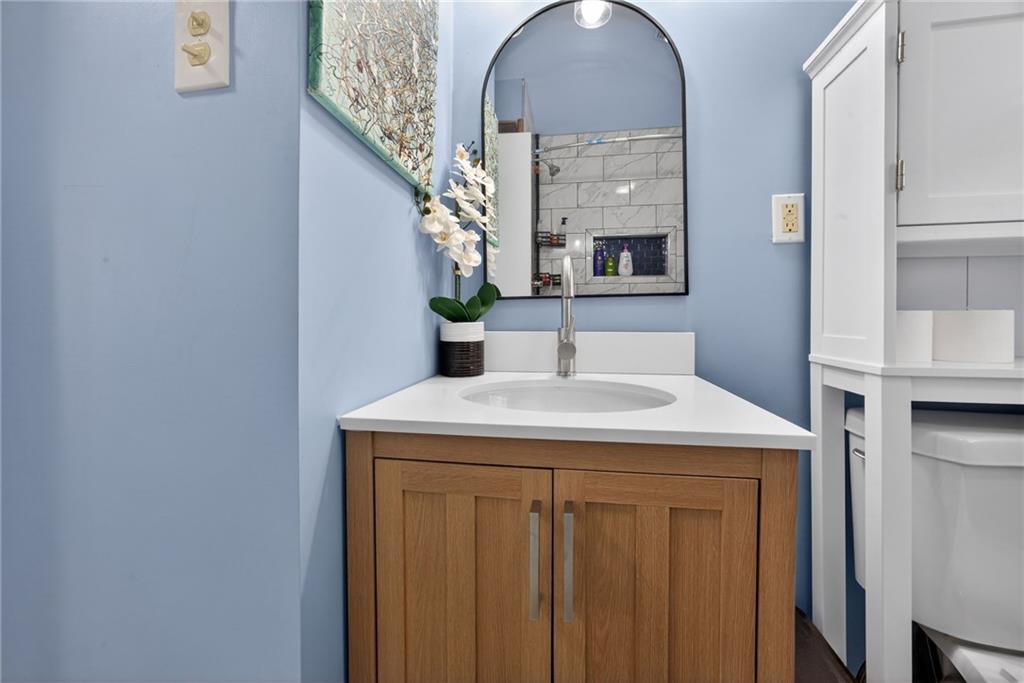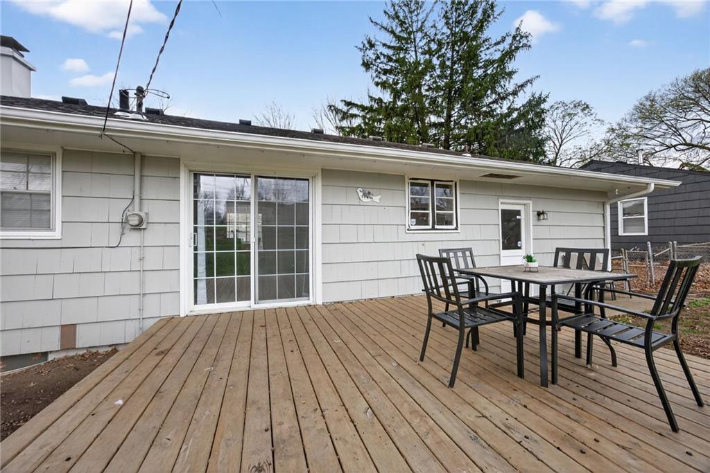 Welcome home to this thoughtfully updated ranch offering modern style, functional space, and true move-in ready living. Refinished hardwood floors and fresh interior and exterior paint create a bright, welcoming feel throughout the main level. The open kitchen features granite countertops, stainless steel appliances, and a convenient pass-through to the living room, allowing for easy entertaining and everyday connection. The adjoining dining area enhances the home’s open, comfortable layout. Both bathrooms have been beautifully renovated with ceramic tile, updated vanities, and contemporary fixtures, delivering a clean, modern look buyers love. A dedicated laundry room with stylish herringbone tile adds both character and practicality. The finished basement expands the living space with a versatile second living area or rec room — ideal for movie nights, a home office, fitness space, or guests. Step outside to enjoy the deck overlooking a large fenced backyard, perfect for relaxing or entertaining, plus a storage shed for added convenience. The spacious garage provides additional storage and functionality. Located close to highways, shopping, dining, and everyday amenities, this home offers the perfect balance of updates, space, and accessibility. A turnkey opportunity you won’t want to miss!