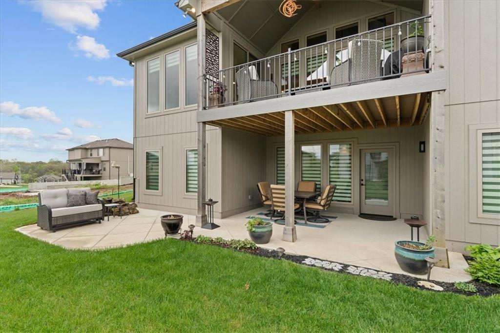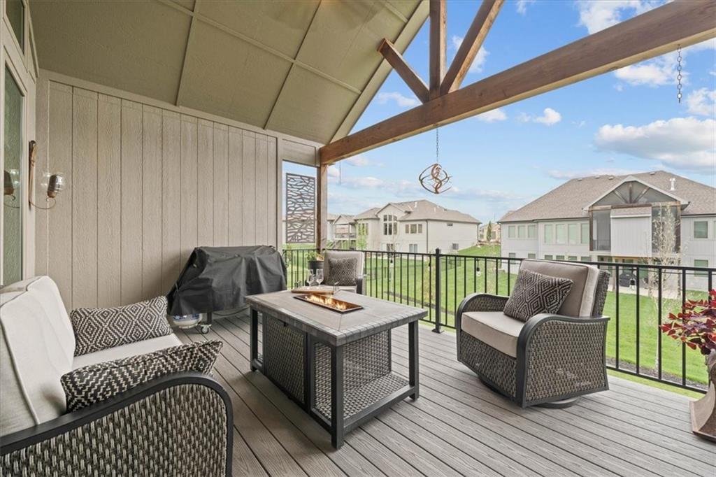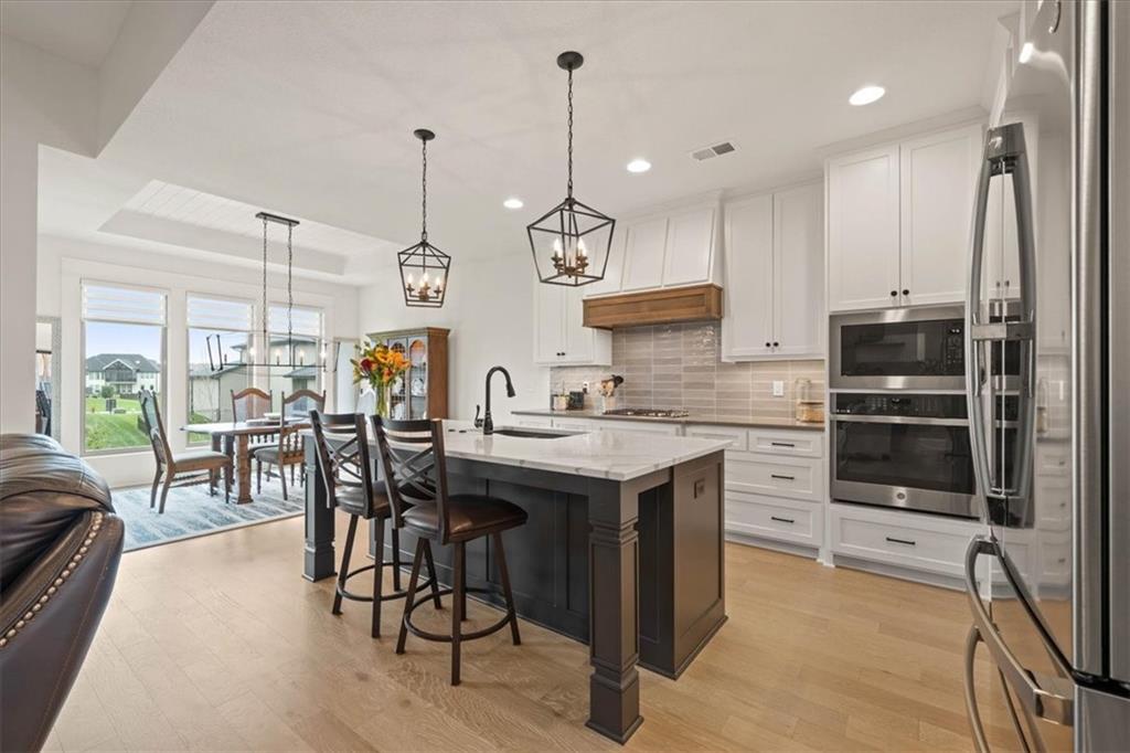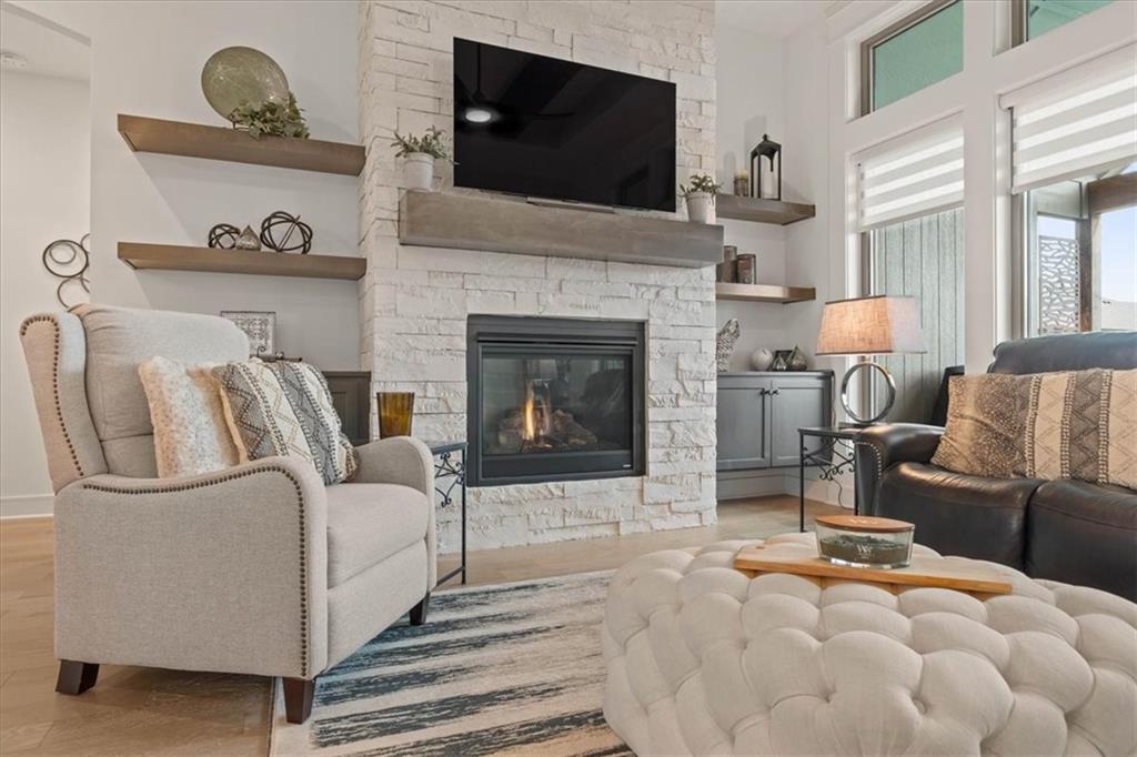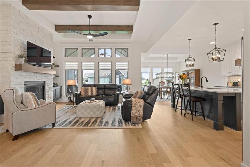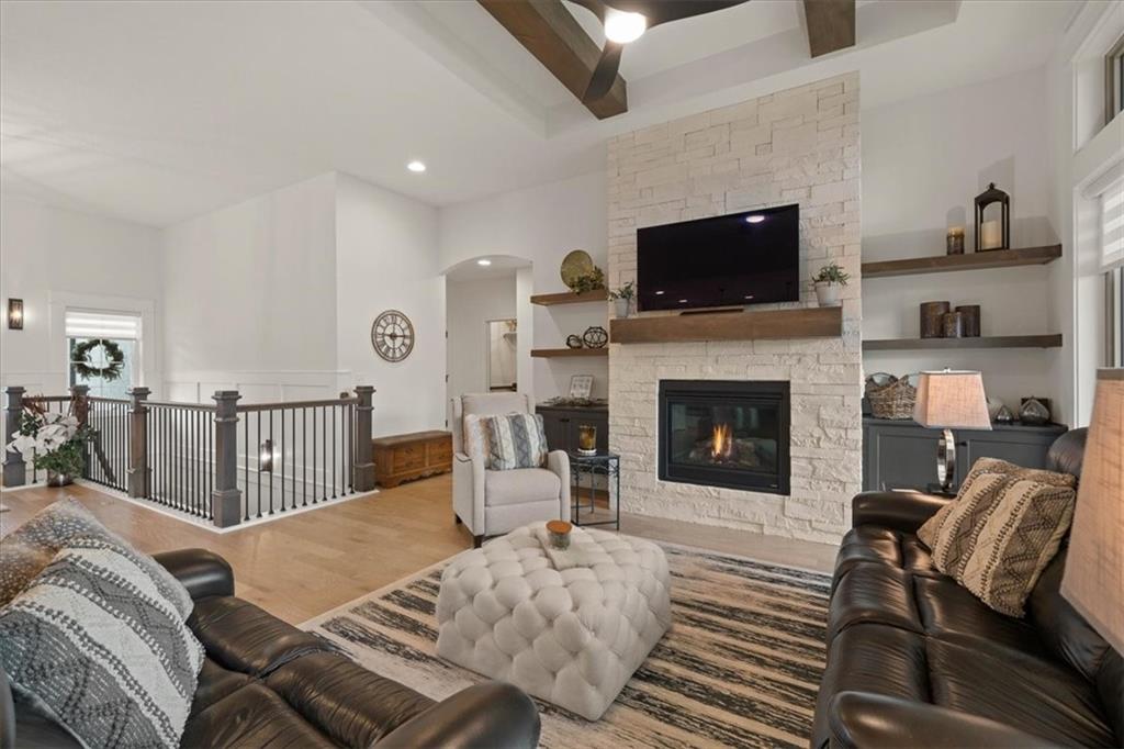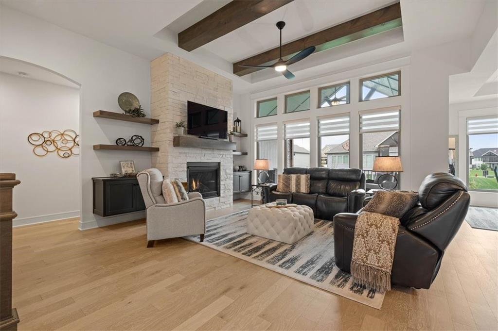 Welcome to this stunning JFE custom-built home loaded with high-end finishes, thoughtful upgrades, and exceptional detail throughout in an excellent location in the award winning Lee's Summit School District. A charming front porch and grand double-door entry welcome you into a light-filled, open main level designed for both everyday living and entertaining. The spectacular kitchen is a true showpiece featuring abundant custom cabinetry, built-in trash storage, a massive quartz island, gas cooktop, and an oversized walk-in pantry. The kitchen flows seamlessly into the dining area and spacious living room highlighted by a dramatic floor-to-ceiling stone fireplace, flanked by built-in cabinetry and floating shelves. The luxurious primary suite is a true retreat with a spa-like ensuite bath offering a walk-in shower with dual shower heads, including a rain shower, and an incredible walk-in closet that connects directly to the laundry room. Every bedroom includes its own private bath, offering comfort and privacy for family and guests alike. The finished walkout lower level provides outstanding additional living space with a large rec room, stylish wet bar, two spacious bedrooms, two full baths, and still plenty of unfinished storage. Some of the many exceptional details include beautiful wood beams, inset tray ceilings with shiplap accents, Graber window treatments, extensive landscaping upgrades, an epoxy-coated garage floor and basement storage area, a 24-foot deep garage, an extended patio, and a covered composite deck perfect for relaxing or entertaining. Located in a vibrant amenity-rich community with miles of walking trails, a neighborhood pool, sand volleyball, a park and play area, several ponds (including one with a fishing dock), and easy access to James A. Reed Wildlife Area. This amazing home offers an exceptional lifestyle in one of the area’s most convenient and sought-after settings.
