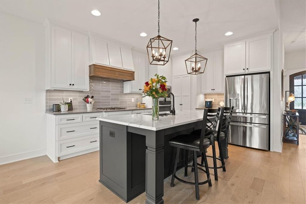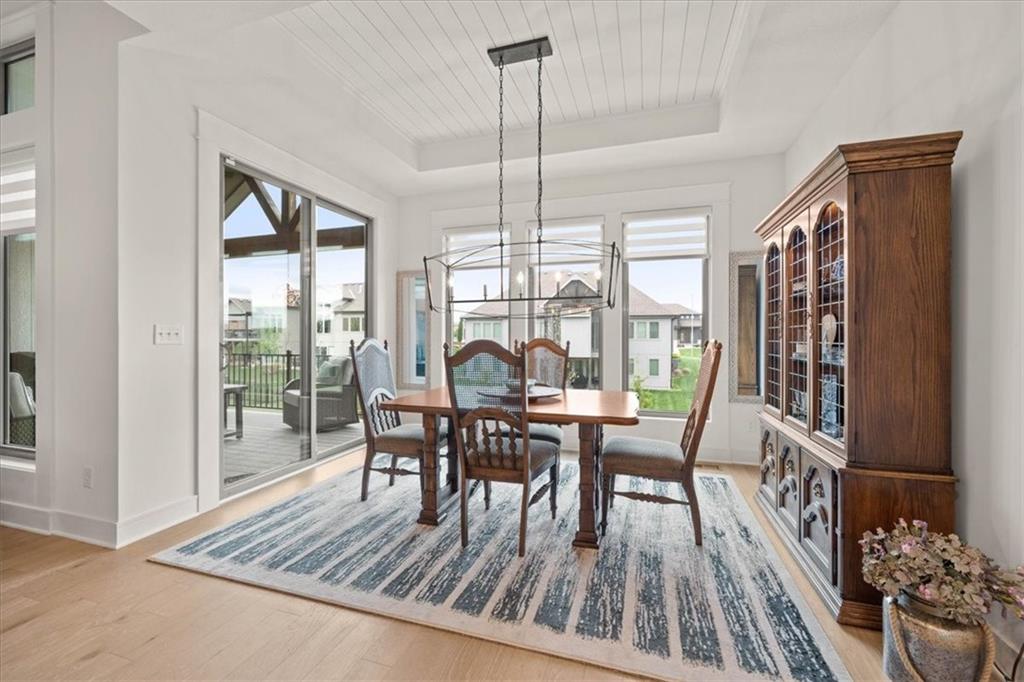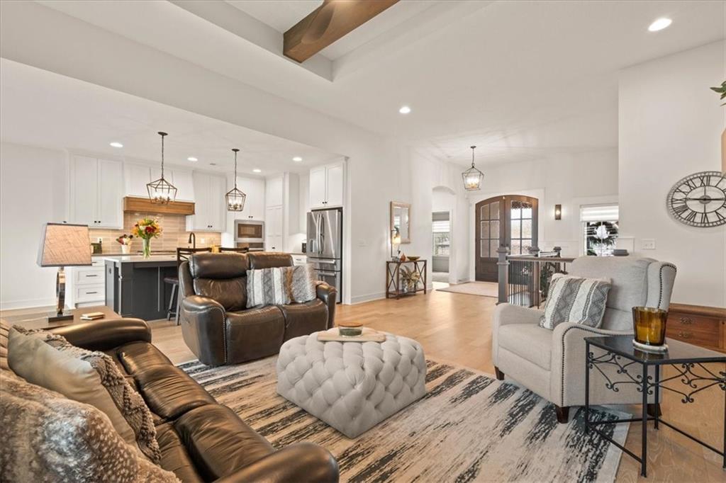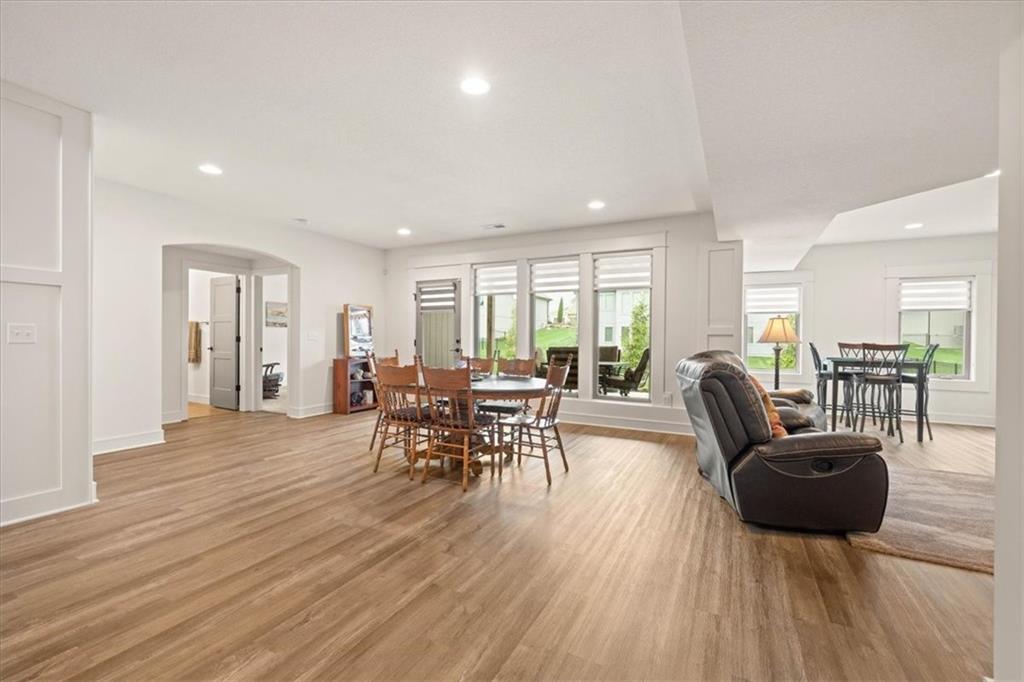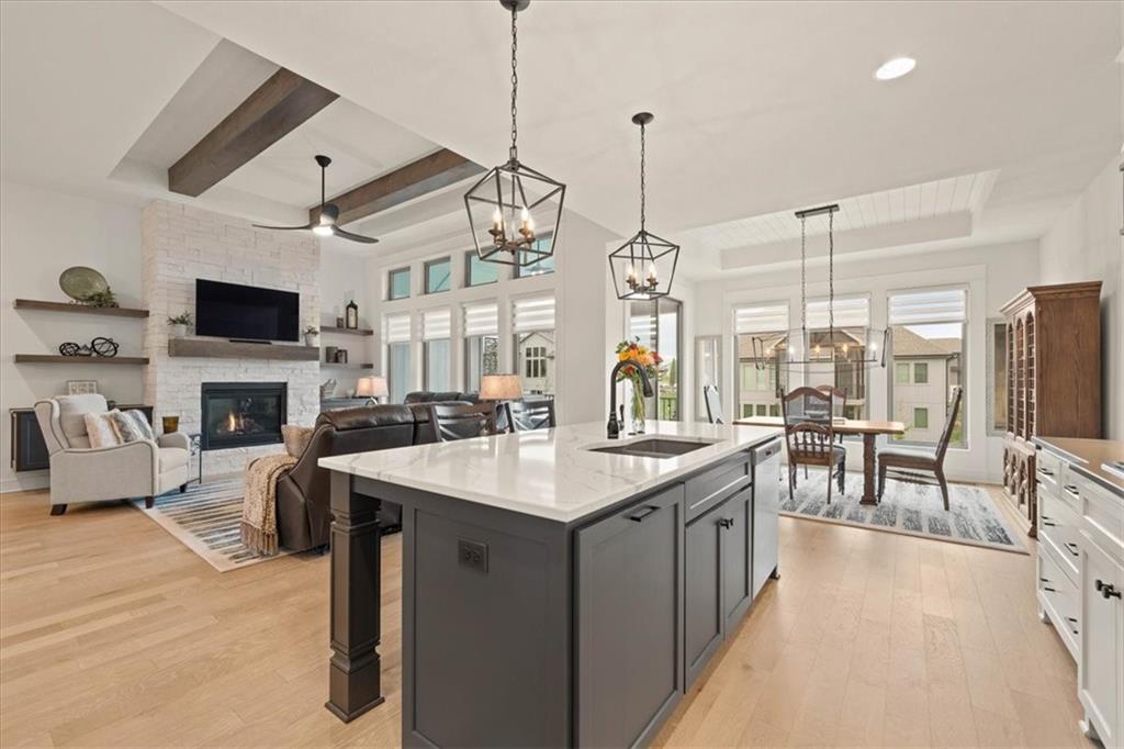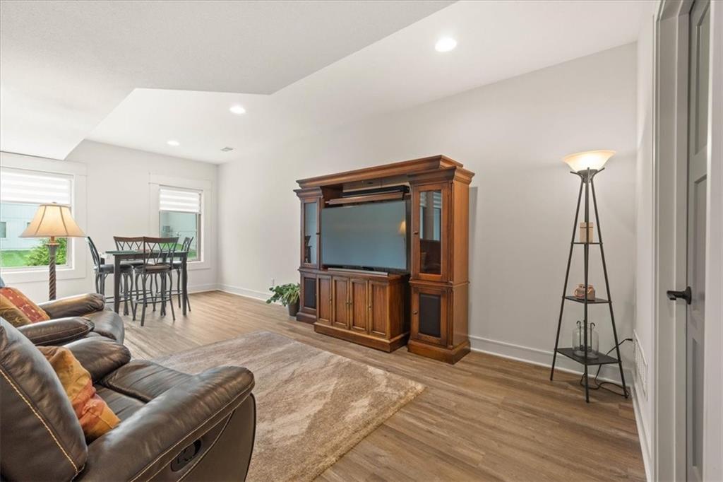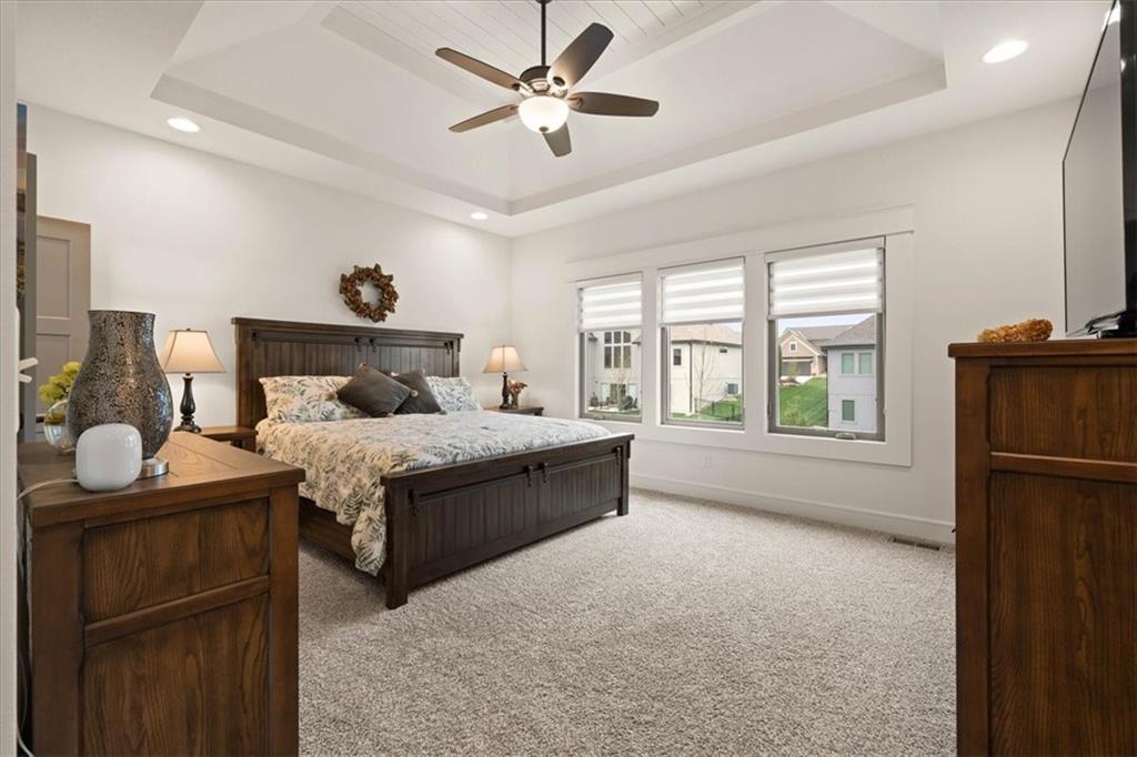 Welcome to this stunning JFE custom-built home loaded with high-end finishes, thoughtful upgrades, and exceptional detail throughout in an excellent location in the award winning Lee's Summit School District. A charming front porch and grand double-door entry welcome you into a light-filled, open main level designed for both everyday living and entertaining. The spectacular kitchen is a true showpiece featuring abundant custom cabinetry, built-in trash storage, a massive quartz island, gas cooktop, and an oversized walk-in pantry. The kitchen flows seamlessly into the dining area and spacious living room highlighted by a dramatic floor-to-ceiling stone fireplace, flanked by built-in cabinetry and floating shelves. The luxurious primary suite is a true retreat with a spa-like ensuite bath offering a walk-in shower with dual shower heads, including a rain shower, and an incredible walk-in closet that connects directly to the laundry room. Every bedroom includes its own private bath, offering comfort and privacy for family and guests alike. The finished walkout lower level provides outstanding additional living space with a large rec room, stylish wet bar, two spacious bedrooms, two full baths, and still plenty of unfinished storage. Some of the many exceptional details include beautiful wood beams, inset tray ceilings with shiplap accents, Graber window treatments, extensive landscaping upgrades, an epoxy-coated garage floor and basement storage area, a 24-foot deep garage, an extended patio, and a covered composite deck perfect for relaxing or entertaining. Located in a vibrant amenity-rich community with miles of walking trails, a neighborhood pool, sand volleyball, a park and play area, several ponds (including one with a fishing dock), and easy access to James A. Reed Wildlife Area. This amazing home offers an exceptional lifestyle in one of the area’s most convenient and sought-after settings.