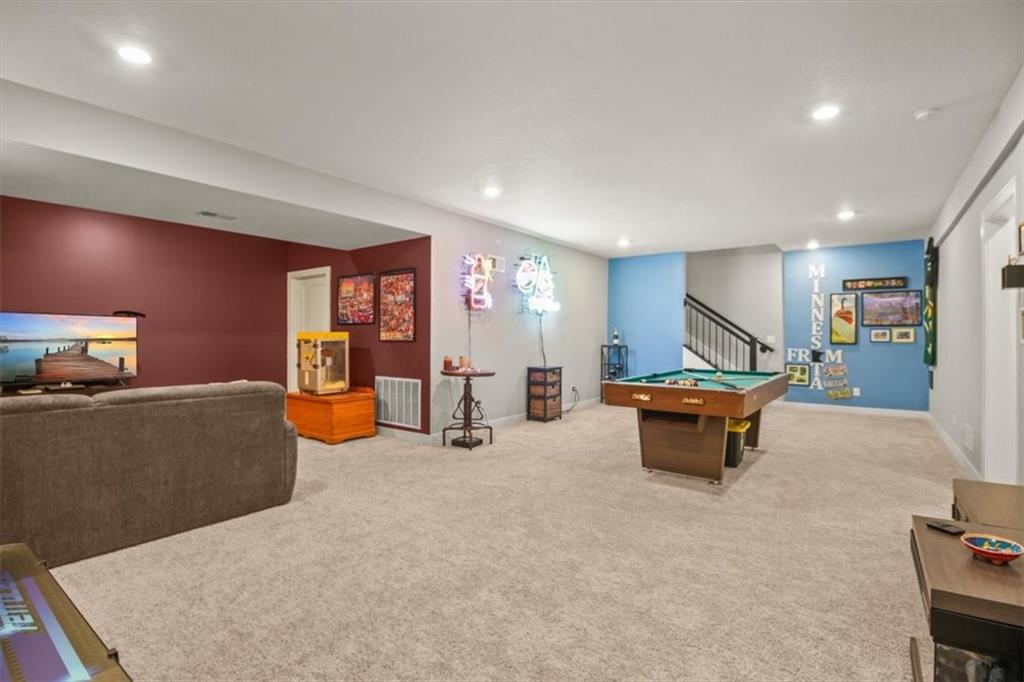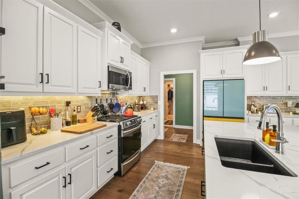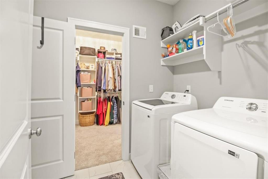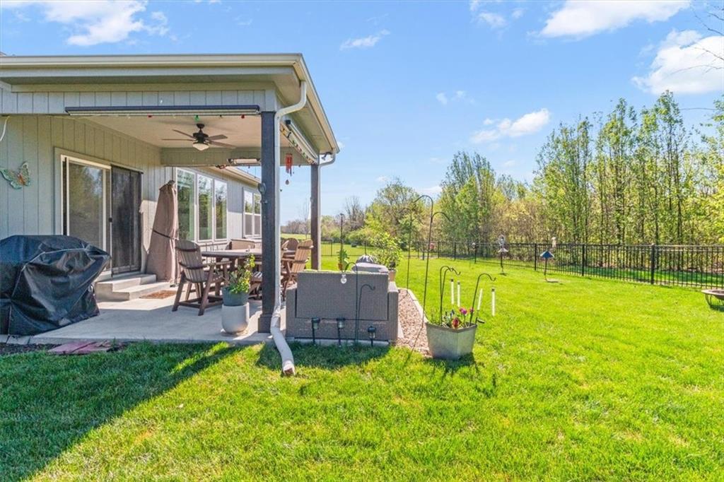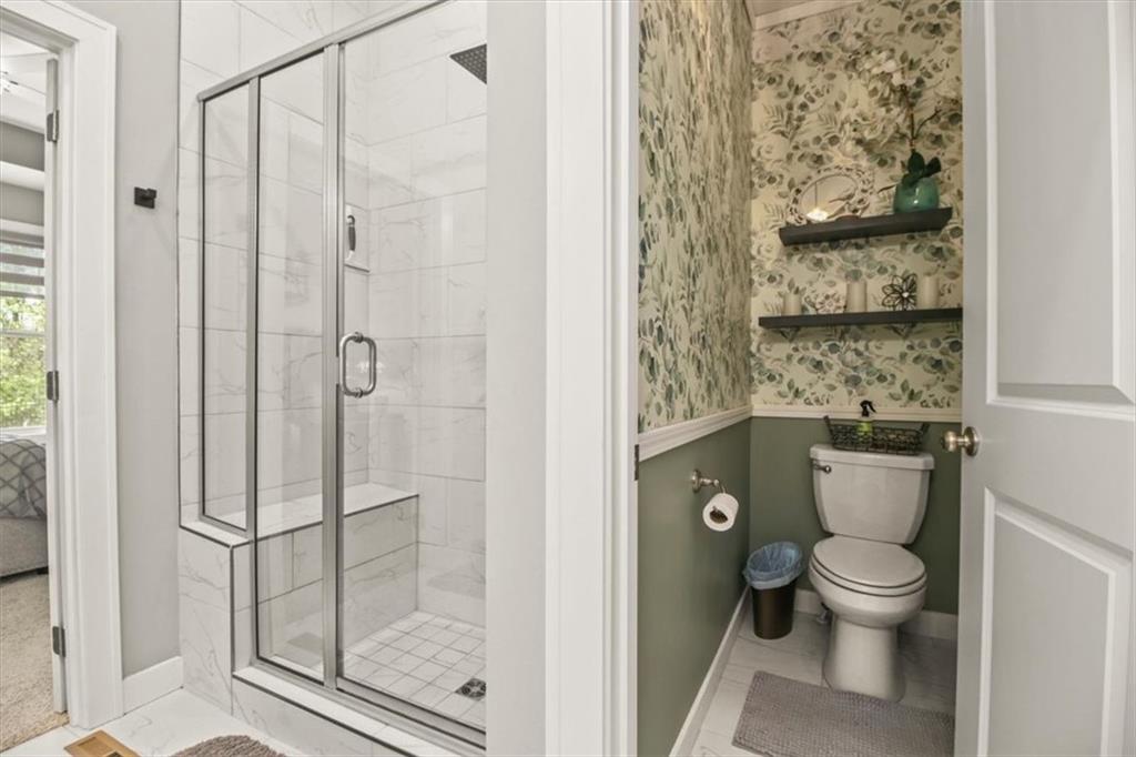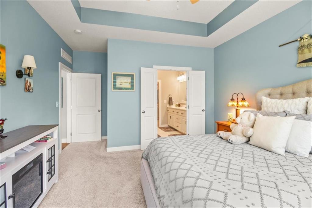 A stunning reverse 1.5-story home nestled on a private, treed lot with no direct rear neighbors. Built in 2022, this 4-bedroom home (including 2 on the main level) features a luxurious main-level primary suite with beautiful tile finishes, dual vanities, and a spacious walk-in closet with direct access to the laundry room for added convenience. Offering over 2,700 sq ft of thoughtfully designed open living space, the home is complete with granite countertops and high-end finishes throughout. The light-filled main level showcases an open-concept design with rich hardwood floors and a striking stone fireplace accented by custom built-ins. The designer kitchen serves as the centerpiece, featuring a gas range, upgraded countertops, an oversized island, walk-in pantry, and abundant cabinetry for exceptional storage. Step outside to enjoy peaceful outdoor living on the covered, extended patio overlooking mature trees and green space—providing a level of privacy and tranquility rarely found in the neighborhood. The finished lower level expands your living space with two additional bedrooms, a full bath, a generous recreation area perfect for entertaining or guests, and ample unfinished storage space. Seller upgrades further enhance the home, including professional landscaping with added trees, a fully fenced yard, custom blinds, and a custom front door that adds standout curb appeal. Ideally located near parks, lakes, shopping, dining, and with quick highway access, this home offers the perfect blend of modern comfort and everyday convenience.