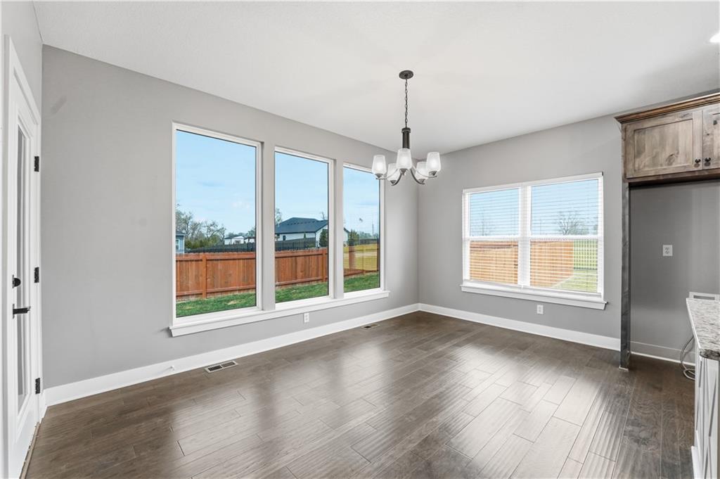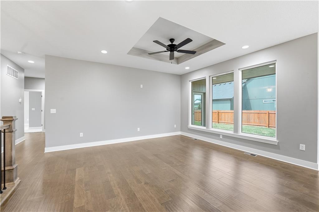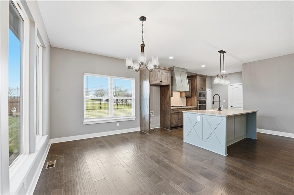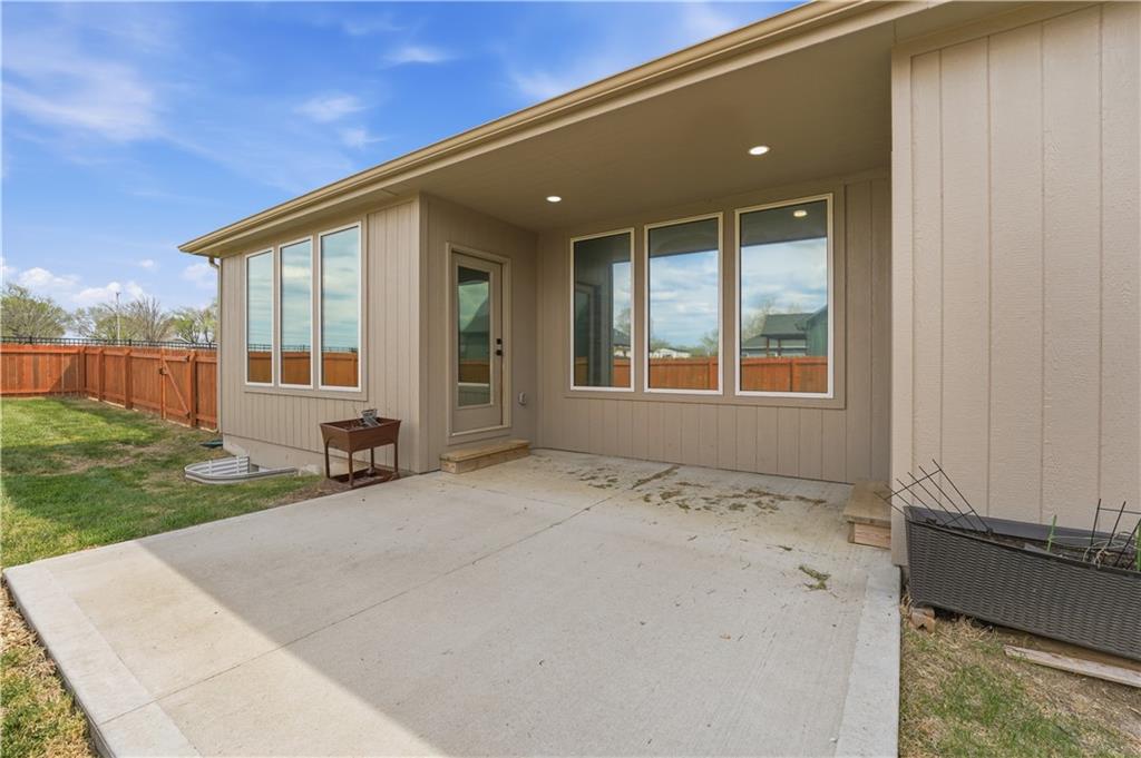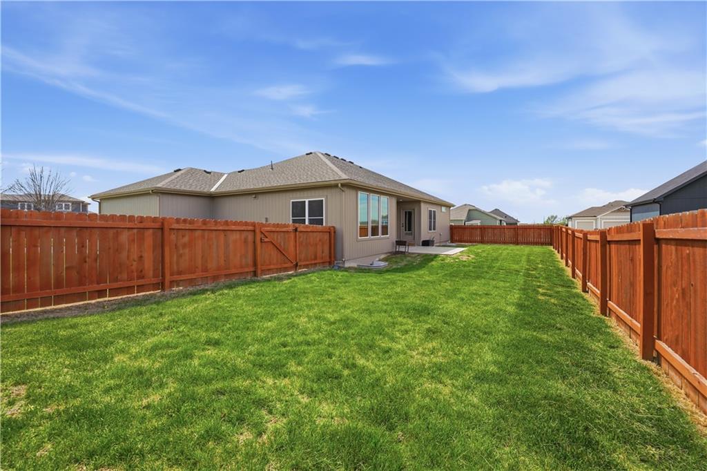 New construction ranch in Harrisonville’s premier neighborhood! This thoughtfully designed floor plan offers a country feel and sits on a large corner lot. Hardwood floors run throughout the kitchen, dining, living, hallways, and laundry room. The kitchen features a built-in oven and microwave, custom vent hood, large island with farmhouse sink, pull-out trash, soft-close cabinets, and bar seating. Walk-in pantry plus built-in shelving by the garage entry with bench, coat hooks, and shoe storage. Dining area includes floor-to-ceiling windows and access to covered patio. Living room offers 10’ ceilings with boxed detail and floor-to-ceiling windows for abundant natural light. Private primary suite features vaulted ceiling and patio access. Primary bathroom includes double vanities, walk-in shower, and large walk-in closet. Two additional bedrooms with ample closet space. Main-level laundry with linen storage. Ceiling fans in all bedrooms and living room. Oversized 3-car garage with openers. High-efficiency furnace and water heater, plus thermal tilt-in windows. Beautiful large yard with sidewalks along front and west side. Subdivision amenities include private lake and walking trails connecting to city park, lake, and golf course. A must see!