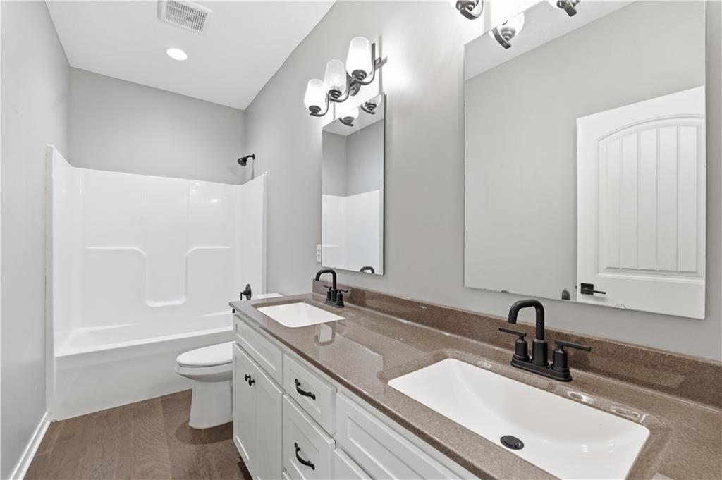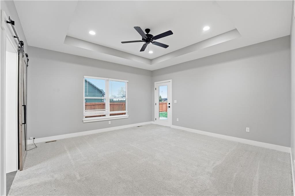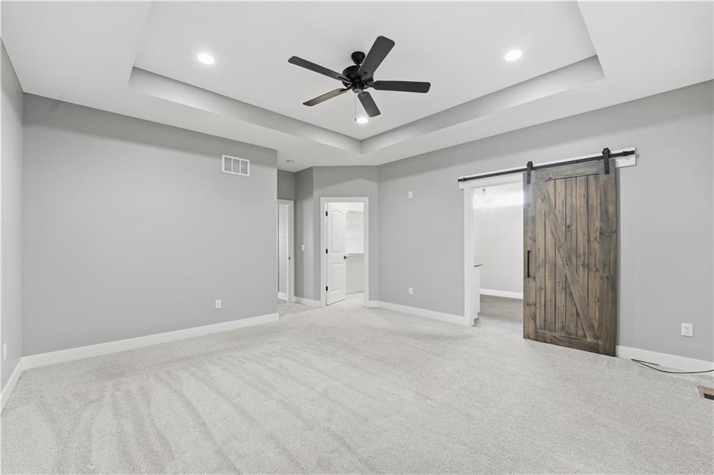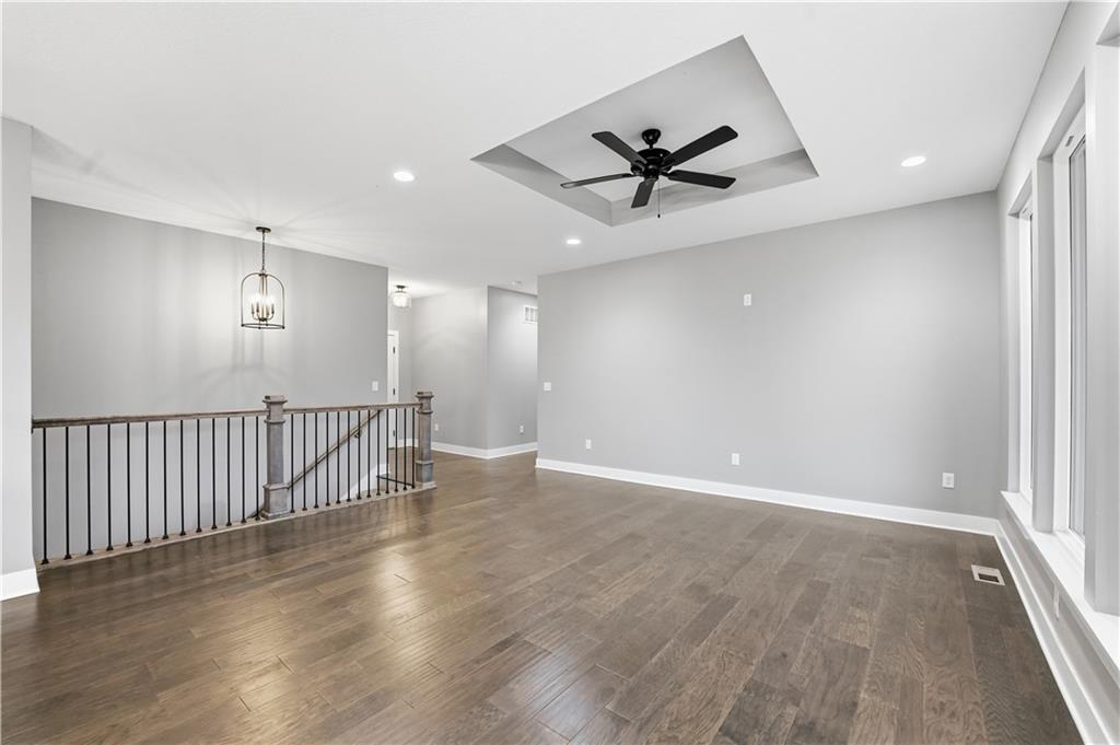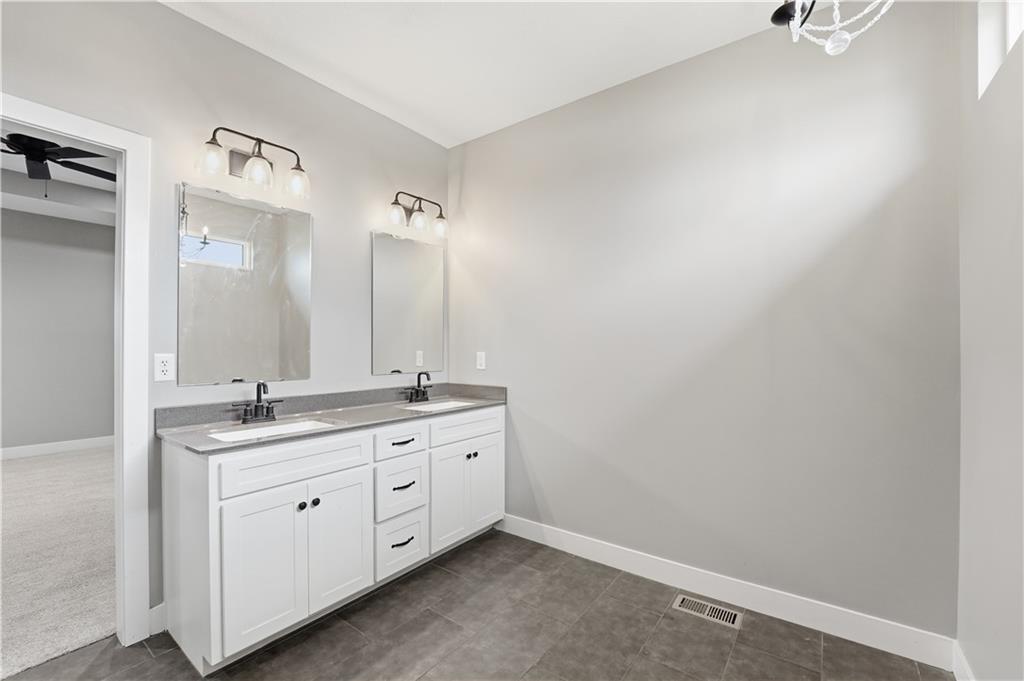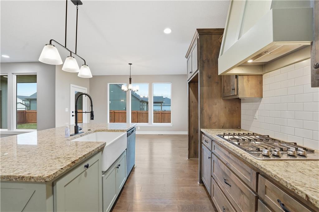 New construction ranch in Harrisonville’s premier neighborhood! This thoughtfully designed floor plan offers a country feel and sits on a large corner lot. Hardwood floors run throughout the kitchen, dining, living, hallways, and laundry room. The kitchen features a built-in oven and microwave, custom vent hood, large island with farmhouse sink, pull-out trash, soft-close cabinets, and bar seating. Walk-in pantry plus built-in shelving by the garage entry with bench, coat hooks, and shoe storage. Dining area includes floor-to-ceiling windows and access to covered patio. Living room offers 10’ ceilings with boxed detail and floor-to-ceiling windows for abundant natural light. Private primary suite features vaulted ceiling and patio access. Primary bathroom includes double vanities, walk-in shower, and large walk-in closet. Two additional bedrooms with ample closet space. Main-level laundry with linen storage. Ceiling fans in all bedrooms and living room. Oversized 3-car garage with openers. High-efficiency furnace and water heater, plus thermal tilt-in windows. Beautiful large yard with sidewalks along front and west side. Subdivision amenities include private lake and walking trails connecting to city park, lake, and golf course. A must see!
