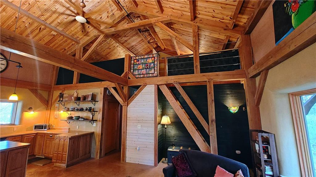 12 year-old Net-Zero Custom-Built Timber Frame Home on 27+ Private Acres with Stocked Pond Energy Independence, Privacy, Woods, Water, and Pasture — 12 miles from Lawrence: timber-frame home sits 500 feet off the road on 27+ acres overlooking the Buck Creek Valley. Designed for efficiency and built with the highest quality materials, it offers a rare combination of sustainability, recreation, and proximity to town. Durability and comfort are hallmarks of this home. You really must experience this home first-hand! 10 acres fenced pasture (high-tensile 4-wire electric fencing) 17 wooded acres with mature oak, hickory, walnut & hedge and over 1 mile of private hiking trails Stocked largemouth bass pond Pond aeration system installed 2025 Home positioned halfway up the hill for protection and views The Home: 1,550 sq ft PLUS 500 sq ft covered porch Traditional timber-frame construction (white oak) 2 bedrooms + flexible loft space (office/guest/yoga/studio) 20’ ceiling peak in open living area Large kitchen with island Zero-entry walk-in shower Straw bale exterior walls (R-40) Structural insulated panel roof (R-40) Andersen casement windows Standing-seam metal roof Mitsubishi mini-split heat pump (new coil 2025) Pacific Energy Alderlea wood stove Complete architectural plans available Natural materials create exceptional indoor air quality and a calm, grounded feel Net-Zero Solar Energy: Installed in 2018 Produces 8,500–9,000 kWh annually, historically exceeds total household usage Inverter replaced March 2024 Water & Infrastructure 8,000-gallon rainwater cistern Pump house/workshop Whole-house filtration system (spin-down, carbon/sediment, UV, optional chlorinator) Outbuildings 11' x 18' workshop / pumphouse 15’ x 45’ pole barn (3 bays) 16’ x 32’ pole barn (2 bays) Converted 15' diam. grain bin with concrete floor, electricity, lighting & exhaust fan 13 mi. to Perry Lake Marina 23 mi. to Clinton Lake Marina