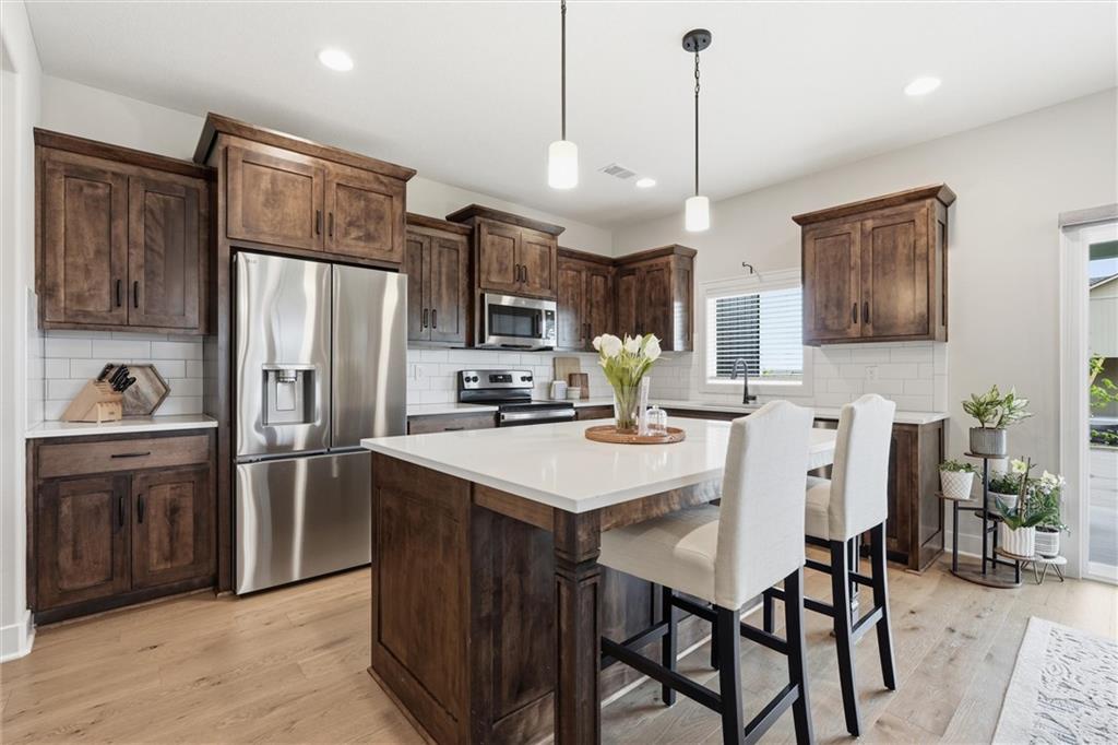 Perfectly Beautiful and READY FOR YOU! This is a good one! Built in 2023 but now EVEN BETTER!!. Blinds, all SS appliances, washer and dryer and the mounted TV are all staying! Maintenance provided makes this an easy decision. Move right in and begin your new life with 4 pools, walking trails, weight room, volleyball, pickleball, basketball and more. This perfectly designed floor plan welcomes you inside to an open spaces. Warm wood floors are throughout the main level. The spacious main floor living area adjoins the eat in kitchen and dining so gatherings are open for family conversations. A mudroom and a walk in panty are just off the kitchen with the gorgeous wood cabinets. Beautiful countertops, back splash and the large kitchen island complete this dreamy kitchen. Upstairs you will find an oversized primary bedroom with an architectural wall and spectacular primary bath with a double vanity, a soaker tub and separate tile shower and walk in closet. 3 other spacious bedrooms or a potential office is just down the hall with laundry and your 3rd bath with another double vanity and built ins. Full unfinished basement for your future expansion or storage. Come see! You wont be disappointed. Beautiful neighborhood and incredible location just south of 159th and Murlen. Be sure to watch the video!