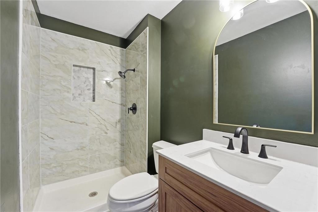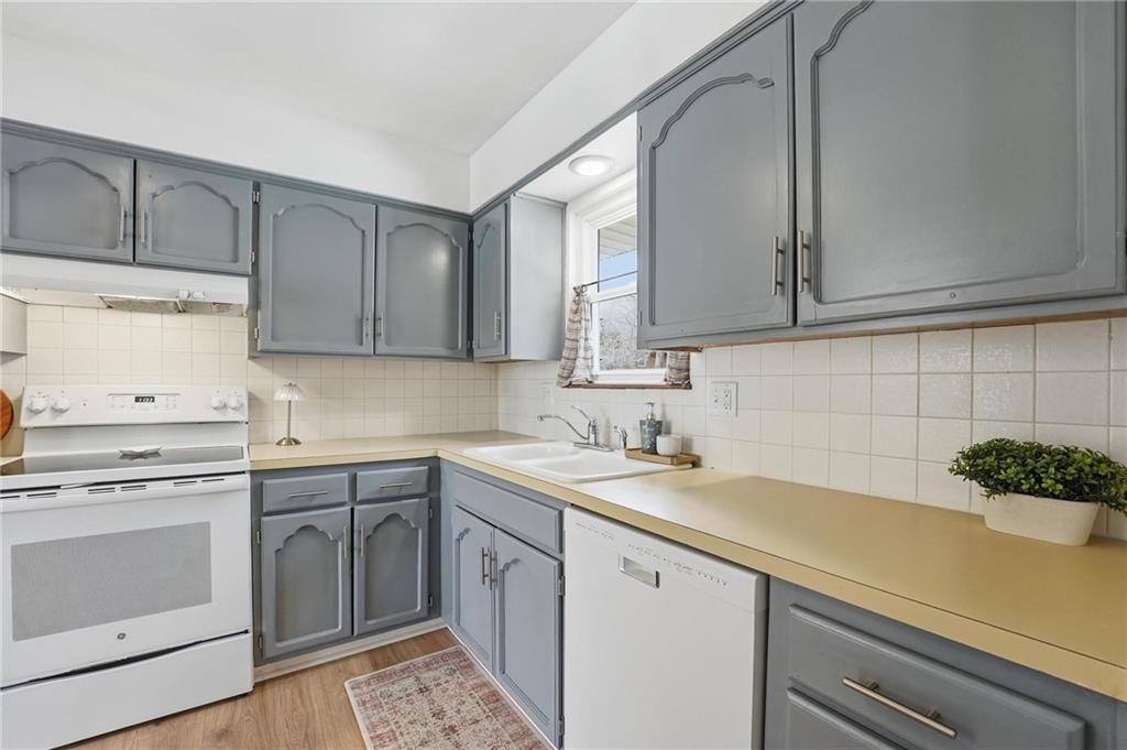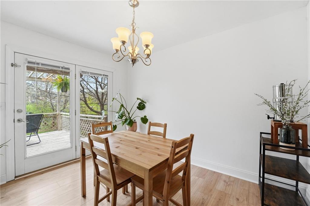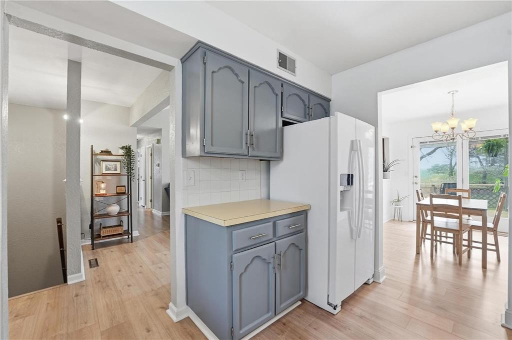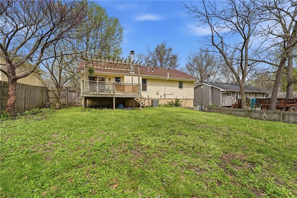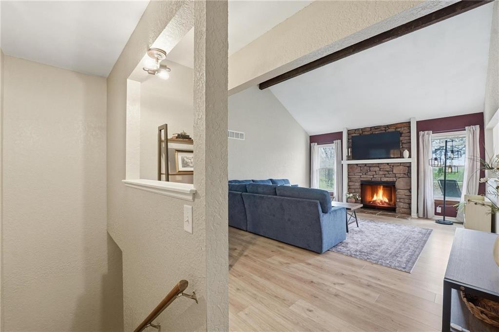 This stunning raised ranch home has been beautifully updated with modern luxury vinyl plank flooring, new carpeting, a new roof, a tiled primary bathroom shower, and fresh paint throughout. Upon entering, you'll notice the high ceilings and wooden beam accents that create a spacious atmosphere, warmly complemented by a charming stone fireplace. The layout seamlessly flows into a dining room featuring a back door that leads to the deck. The kitchen is equipped with ample cabinetry and smart counter space for all your culinary needs. Down the hallway, you will find a coat closet, linen closet, a full bathroom with a large vanity and a shower over the tub, and three cozy bedrooms at the end of the hall, each adorned with plush carpeting. The primary bedroom offers generous space and a stunning ensuite, complete with a new tiled shower, vanity, and mirror. The finished basement includes a recreation room and a laundry room with fantastic storage, including storage shelves that stay. The two car garage provides access to the basement, featuring space for a coat rack and additional storage behind the shutter doors in the recreation room. The back deck, accessible from the dining room via the back door, overlooks a fenced backyard that backs up to trees, creating a serene retreat. This home is situated in a quiet cul-de-sac within the North Kansas City School District, with Staley High School as the designated attendance school.