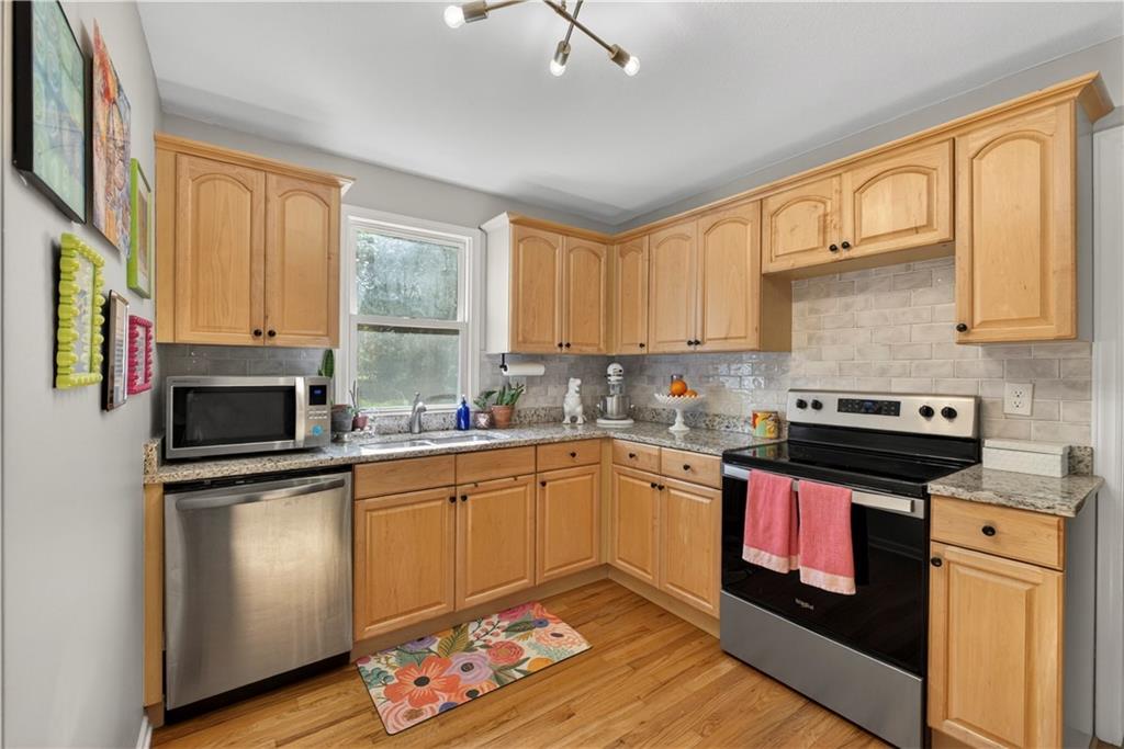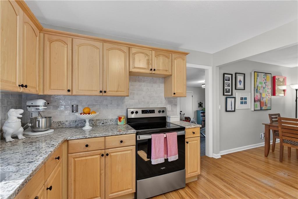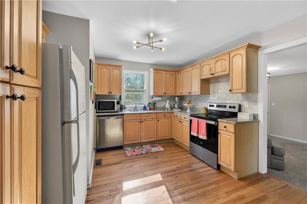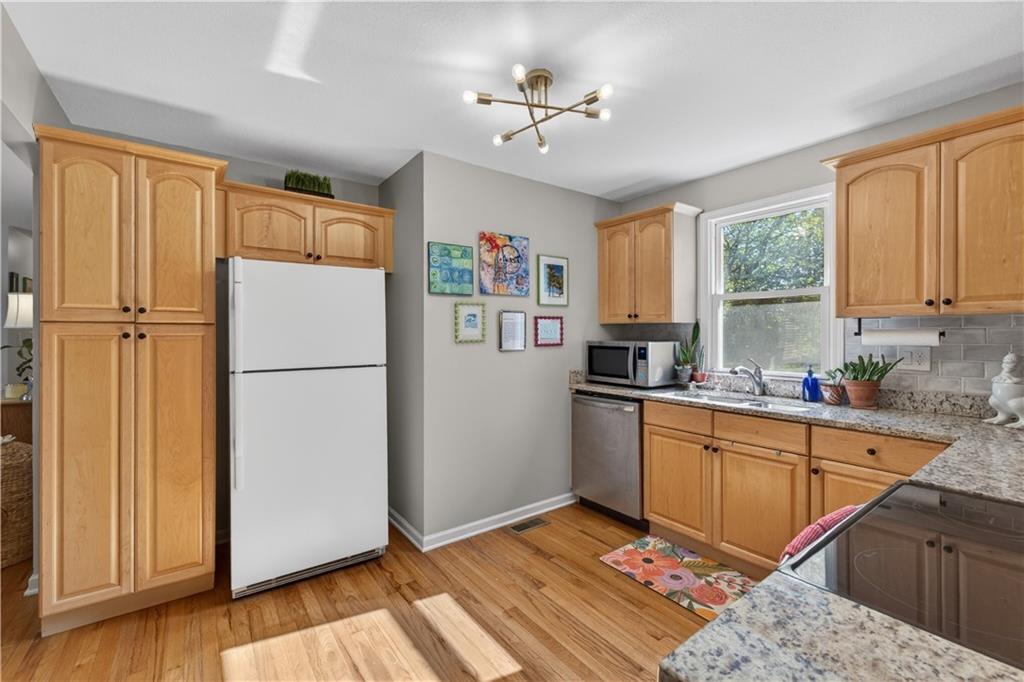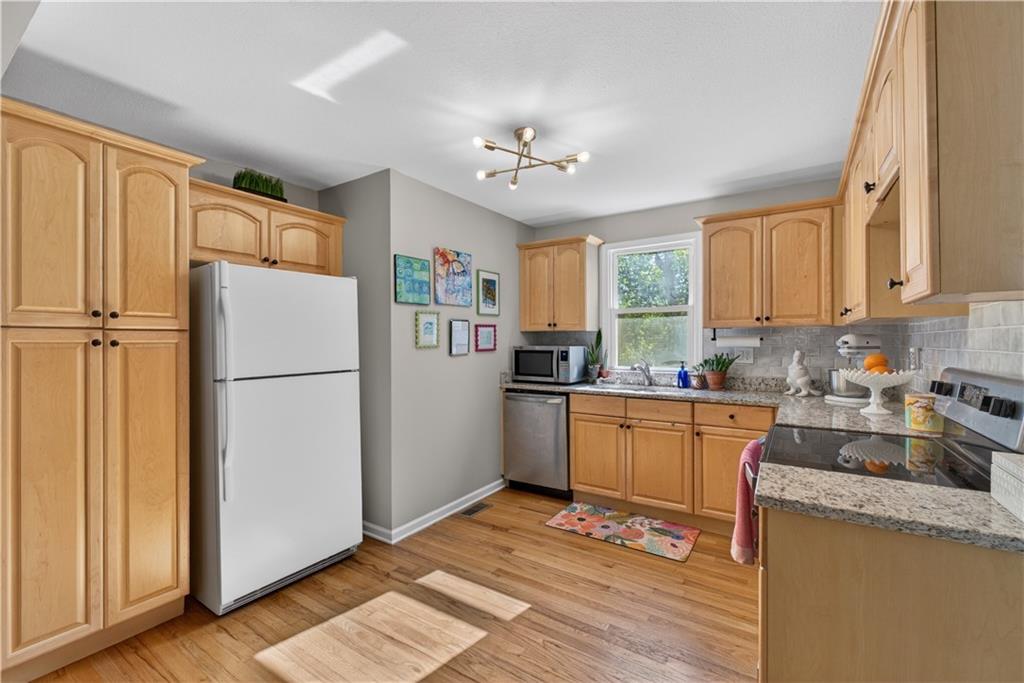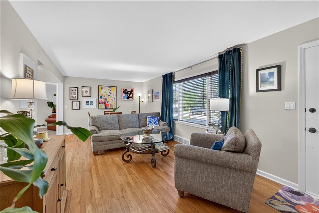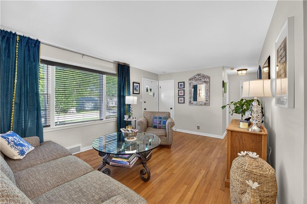 Turn-key, stylish, and packed with updates—this beautifully renovated ranch in Glenwood Heights is ready to impress! From the moment you arrive, you’ll notice the fresh landscaping, inviting curb appeal, and pride of ownership throughout. Inside, refinished hardwood floors and abundant natural light create a warm, welcoming feel. The updated kitchen is a standout with granite countertops, custom cabinetry, stainless steel appliances, and an open flow to the living room and breakfast nook—perfect for entertaining or everyday living. Just off the kitchen, the cozy family room features new carpet and provides convenient access to the backyard, garage, and lower level. All bedrooms offer hardwood floors and great closet space, while the fully remodeled bathroom shines with herringbone tile flooring, a quartz vanity, and a beautifully tiled shower/tub combination. Step outside to a private, fully fenced backyard with a concrete patio—ideal for relaxing evenings, pets, or gatherings. The unfinished basement provides excellent storage and future finishing potential, with major system updates already completed for peace of mind. Located in the highly sought-after Shawnee Mission School District, this home offers quick access to nearby parks and trails like Roe Park and Sapling Grove Park, along with convenient shopping, dining, and grocery options just minutes away. Easy highway access makes commuting a breeze. A perfect blend of location, updates, and livability—this one is a must-see!
