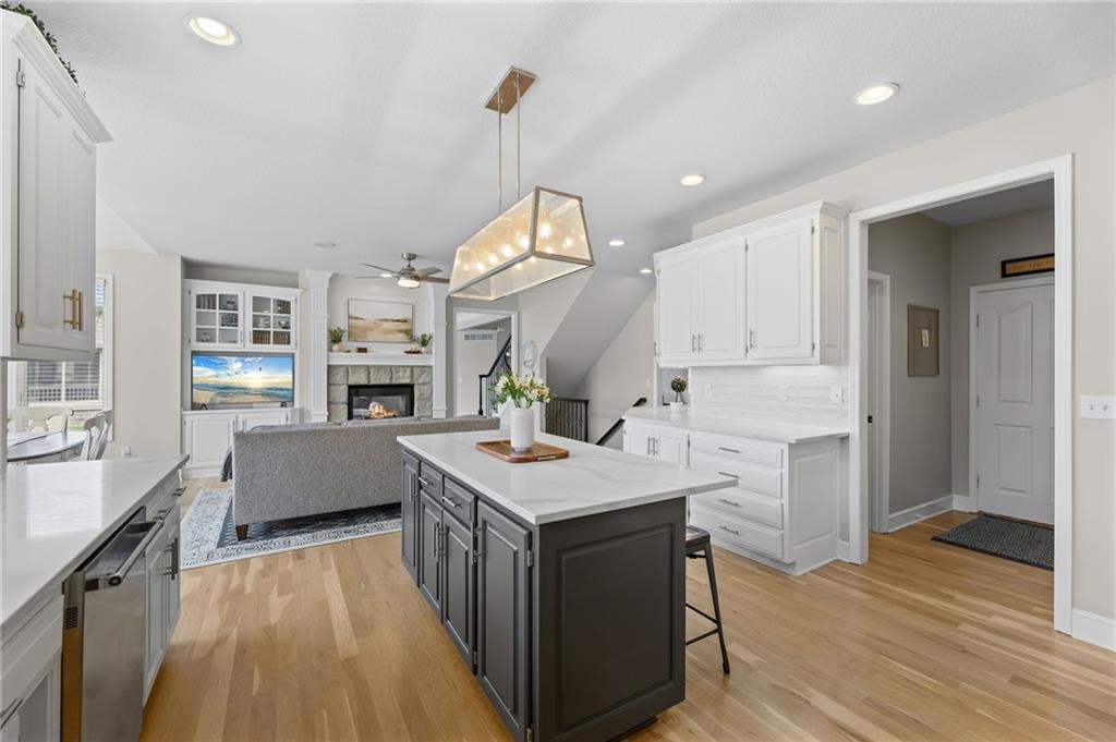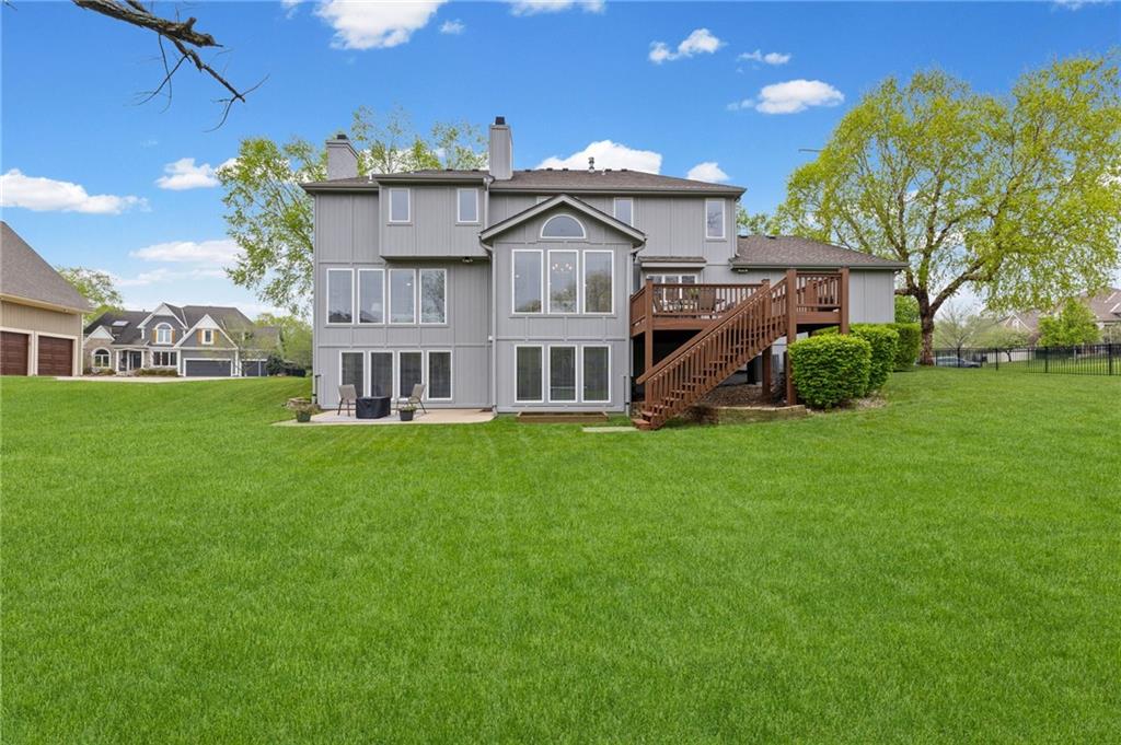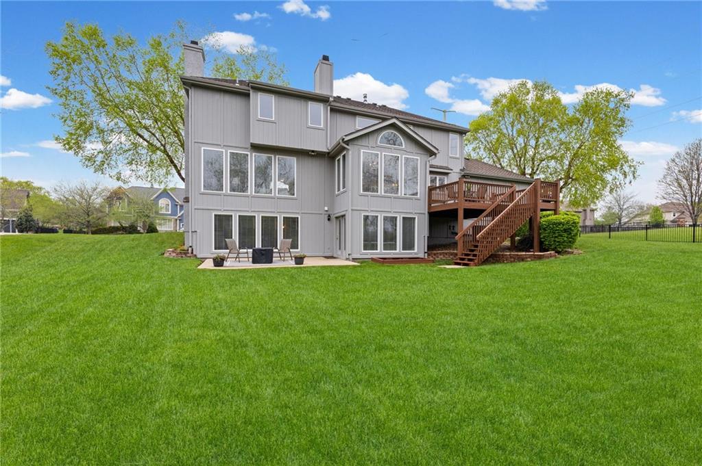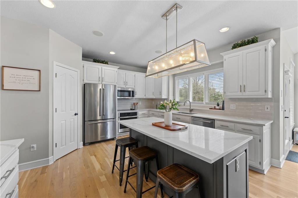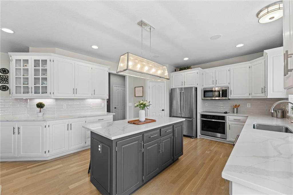 Stunning Remodeled Two-Story in Prime Wellington Park Location Welcome to this beautifully updated two-story home nestled in the highly sought-after Wellington Park community. Lovingly renovated inside and out, this residence combines timeless elegance with modern upgrades, offering exceptional living spaces for today’s lifestyle. Step inside to discover newly installed hardwood floors, fresh interior paint, and plush new carpeting throughout the main level. The heart of the home is the incredible chef’s kitchen, featuring newly painted cabinetry, gorgeous Calacatta quartz countertops, a stylish tile backsplash, a walk-in pantry, and brand-new stainless steel appliances. The adjoining hearth room showcases a striking two-sided fireplace shared with the formal living room, creating a warm and inviting atmosphere. A formal dining room, dedicated home office, and convenient main-level laundry room complete the first floor. Upstairs, you’ll find four spacious bedrooms and three full bathrooms, including a luxurious primary suite. This private retreat boasts a coffered ceiling, a separate sitting room with its own fireplace—perfect for a study or relaxation space—and a spa-like en-suite bath with dual vanities, a jetted tub, and an enormous walk-in closet. The finished walkout lower level is filled with natural light from large windows overlooking the lush backyard. It offers a generous recreation room ideal for entertaining, along with a bonus non-conforming fifth bedroom, perfect for guests, a home gym, or additional office space. Enjoy outdoor living on the expansive deck that overlooks the private, beautifully landscaped yard. Located within the award-winning Blue Valley School District and just minutes from premier shopping, dining, and major highway access, this home offers both luxury and convenience. Don’t miss this exceptional opportunity to own a move-in-ready home in one of the area’s most desirable neighborhoods!