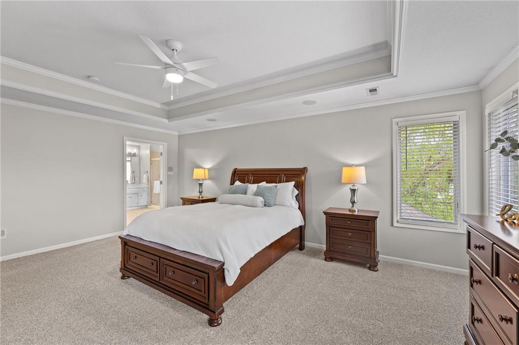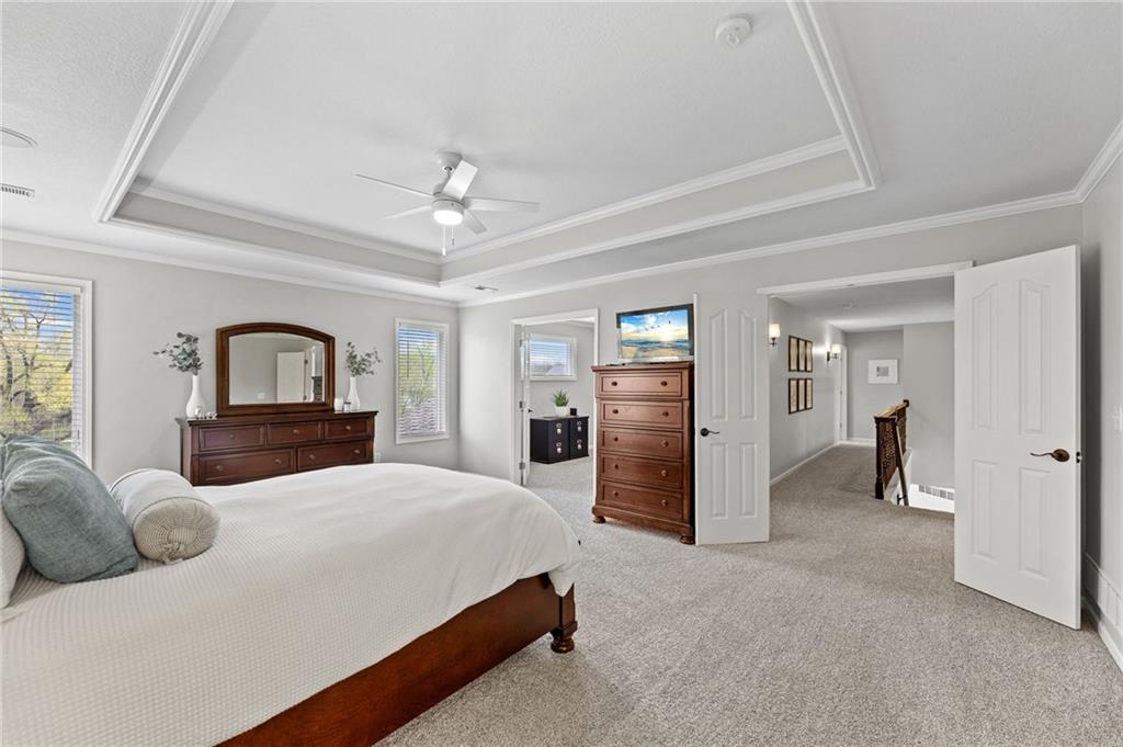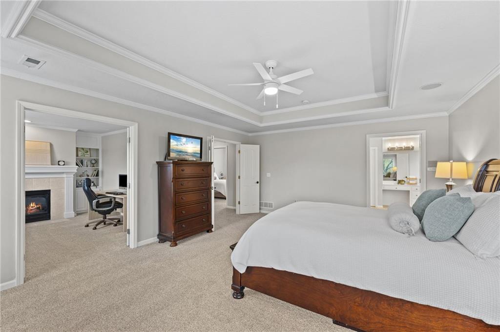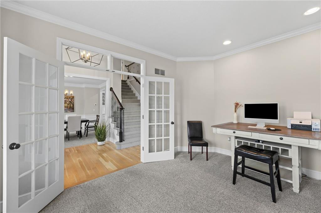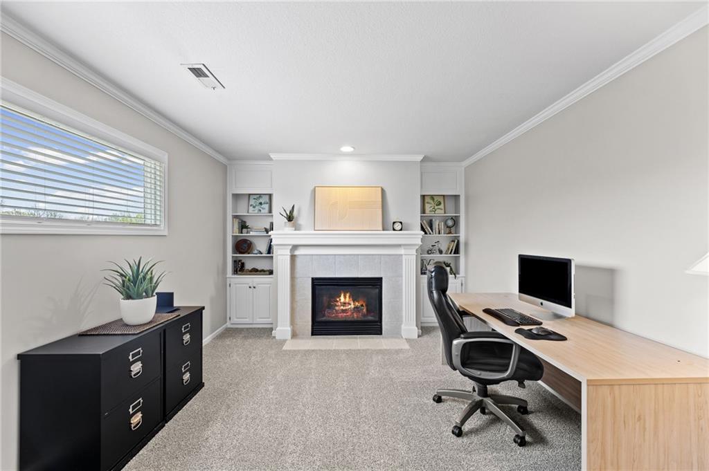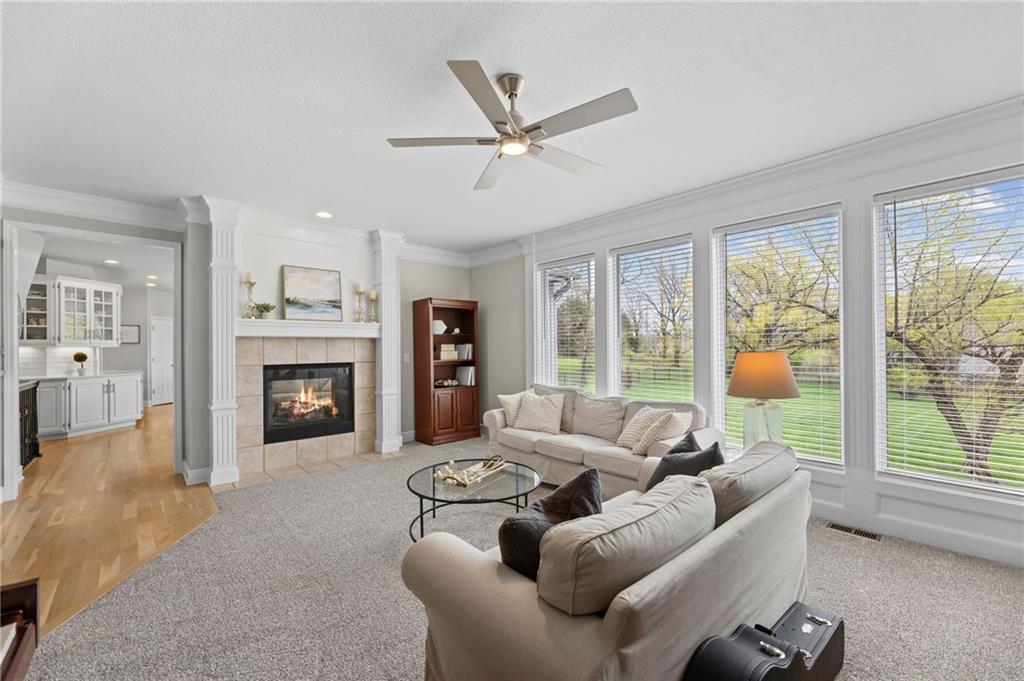 Stunning Remodeled Two-Story in Prime Wellington Park Location Welcome to this beautifully updated two-story home nestled in the highly sought-after Wellington Park community. Lovingly renovated inside and out, this residence combines timeless elegance with modern upgrades, offering exceptional living spaces for today’s lifestyle. Step inside to discover newly installed hardwood floors, fresh interior paint, and plush new carpeting throughout the main level. The heart of the home is the incredible chef’s kitchen, featuring newly painted cabinetry, gorgeous Calacatta quartz countertops, a stylish tile backsplash, a walk-in pantry, and brand-new stainless steel appliances. The adjoining hearth room showcases a striking two-sided fireplace shared with the formal living room, creating a warm and inviting atmosphere. A formal dining room, dedicated home office, and convenient main-level laundry room complete the first floor. Upstairs, you’ll find four spacious bedrooms and three full bathrooms, including a luxurious primary suite. This private retreat boasts a coffered ceiling, a separate sitting room with its own fireplace—perfect for a study or relaxation space—and a spa-like en-suite bath with dual vanities, a jetted tub, and an enormous walk-in closet. The finished walkout lower level is filled with natural light from large windows overlooking the lush backyard. It offers a generous recreation room ideal for entertaining, along with a bonus non-conforming fifth bedroom, perfect for guests, a home gym, or additional office space. Enjoy outdoor living on the expansive deck that overlooks the private, beautifully landscaped yard. Located within the award-winning Blue Valley School District and just minutes from premier shopping, dining, and major highway access, this home offers both luxury and convenience. Don’t miss this exceptional opportunity to own a move-in-ready home in one of the area’s most desirable neighborhoods!