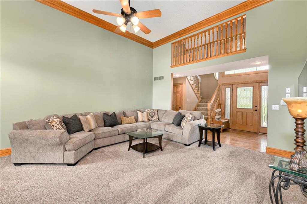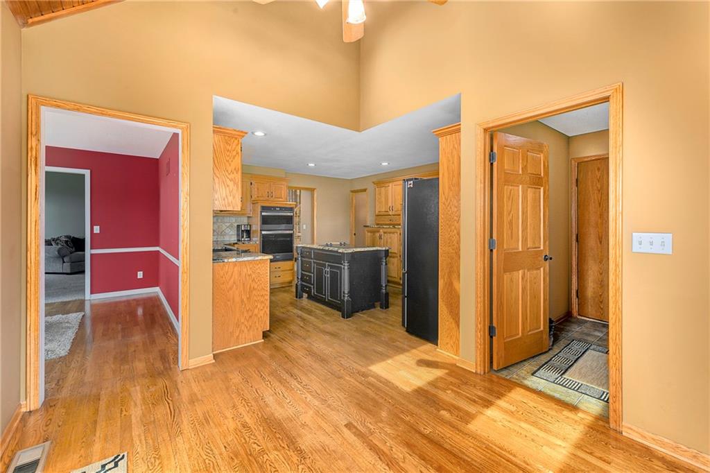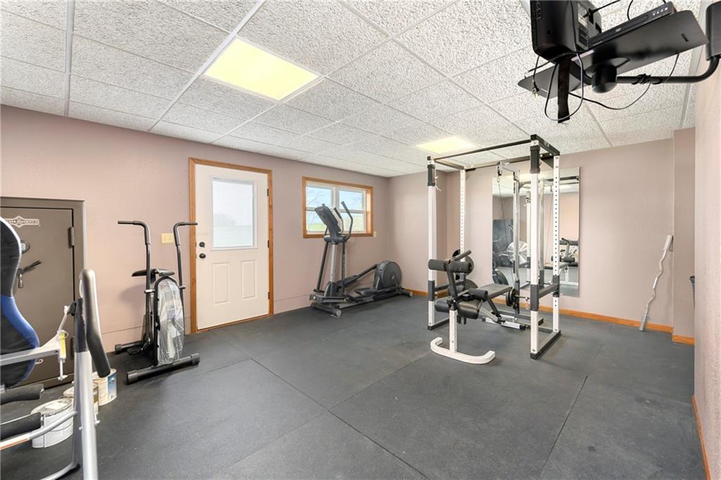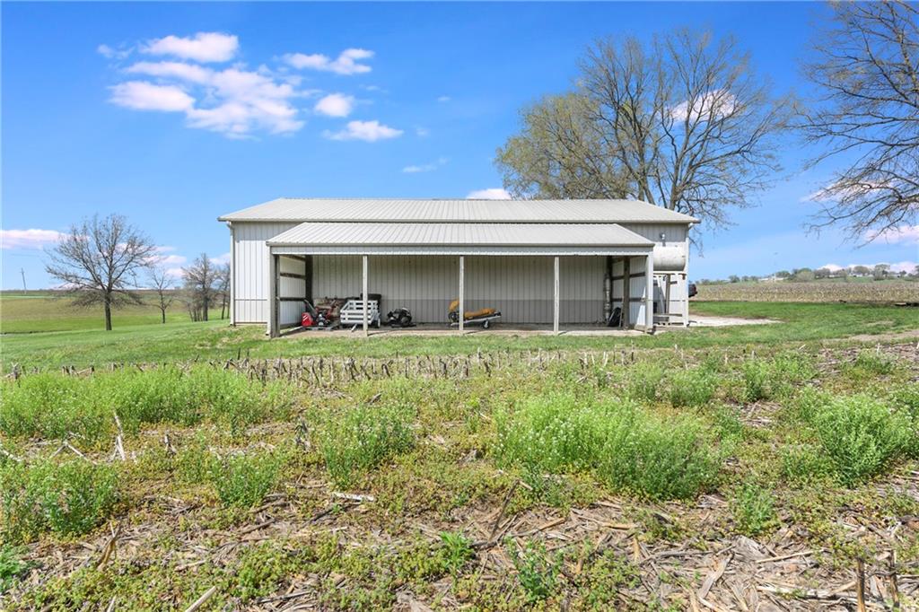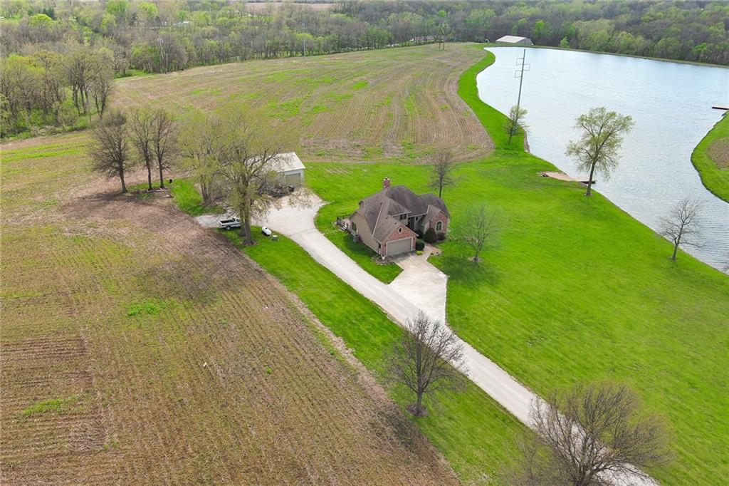 Escape to the peace of the countryside in this custom built home on 24 acres. A fully stocked pond with Bass, Crappies, Perch, Bluegill, and Catfish provides the perfect place to relax while watching the sun set. The entry opens to a large great room with heat circulating wood burning fireplace and 13' ceilings with beautiful crown moulding. There are two dining areas (one is currently being used as an office). The kitchen has many cabinets, pantry, island with cooktop, Granite countertops, tile backsplash, and wood floor. The primary suite is large and includes the following amenities - a double vanity, shower, whirlpool tub, linen closet, and walk-in closet. The two upstairs bedrooms are generous size with a shared bathroom. There is an office that could be converted into another bedroom/play area/craft room - the options are endless. There is a storage area above the garage off one of the bedrooms. The finished walk-out lower level has so much to offer with large family room, gym/exercise room (could be converted into a bedroom), full bath (with walk-in closet for guests), storage area (16.11x11.6), and 3rd car garage (14.3x11.2). The home was remodeled in 2008 with new vinyl siding, windows, roof, granite countertops, & refinished hardwood floors. The 60x40 outbuilding includes 100amp electrical service, insulated interior, concrete floor, water, radiant heat, pegboard/workbench, large overhead door for RV, & BONUS - 9,000 lb vehicle lift. There is a lean-to (40x12.6) on the back of the outbuilding. Located just a little under 10 minutes from I-70, this property offers the perfect balance of rural privacy and convenient access to town and Kansas City. Inspections welcome but selling "AS IS". The two gas tanks on the East side of the outbuilding are not staying.