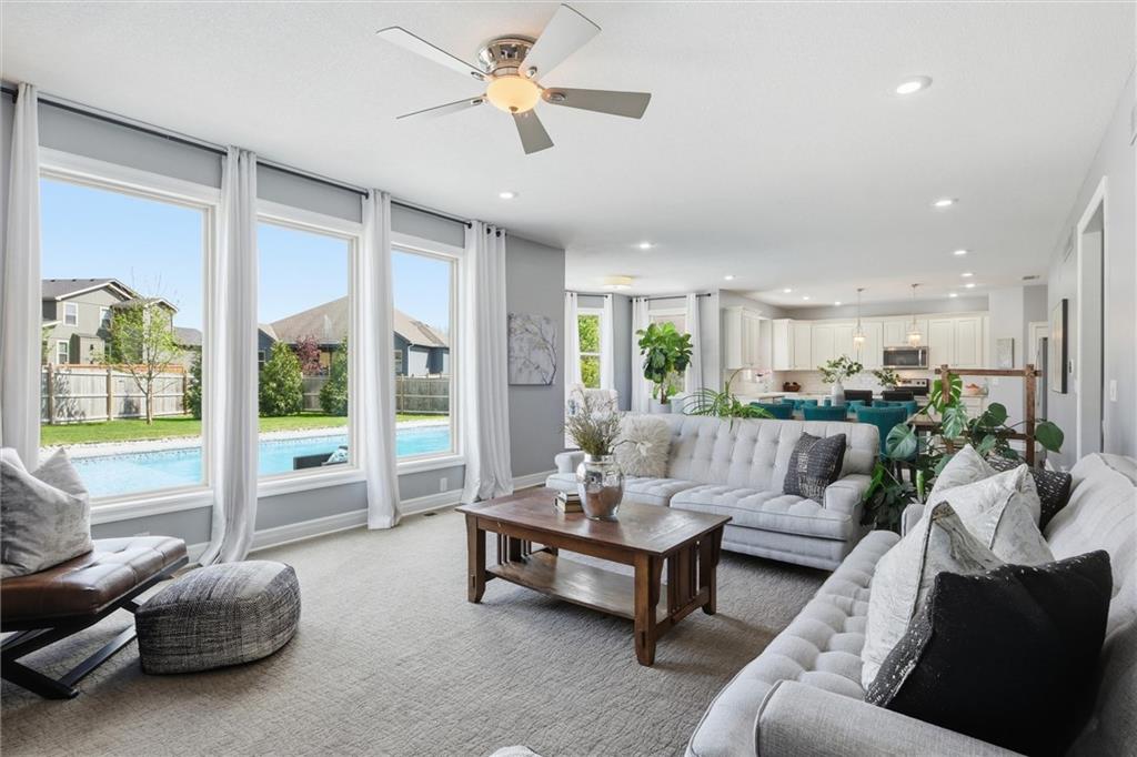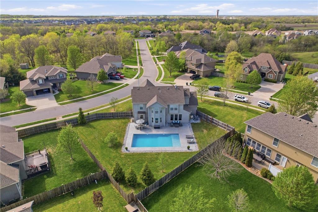 Welcome HOME to this beautiful two-story home in the sought-after Megan Valley neighborhood in Gardner Kansas! With 5 bedrooms, 3.5 bathrooms, and a 3-car garage, this home offers the perfect blend of space, function, and charm. Step inside to a grand entry with a versatile formal dining room ideal for dining, a home office, or music room. The great room is full of character, featuring a stunning tiled fireplace, custom built-ins, and a wall of windows overlooking the incredible backyard oasis. The heart of the home is the open kitchen, hearth, and dining area, perfect for gathering and everyday living. You’ll love the bright kitchen with granite countertops, island, farmhouse sink, stainless steel appliances, and a spacious walk-in pantry. Rich wide-plank wood floors flow throughout the main level, along with a convenient half bath for guests. Upstairs, the primary suite is a true retreat with a large en suite bath including a soaking tub, separate shower, private water closet, and a generous walk-in closet. A second bedroom offers its own private bath, while bedrooms three and four share a full bath. The spacious laundry room provides added storage and functionality. The finished basement offers the best of both worlds with a fifth bedroom and additional unfinished area ready for storage or future expansion. Situated on a large corner lot, the backyard is truly the showstopper featuring a beautiful patio and in-ground pool, perfect for summer days and making lifelong memories.