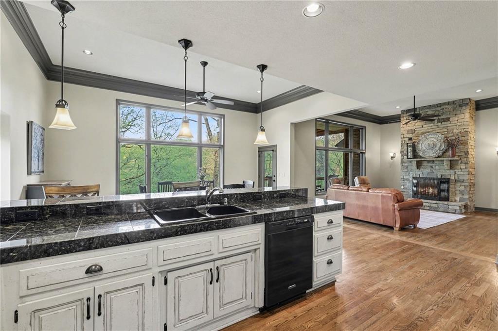 Stunning custom-built home where thoughtful design meets breathtaking views—come for the house, stay for the scenery. The chef’s kitchen is a showstopper with hardwood floors, custom cabinetry, granite tile countertops, a breakfast bar with seating, and stylish pendant lighting. The breakfast area features soaring ceilings, walls of windows, and access to the covered, screened-in porch—perfect for relaxing mornings or evenings. The inviting Great Room offers beautiful views of the treed backyard, upgraded trim, and a striking stone fireplace. The grand entry welcomes you with a vaulted ceiling, updated lighting, and tiled flooring. The primary suite is a retreat with bayed windows, a tray ceiling, and ceiling fan. The spa-like bath includes a double vanity with custom cabinetry, tiled floors, and a walk-in tiled shower. A secondary bedroom on the main level offers flexibility as a guest room or office. The large laundry room adds convenience with cabinetry and a sink. The lower level features a spacious living area with a corner fireplace and access to another covered deck, along with two generously sized bedrooms, a full bath, and a non-conforming bonus room. The next level is perfect for entertaining with a massive rec room, wet bar, and additional full bath. Walk out to the private, landscaped backyard and enjoy the serene, wooded setting year-round. Additional highlights include storage space under the two-car garage and a dedicated workshop area. This home truly has it all—space, function, and incredible views.