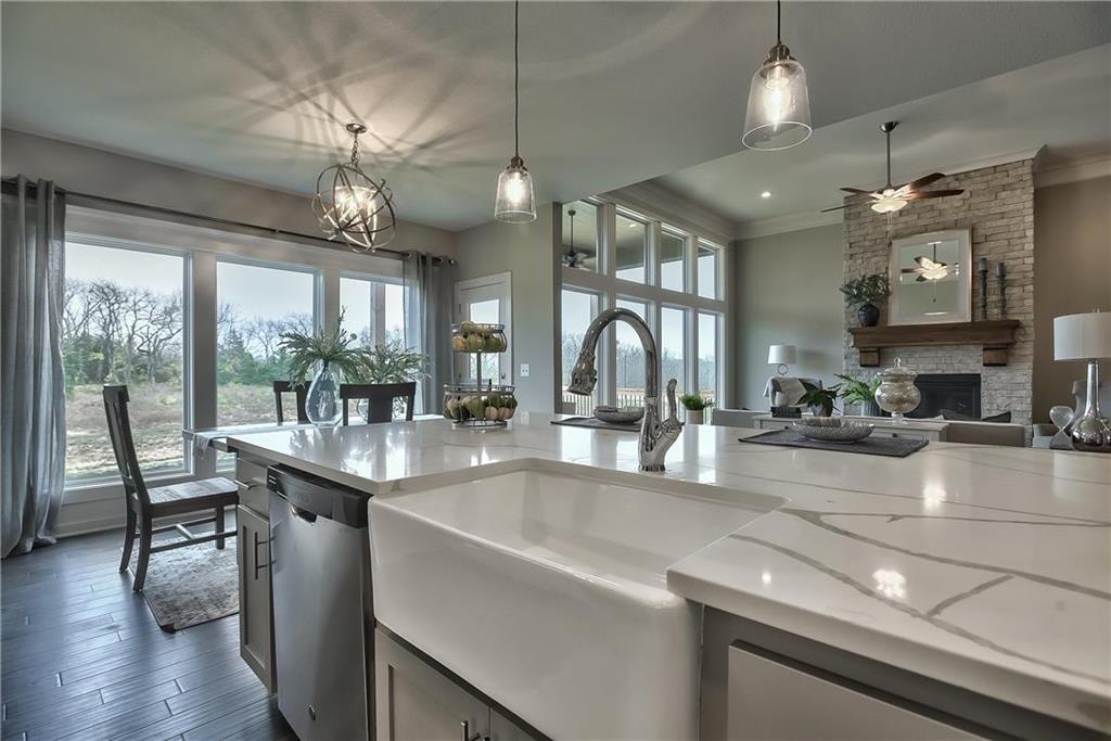 Want some privacy? This Dakota reverse sits on a beautiful walk out lot backing to trees. Nice hardwood floors run throughout the entry, great room, dining area, kitchen and mud room. The great room includes a stunning fireplace and wall of windows giving you lots of natural light. Walk out from the dining area to a wonderful covered deck with a peaceful view of the treed backyard and greenspace. Center island kitchen with granite countertops is a cook's delight featuring an apron sink, custom cabinets with cabinet hood, upgraded cabinet hardware with soft closing drawers & doors, built in microwave, undercabinet lighting, stainless appliances and a large walk in pantry. The owner's suite with its vaulted ceiling and wall of windows leads into a lovely bath with separate granite vanities, walk in tiled shower, separate tub and walk in closet. Laundry room is connected to the master bath for your convenience. The second bedroom on the main floor is a great multipurpose room for a guest room, craft room, office, etc. ice sized mud room with large boot bench,, coat closet and a 3/4 bath just off the back hallway. Follow the U-shaped staircase down to the rec room with wet bar and plenty of room for a home theater plus a game table. Walk out from the rec room to enjoy the private backyard. Two more bedrooms and bath complete the finished lower level. Lots of storage in the unfinished basement. Storm room included for your safety in case of a storm. Three car garage and sprinkler system. Prairie Farms has a great community pool, play area and walking trails. It's a great place to call home.
