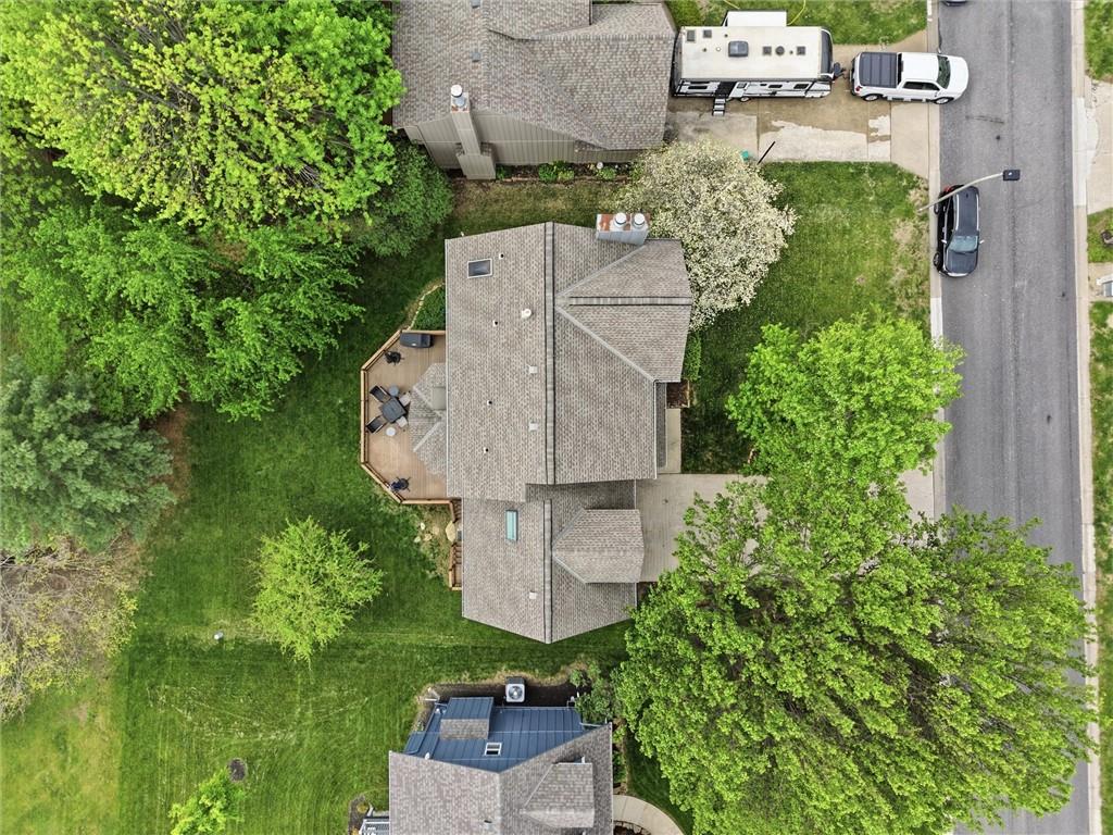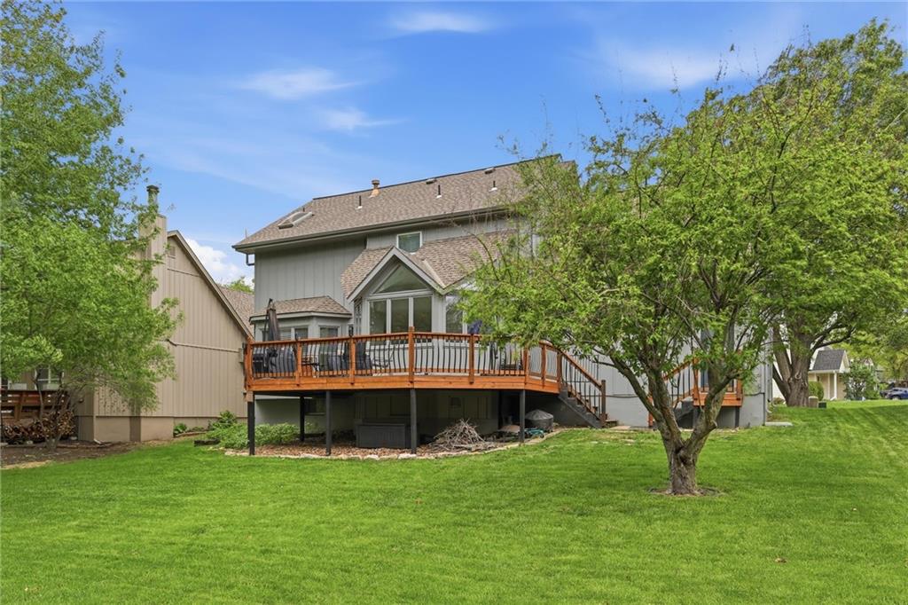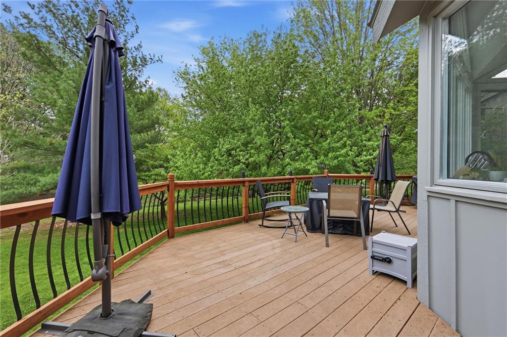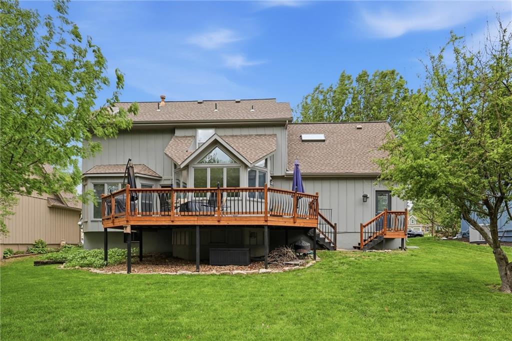Welcome to Brookwood in Lenexa—where location meets lifestyle! Ideally situated with quick highway access, abundant nearby shopping & just minutes from the Lenexa City Center, this beautifully renovated home truly checks all the boxes. Lovingly updated by the current owners, nearly every surface has been thoughtfully refreshed. The show-stopping kitchen is sure to impress, featuring stainless steel appliances, a gas range with hood, a massive center island with quartz countertops & a stunning mix of stained wood cabinetry on the island paired with crisp white shaker cabinets along the perimeter. A charming bay window, bar area with a beverage center & floating shelves, and updated lighting complete the space. The adjacent dining area offers plenty of room to gather and is highlighted by a chandelier. Refinished hardwood floors flow throughout most of the main level, where you’ll also find a spacious carpeted living room with a fireplace and built-in shelving. The updated powder bath features a new vanity, mirror, lighting, and a shiplap accent wall. Step outside to the large deck that is set up with gas lines for a grill and firepit—perfect for entertaining & enjoy the privacy this lot provides. There is a greenbelt behind the house! Upstairs, you’ll find three generously sized secondary bedrooms, all with ceiling fans, including one with an incredible walk-in closet. The primary suite features a tray ceiling, a fireplace, dual closets, and a beautifully remodeled bathroom with a spa-like custom tiled shower, double vanity, updated lighting, mirrors & a full tile backsplash. The secondary full bathroom has also been updated with a stylish vanity, hexagon tile flooring, and newer fixtures. Convenient second-floor laundry makes everyday living easy. The finished lower level adds even more living space, complete with a wine closet and additional storage. This is a fantastic opportunity to own a move-in ready home in one of Lenexa’s most desirable areas—don’t miss it!
