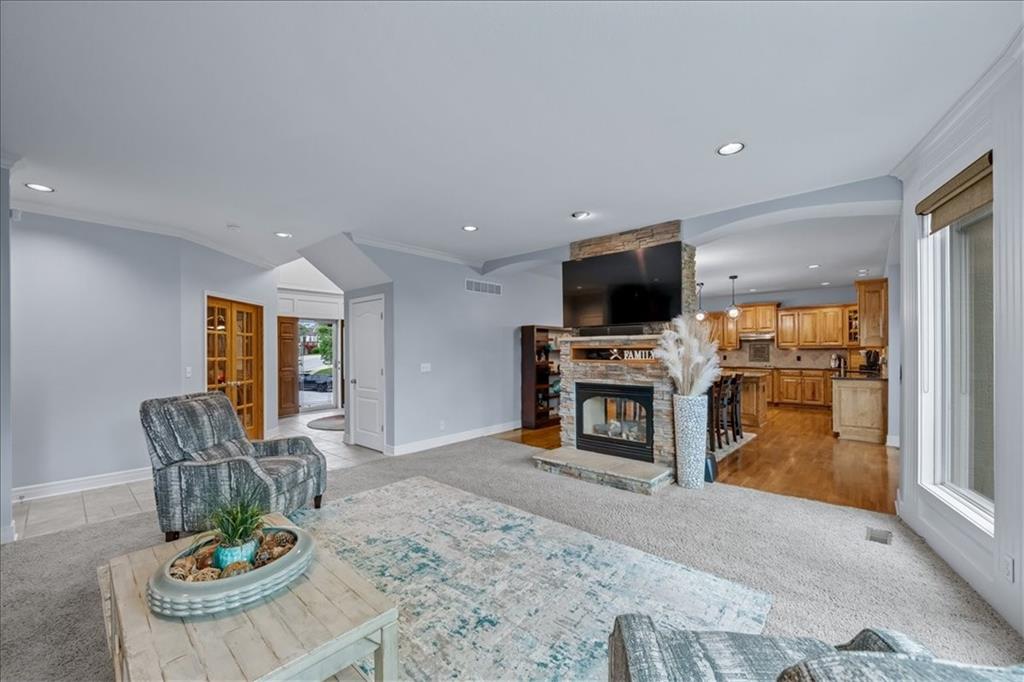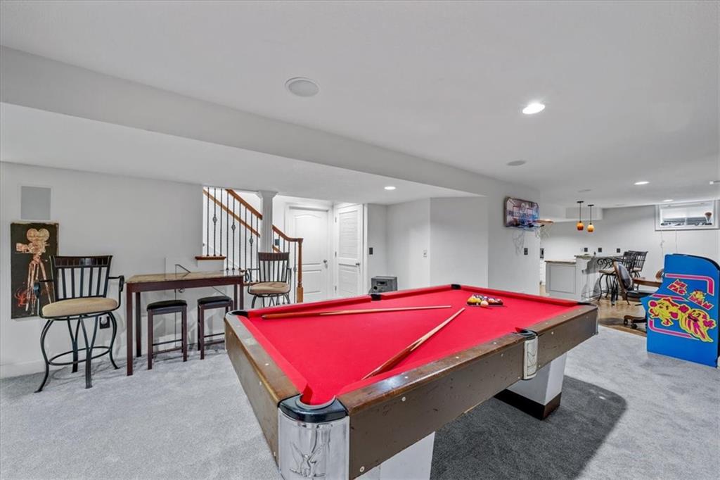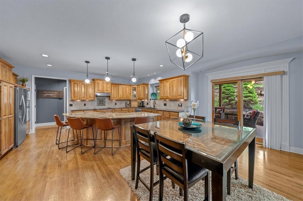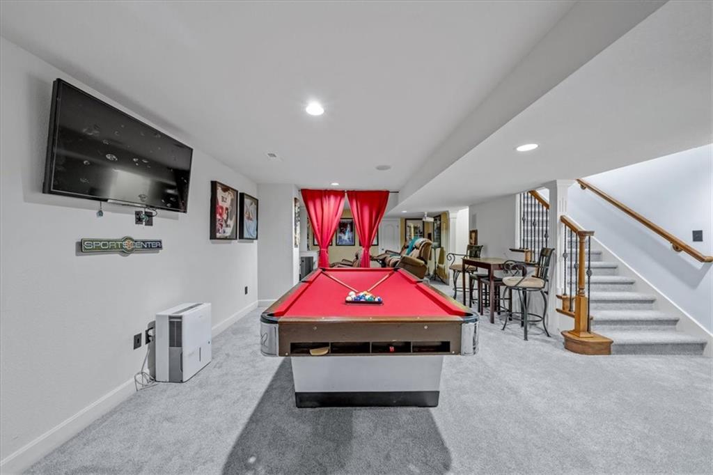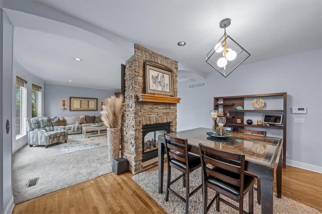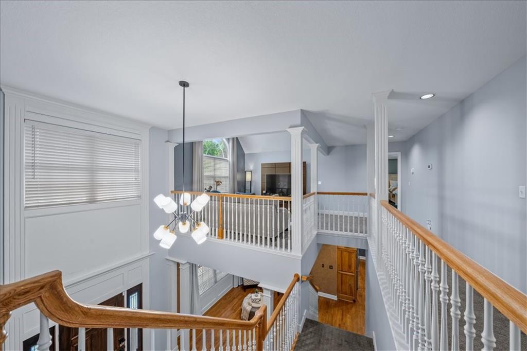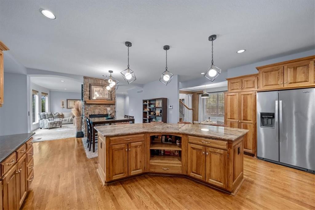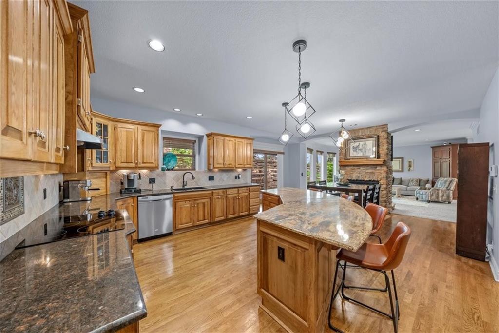 Gorgeous home loaded with upgrades, tucked at the end of a quiet cul-de-sac. Striking curb appeal with cedar accents and a full brick front porch sets the tone. Inside, refinished hardwoods and exotic granite countertops elevate the main level, complemented by a stunning see-through stone fireplace connecting the hearth room and living space. The spacious primary suite is a true retreat, featuring a massive walk-in closet, heated travertine floors, and a jetted tub. Upstairs offers a versatile loft, while new carpet spans the main and second levels. The finished lower level is built for entertaining with a granite bar, full bath, theater area and a fifth non-conforming bedroom. Outside you'll find a covered deck with a private, retreat-like setting, plus a rare exotic ironwood deck imported from India and built to last and designed to impress. Additional highlights include a heated garage with epoxy floors, newer windows throughout, updated gutters and garage doors, fresh interior paint, stainless steel appliances and dual humidifiers. Previously owned by the builder himself, this home delivers quality, character, and thoughtful upgrades throughout. A must see to fully appreciate it.