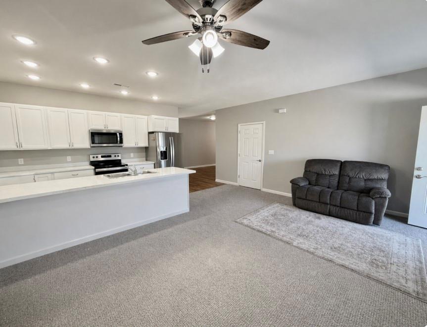 Rare find! This beautifully maintained, like-new one-level townhome offers a spacious open floor plan with 3 bedrooms and 2 full bathrooms—perfect for comfortable, easy living. Enjoy the convenience of a large attached garage featuring an oversized 18' x 8' door, ideal for taller or larger vehicles. The home includes durable laminate flooring throughout, creating a clean, modern look with low maintenance. The spacious bedrooms provide ample closet space, and you'll appreciate the abundance of storage throughout the home. All appliances and window treatments stay, making this truly move-in ready. The primary suite boasts a spacious en suite bath and a large wail-in closet. Recent upgrades add peace of mind, including a roof with a remaining 2-year warranty and energy-efficient triple-pane windows with a lifetime transferable warranty for the new owner. Designed with accessibility in mind, this home is handicap accessible and offers the ease of single-level living. Situated on the edge of town, you’ll enjoy beautiful landscaping and a quiet setting.