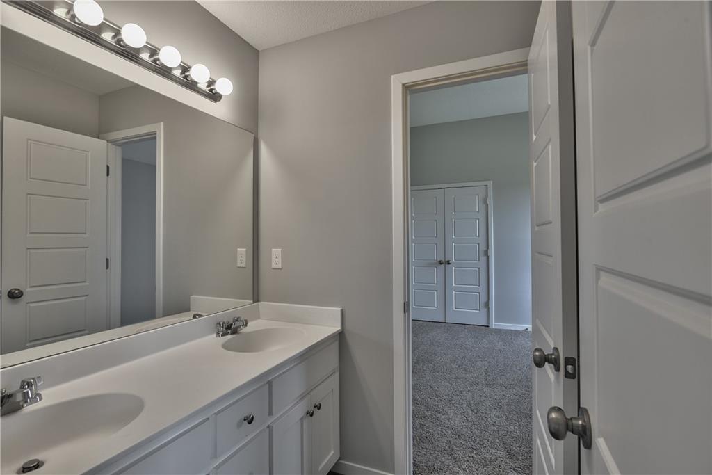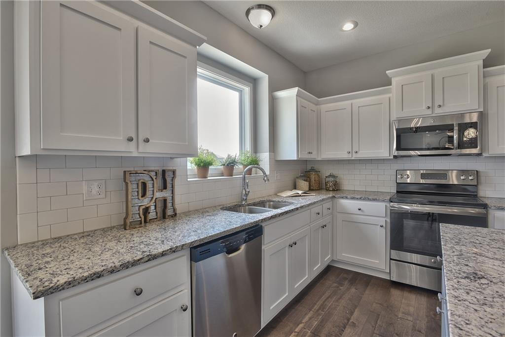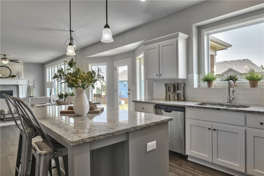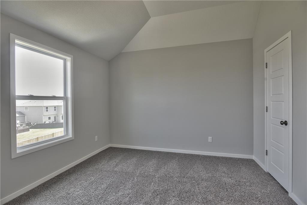 Welcome to the Paxton III by Prieb Homes. This 2 story plan begins with a wonderful front porch leading you into this open floorplan. Nice entry with U-shaped staircase is open to the formal dining room with trayed ceiling. Great room with gas fireplace enjoys the natural light streaming through the windows. The center island kitchen is sure to please, featuring granite countertops, apron sink, custom cabinets with soft close drawers & doors, upgraded cabinet hardware, cabinet hood & built in microwave, stainless appliances and a large walk in pantry. Beautiful hardwood floors run throughout the entry, kitchen, breakfast room and mud room. Walk out of the breakfast room onto the covered patio to enjoy the outdoors. Large first floor guest room with closet can be used as an office, playroom, sewing/craft room, etc. Convenient 3/4 bath is adjacent to the guest room and mud room with boot bench and entry closet. Upstairs you will find three more bedrooms, one with its own private bath. The other two bedrooms share a Jack & Jill bathroom with a large vanity & double sinks. All bedrooms have vaulted ceilings. The owner's suite is a spacious room with double doors & vaulted ceiling. The lovely bath is a quiet retreat with a tiled walk-in shower, separate tub, two separate vanities, linen closet and tile floors. Attached is a large walk-in closet leading into the laundry room which is also accessible from the hallway with built-in bookshelves. Incredible unfinished basement with tons of storage and 3/4 bath stub. Three car garage and sprinkler system. Prairie Farms is adjacent to the newly renovated Lake Olathe offering tons of outdoor activities. Large community pool, cabana, play area and walking trails. Conveniently located close to schools, shopping, grocery stores, restaurants and highways. Photos are of previous homes and may show some optional features.